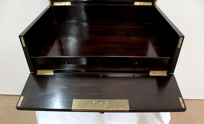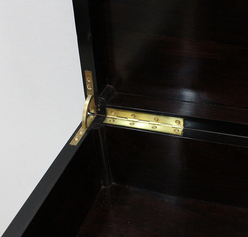 L’intérieur en Palissandre possède un espace de rangement et deux petits tiroirs avec boutons de tirage en ébène.