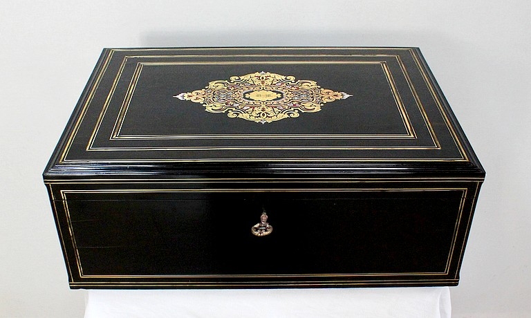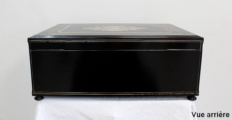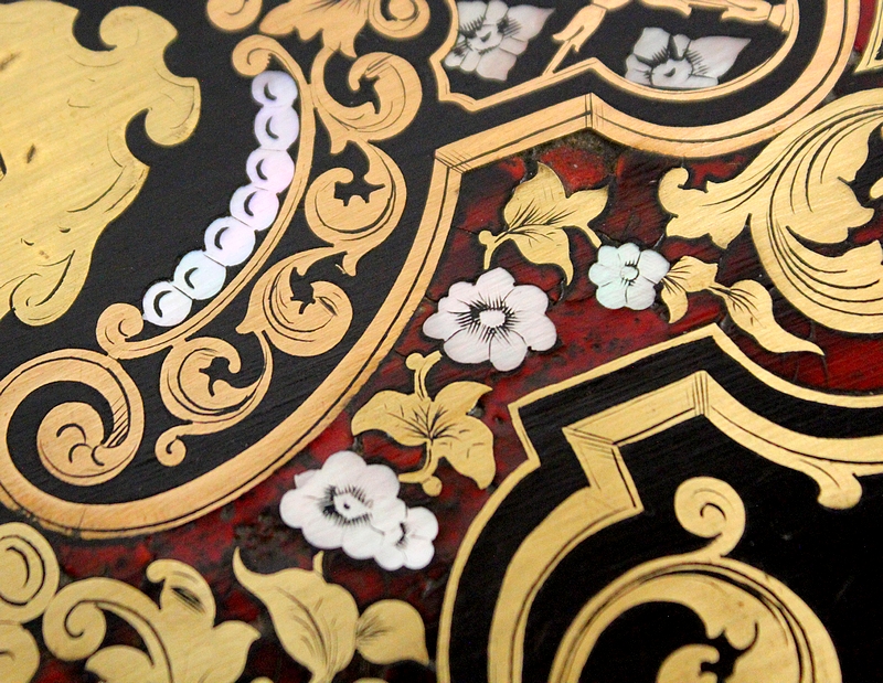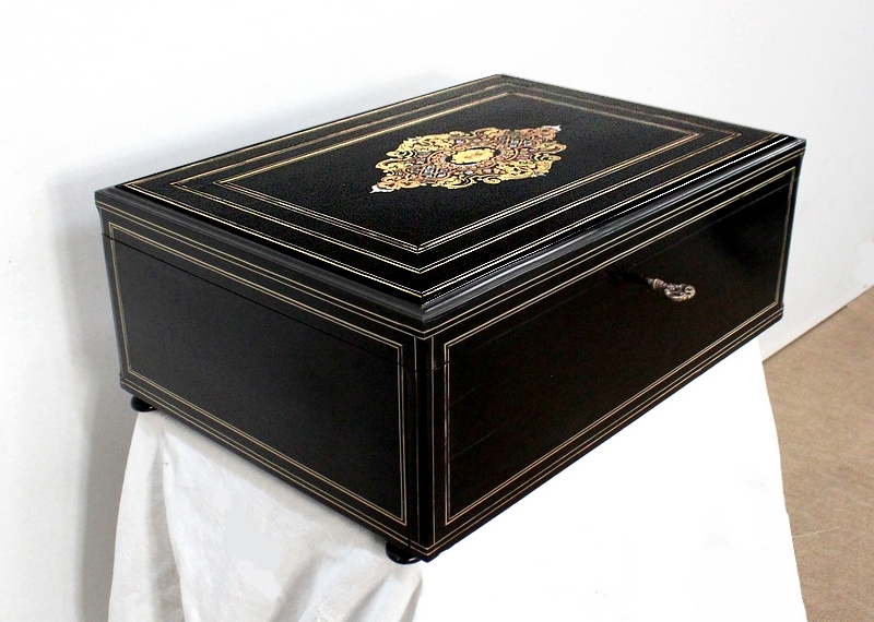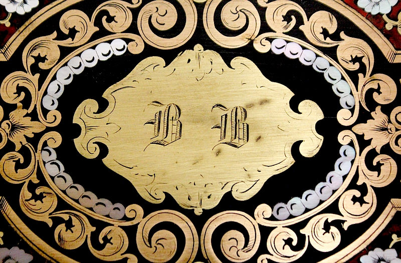 Sur le dessus, le pourtour mouluré présente une succession de trois filets de laiton qui encadrent un important motif aux incrustations de laiton, de nacre et d’écailles de tortue. Au centre, une plaque illustrée d’initiales est entourée d’arabesques, de feuilles et de fleurs s’entrelaçant.