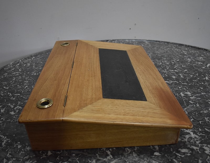 Petit écritoire pupitre en acajou blond, garni de 2 encriers. Le dessus est gainé d’un cuir noir gravé des initiales ‘R. P’ en lettres gothiques.