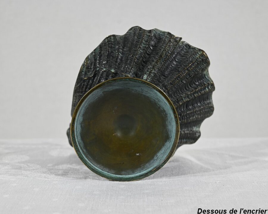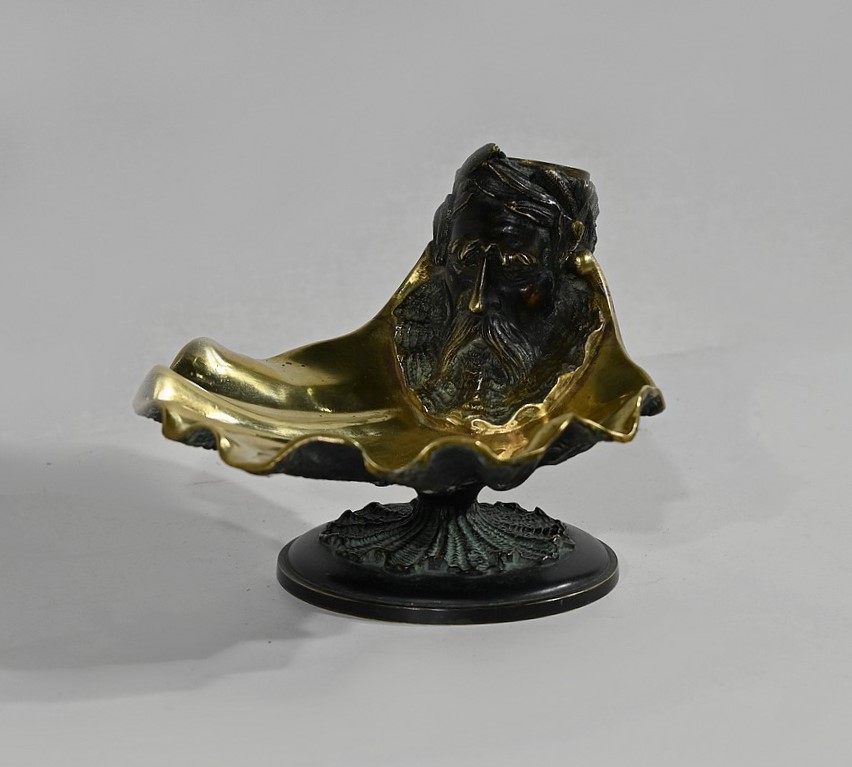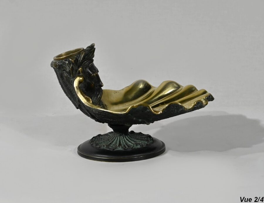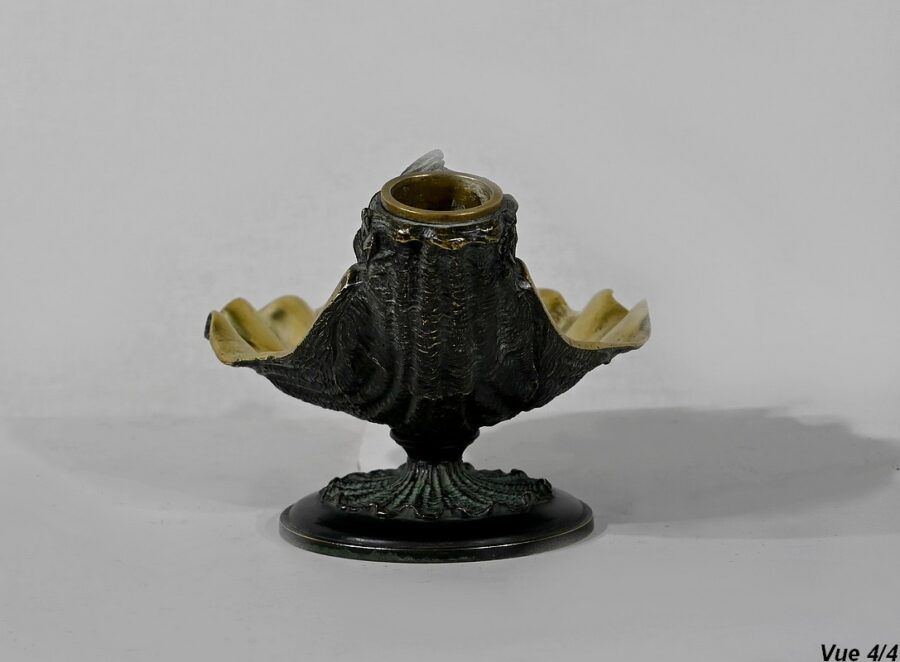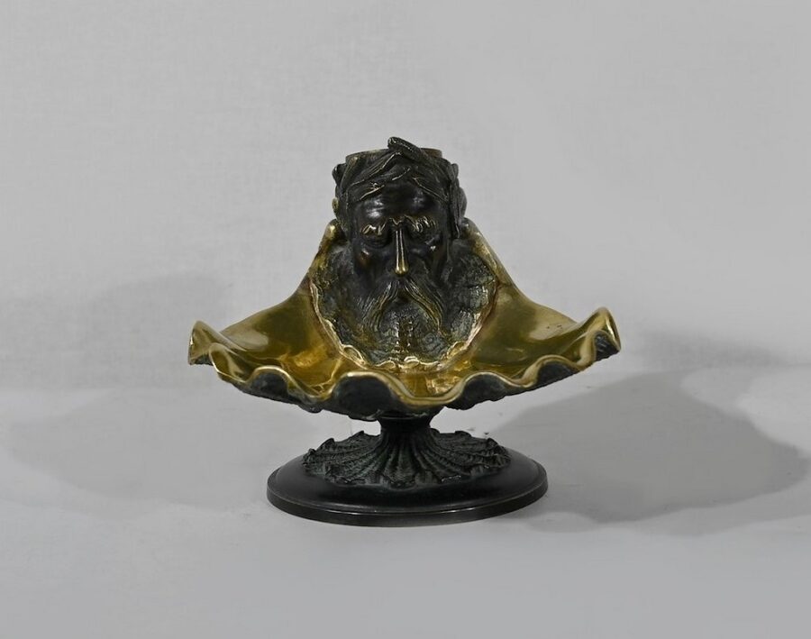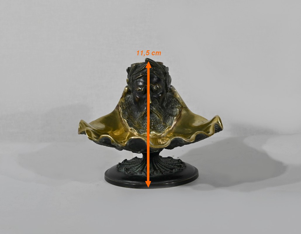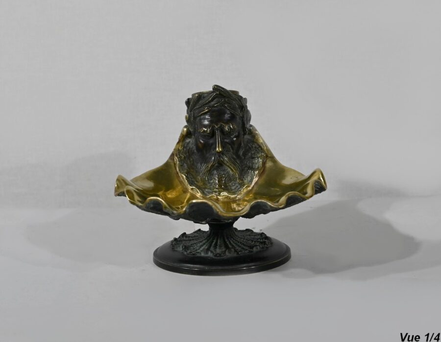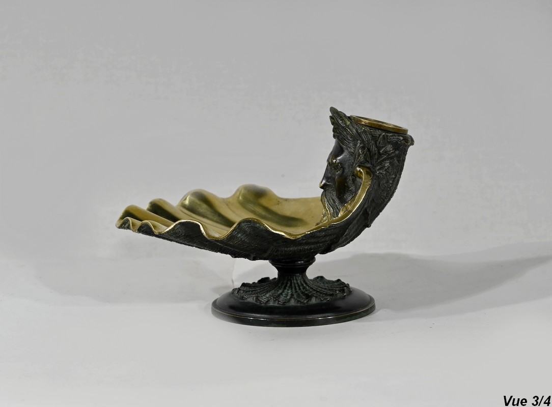 Encrier coquille en bronze à patine dorée à l’intérieur et brune à l’extérieur. Le récipient représente le visage de Neptune, Dieu des eaux vives et des océans.