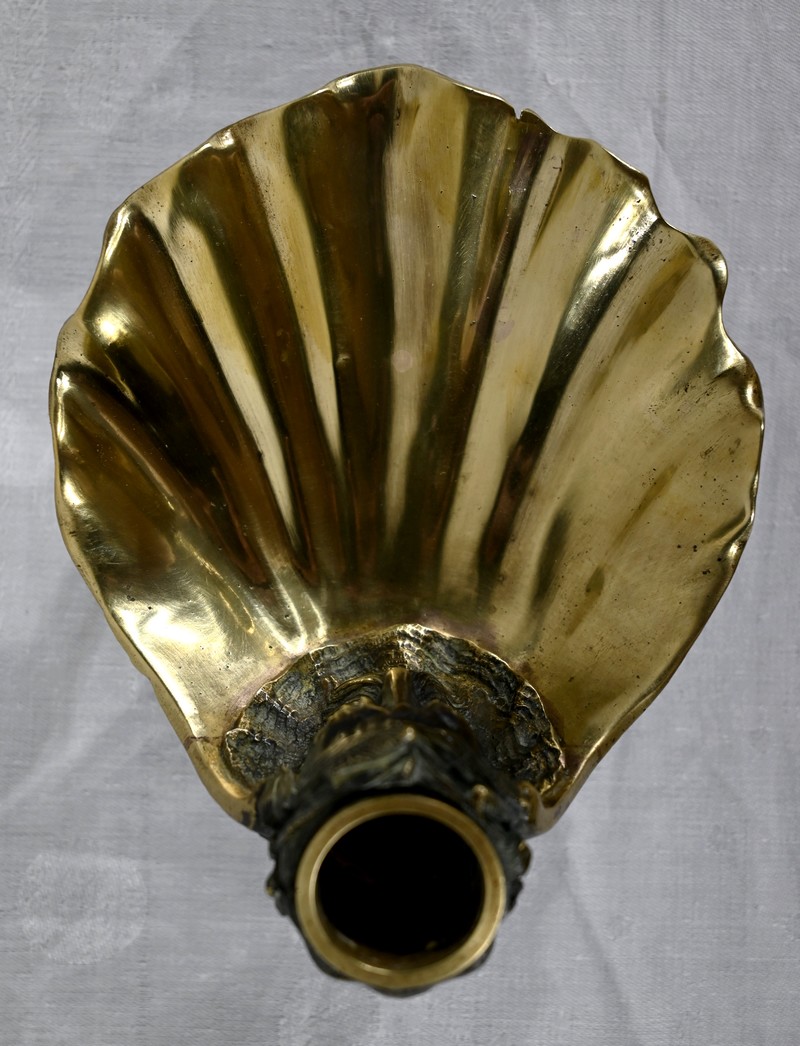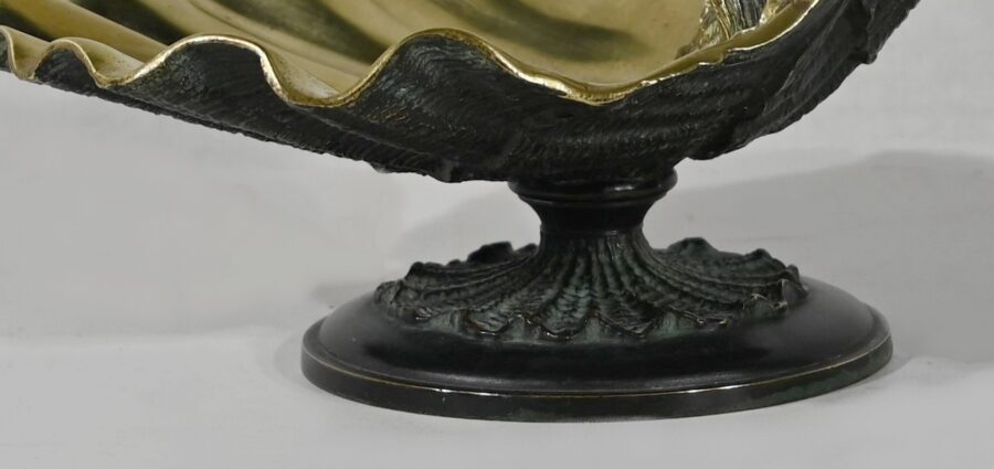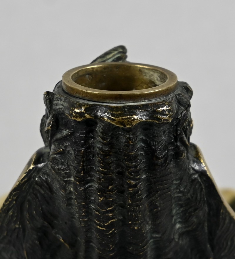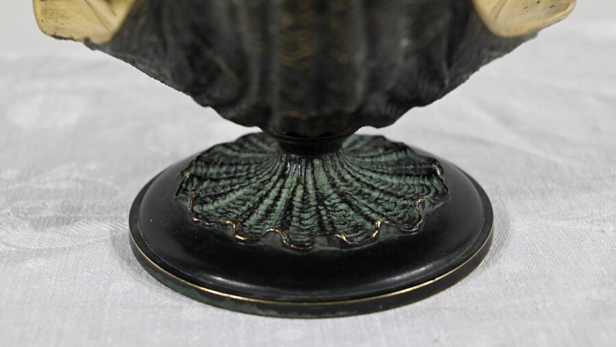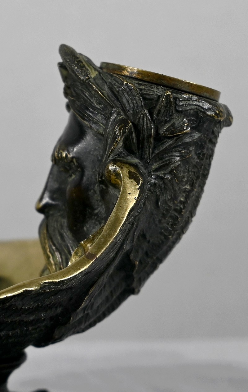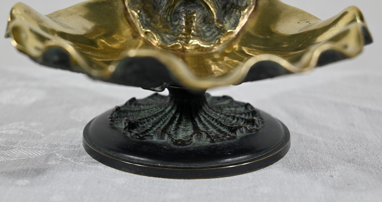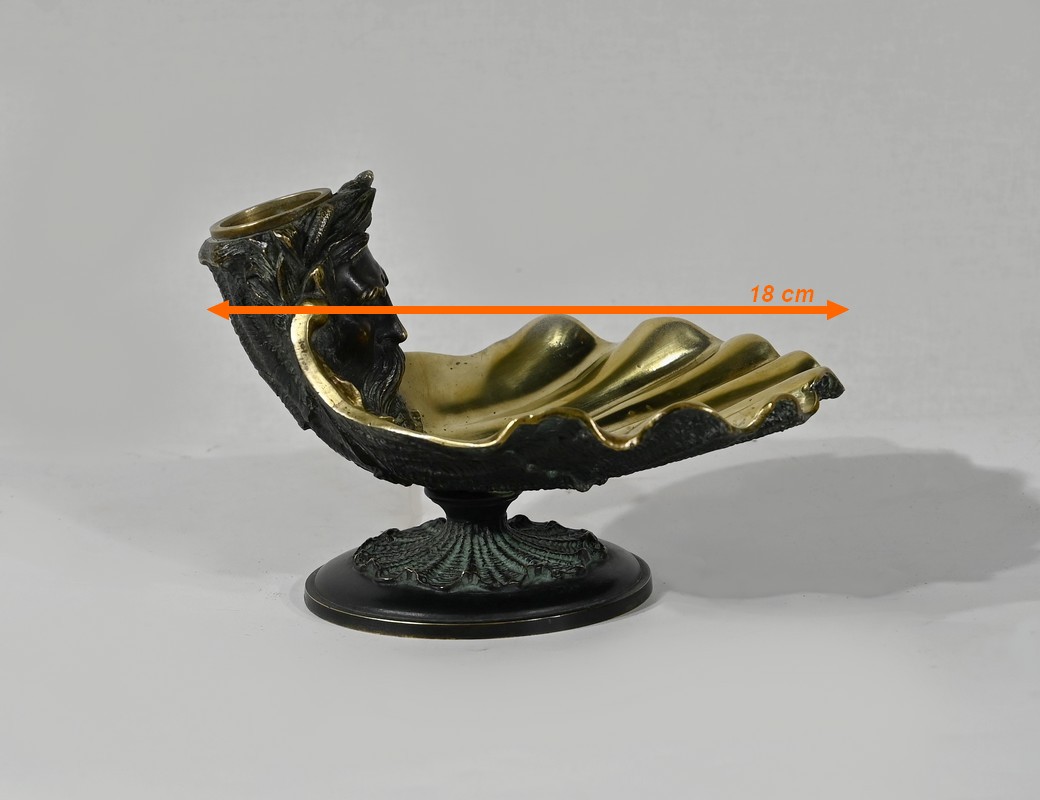 Encrier coquille en bronze à patine dorée à l’intérieur et brune à l’extérieur. Le récipient représente le visage de Neptune, Dieu des eaux vives et des océans.