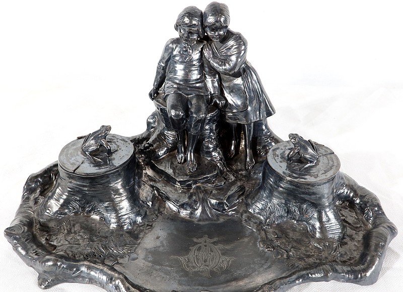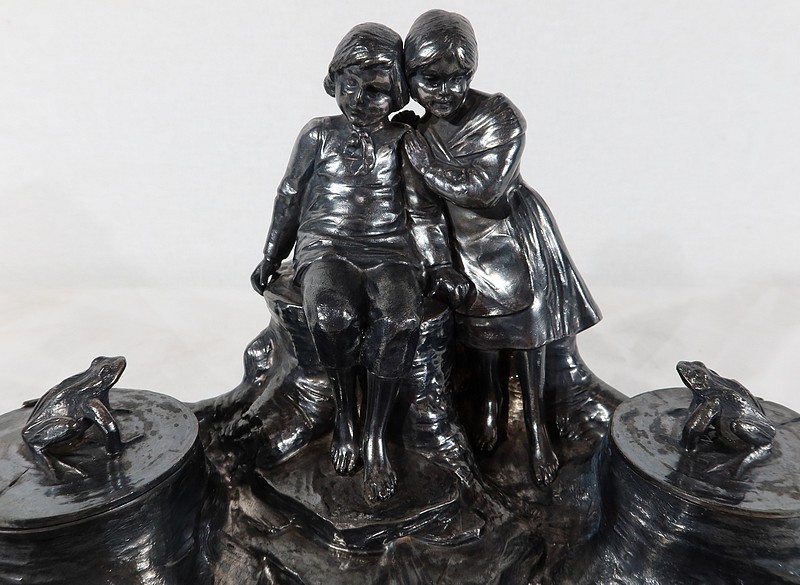Bel encrier en étain monogrammé figurant deux jeunes enfants regardant chacun une grenouille disposée sur un encrier.
