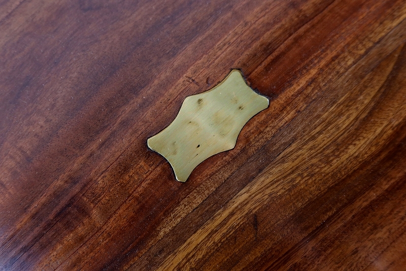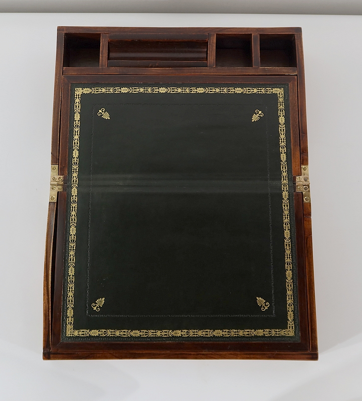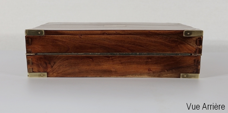 Écritoire de voyage composé d’un dessus avec angles et plaque centrale en laiton et possédant des angles assemblés en queue d’aronde.