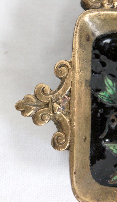 Cet accessoire est enjolivé par des motifs en émaux sur fond noir, représentant des illustrations colorées sur le thème de la nature : des fleurs et des feuillages s’entrelacent sur le couvercle du réceptacle, tandis que des papillons et un oiseau folâtrent dans les branchages fleuris figurant sur le porte-plume.