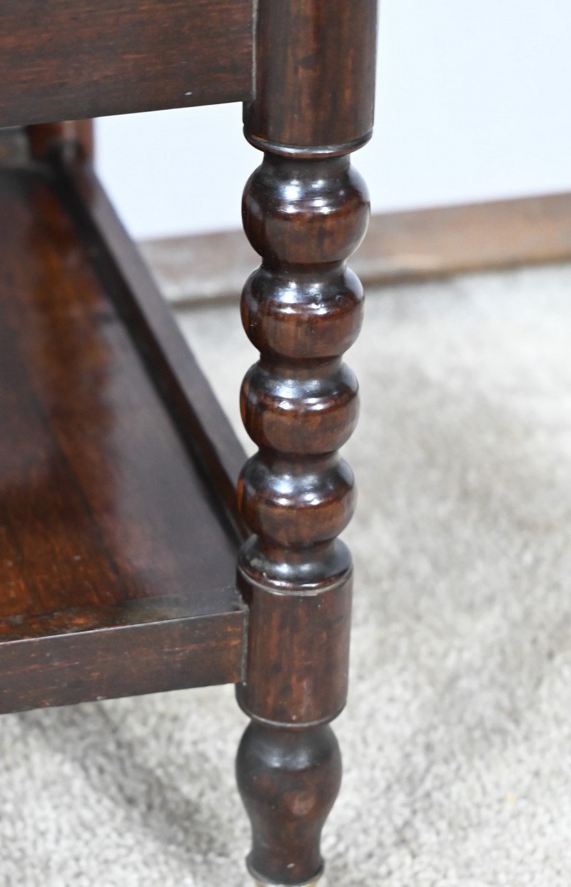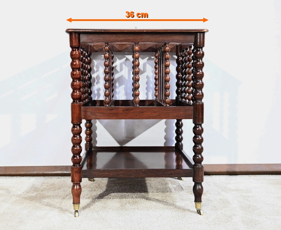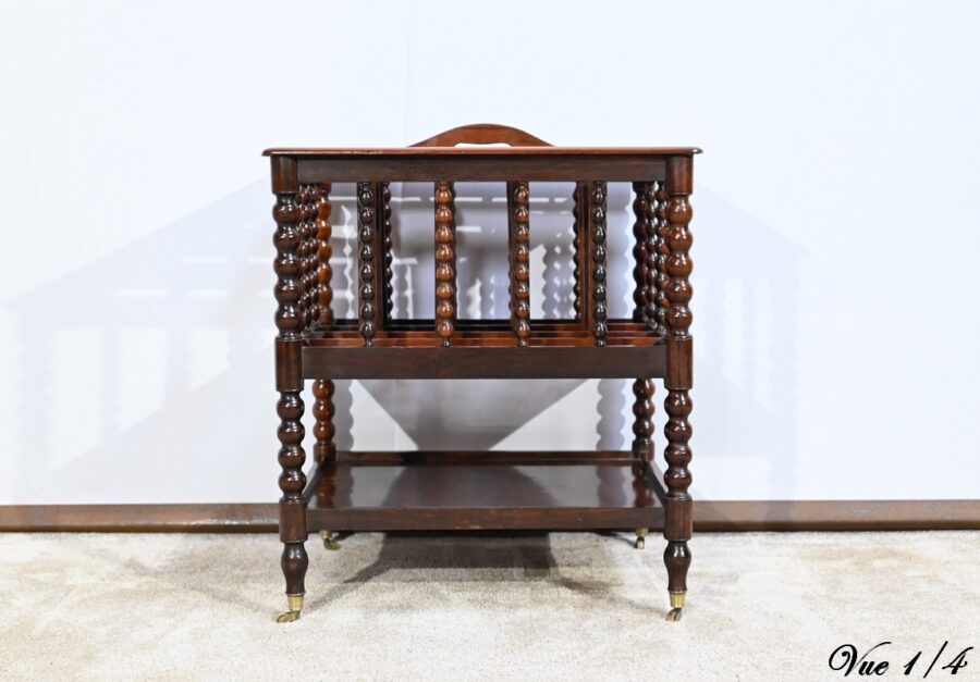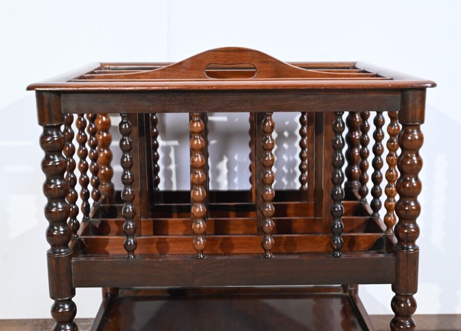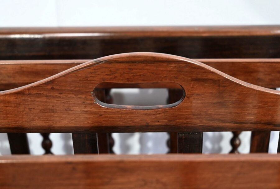 Ce porte-revues en palissandre de Rio présente en partie haute quatre compartiments identiques à barreaux sommées d’une poignée. L’encadrement est légèrement arrondi et à coupe d’onglet.
