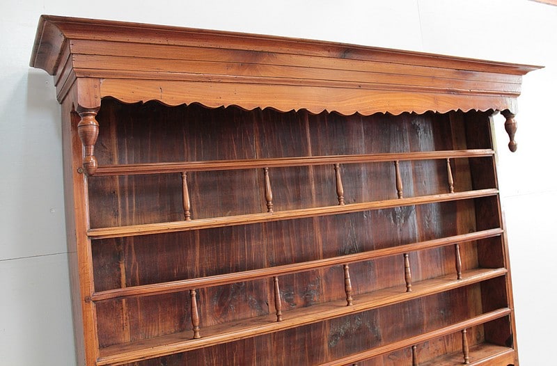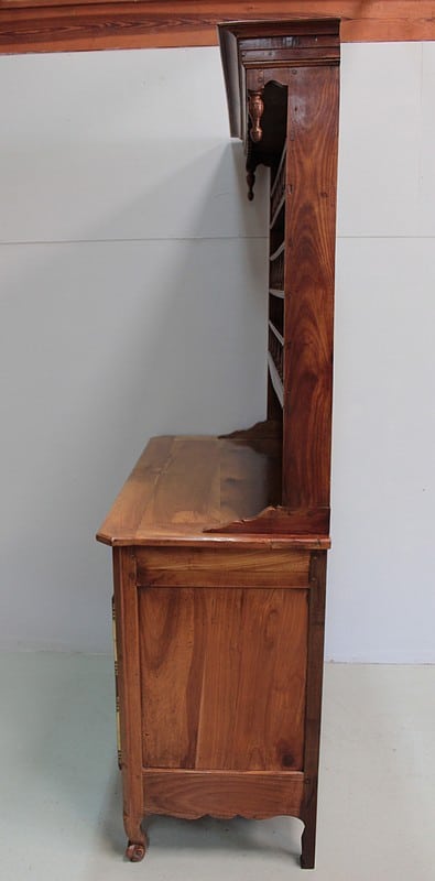 Rare Buffet-Vaisselier Louis XV en merisier , la partie haute garnie de 3 étagères de présentation, la partie basse ouvrant par 2 tiroirs (dont un fermant à clé) et 2 portes à médaillons travaillés en chevrons.