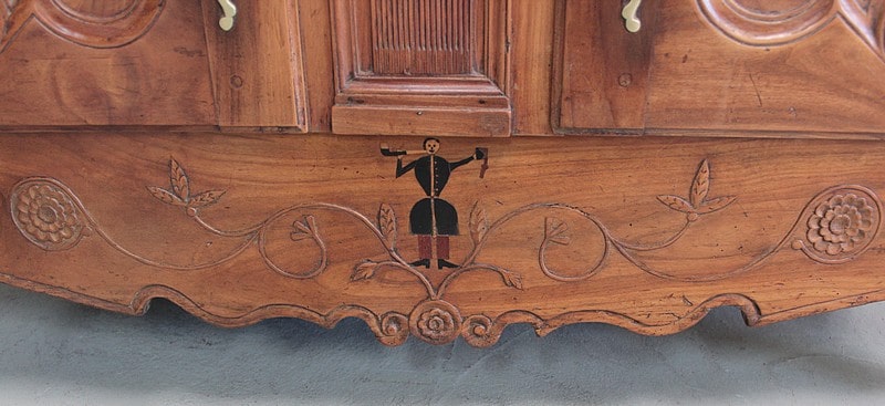 Le dormant est sculpté ainsi que la traverse basse chantournée , une marqueterie naïve agrémente cette sculpture ainsi que l’espace entre les 2 tiroirs.