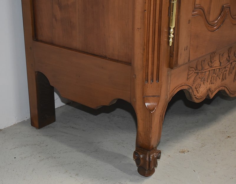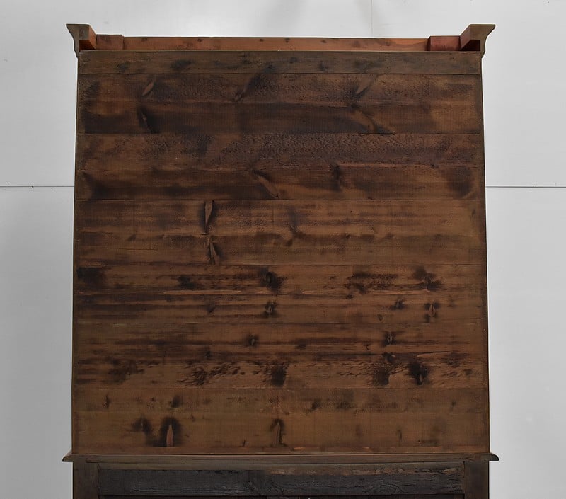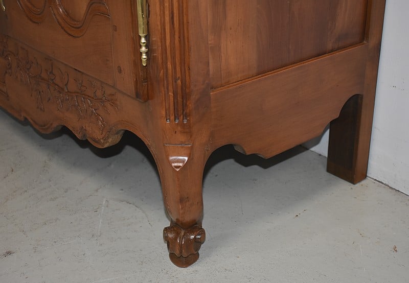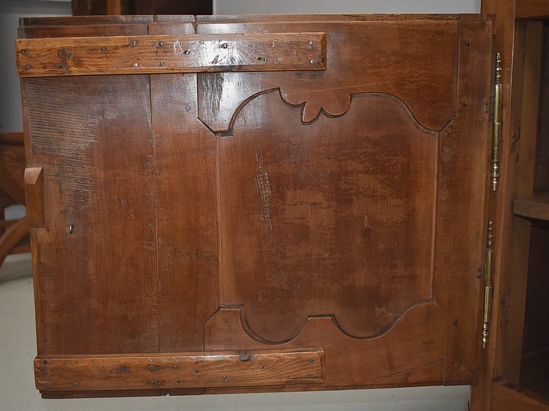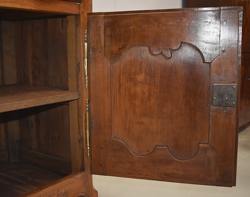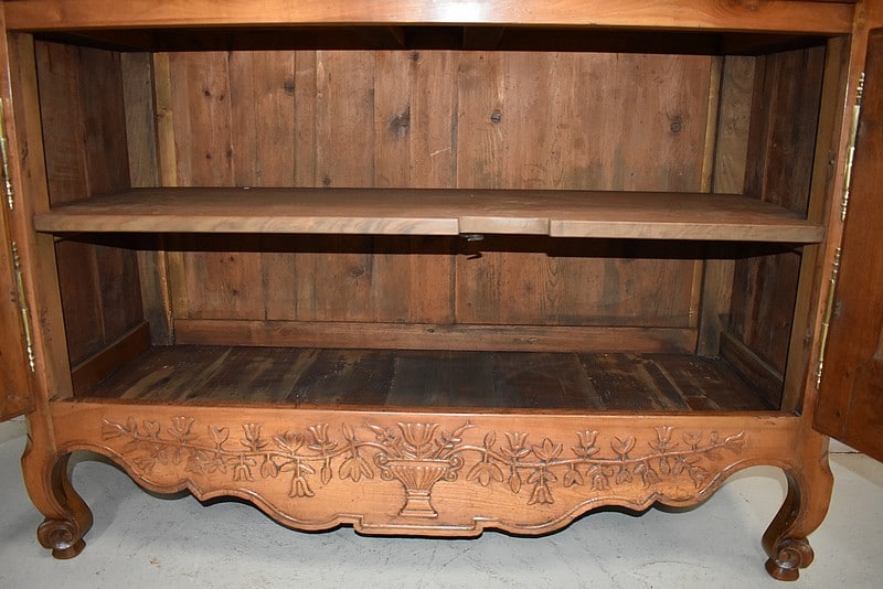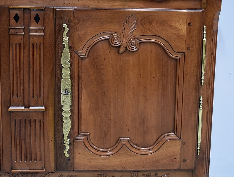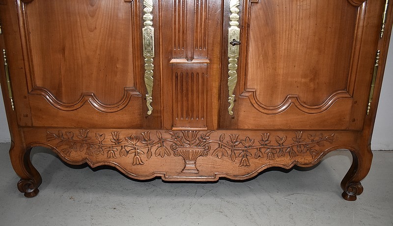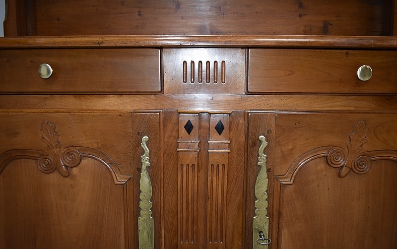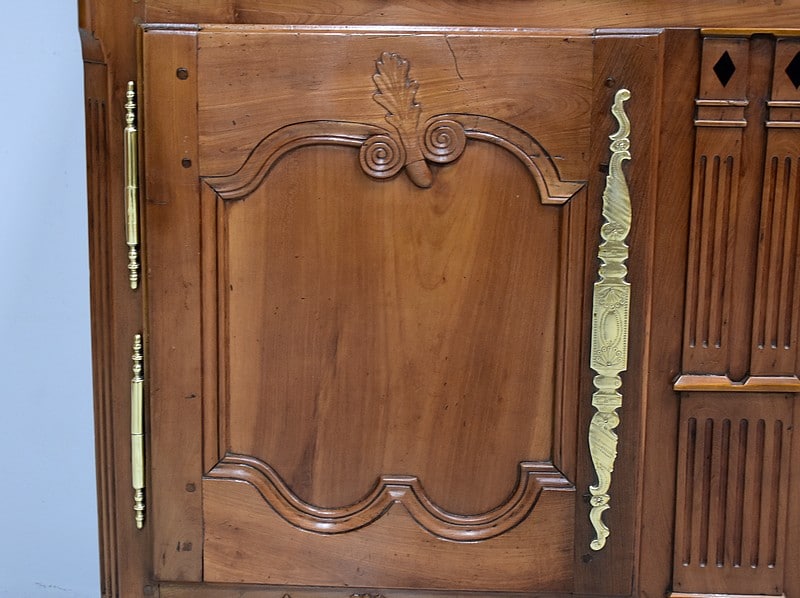 La partie basse ouvre par 2 tiroirs garnis d’un bouton de cuivre, et 2 portes à médaillon à découpe particulière ornée d’un motif de feuille. Les fiches et les entrées de serrure sont en cuivre. Le dormant est à double rangées de cannelures , quant à la traverse basse, chantournée, elle est magnifiquement sculptée d’un vase duquel sortent deux branches de fleurs. L’arrière est en châtaignier.