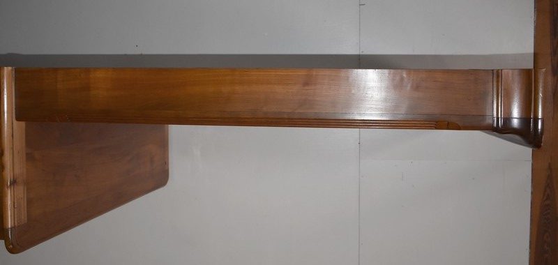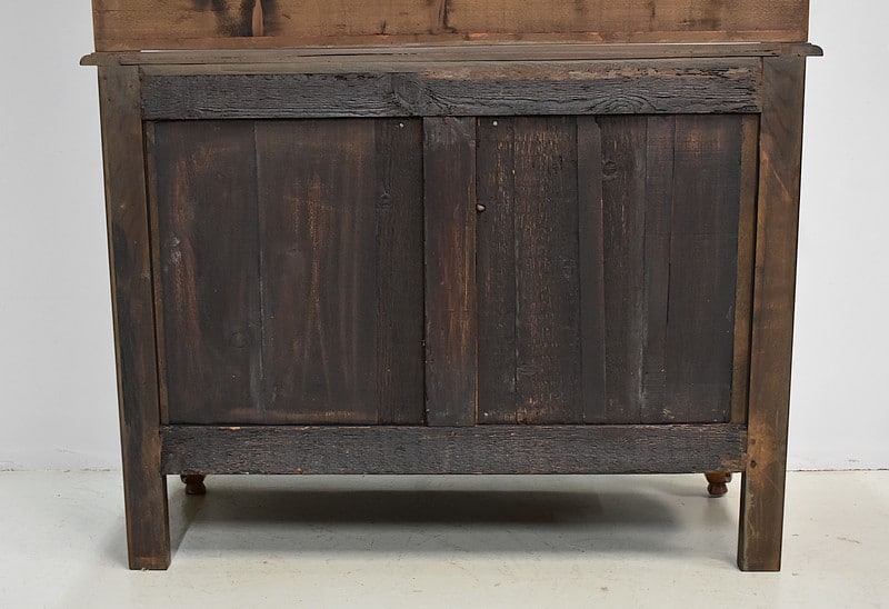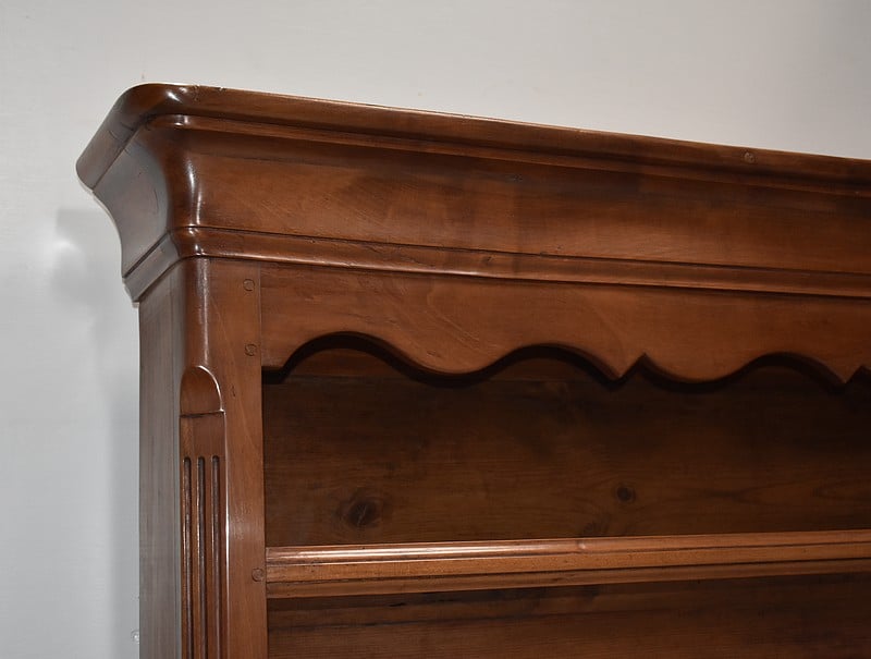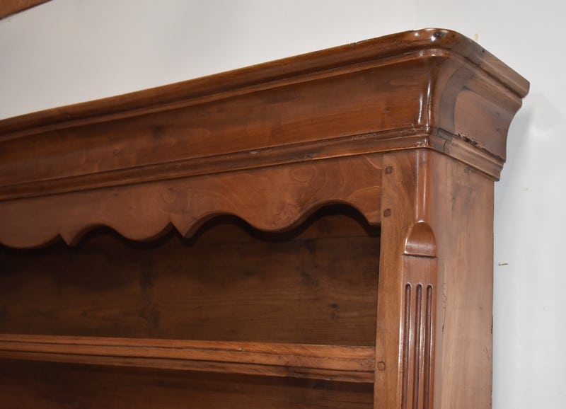 La partie haute – dont le fond est en sapin comme de coutume – est composée de 3 étagères de présentation avec barres de bois pour maintenir les assiettes ou autres objets exposés. Le bas de la corniche est chantourné et les pans coupés sont à cannelures.