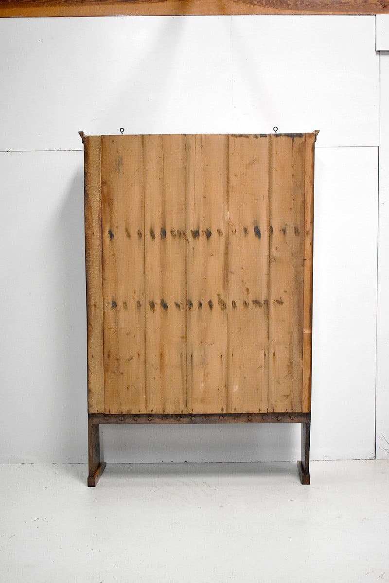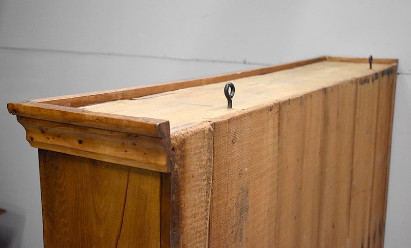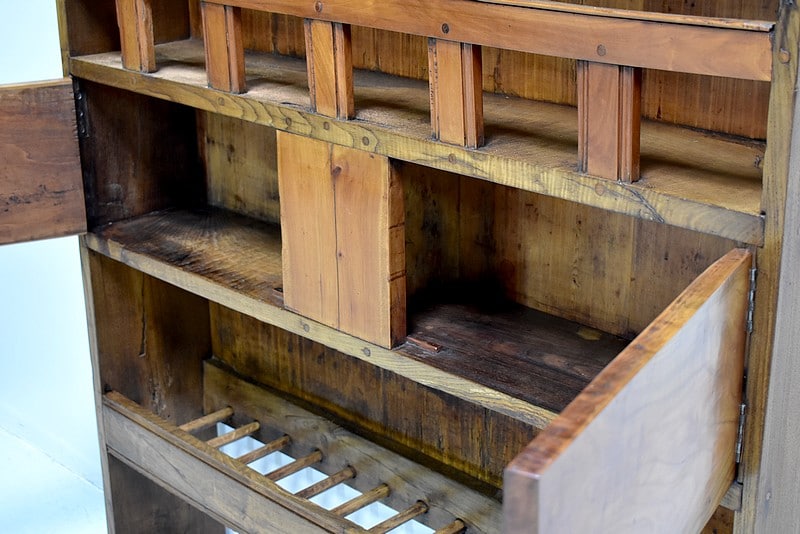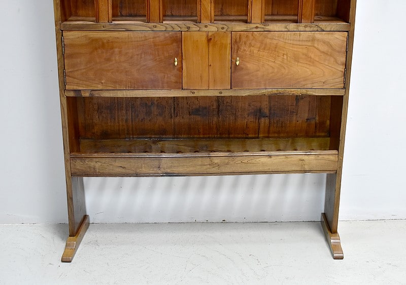 Il dispose de 2 étagères barreautées et moulurées surplombant deux petites portes dotées de discrètes poignées tournantes en forme d’amande, donnant sur deux compartiments distincts séparés par le milieu. Il dispose également, en partie basse, d’une 3ème étagère non barreautée.