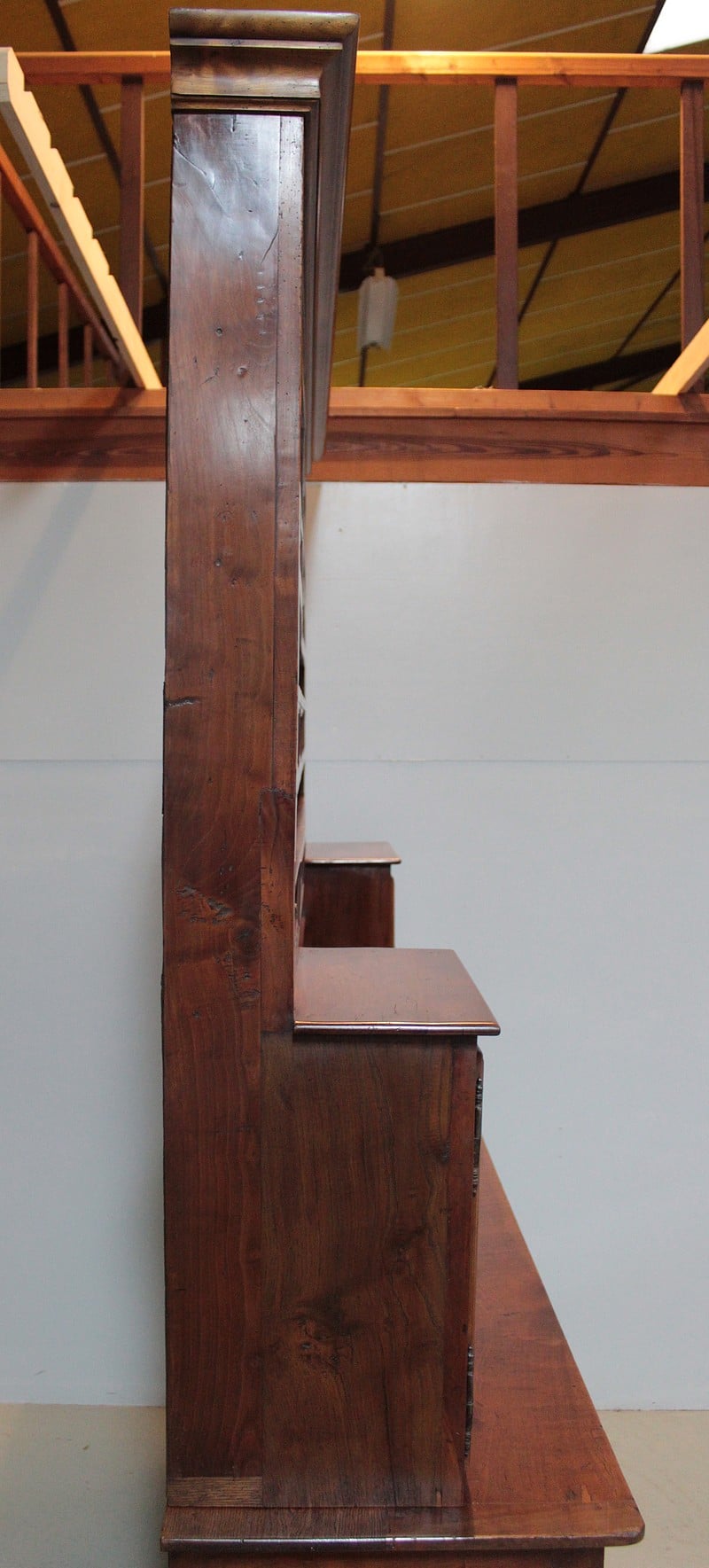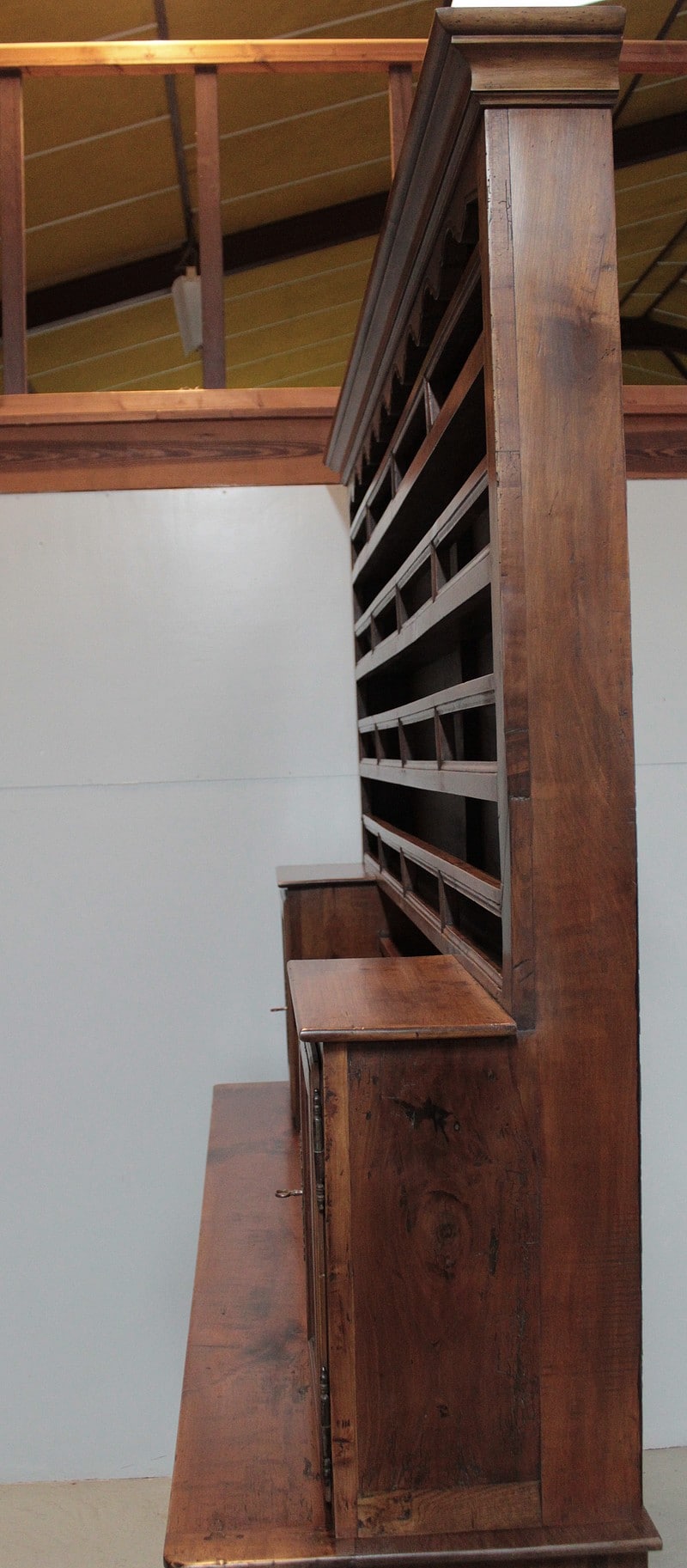 La partie haute est garnie de 5 étagères de présentation et de 2 niches avec portes décorées.