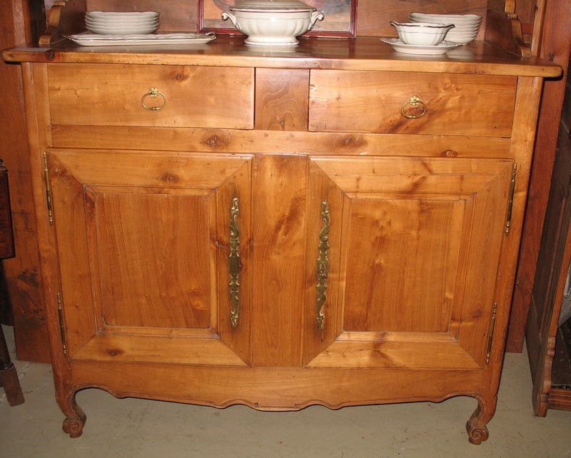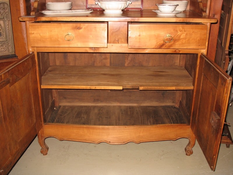 Vaisselier de style Louis XV en merisier blond. Les portes sont à découpe droite et les pieds à enroulements. Les fiches et les entrées de serrure sont en cuivre. Région de Redon