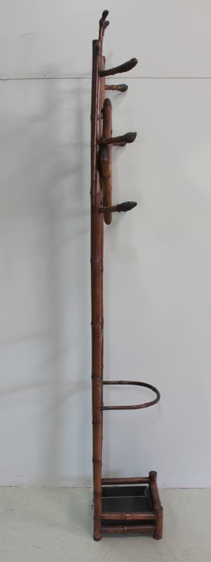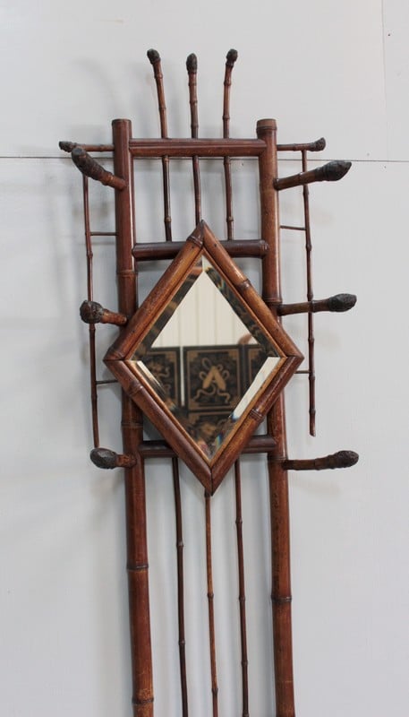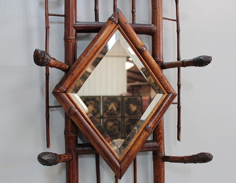 Vestiaire en bambou, un miroir de forme losange encadré de 6 patères en partie haute.