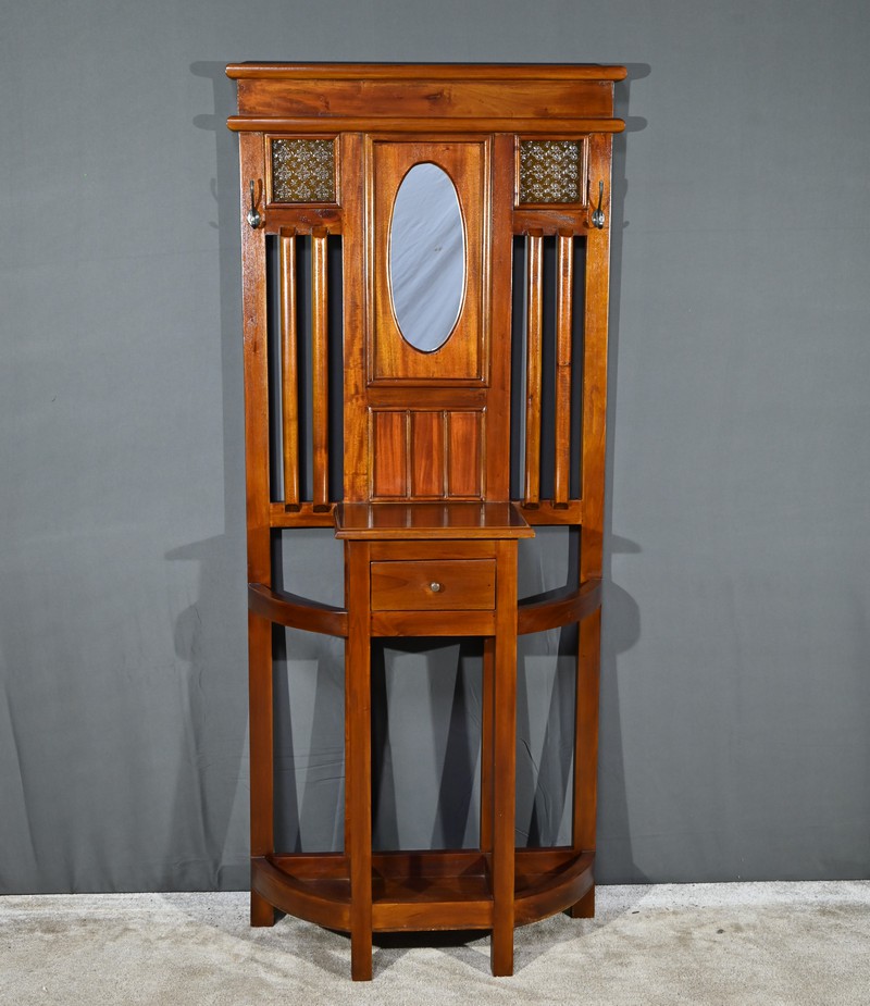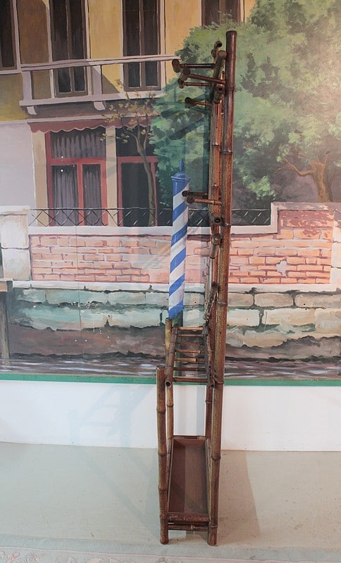 Vestiaire en bambou à 6 patères et un porte-parapluies avec bac en bois. Miroir biseauté en partie haute et décor de céramiques au milieu.