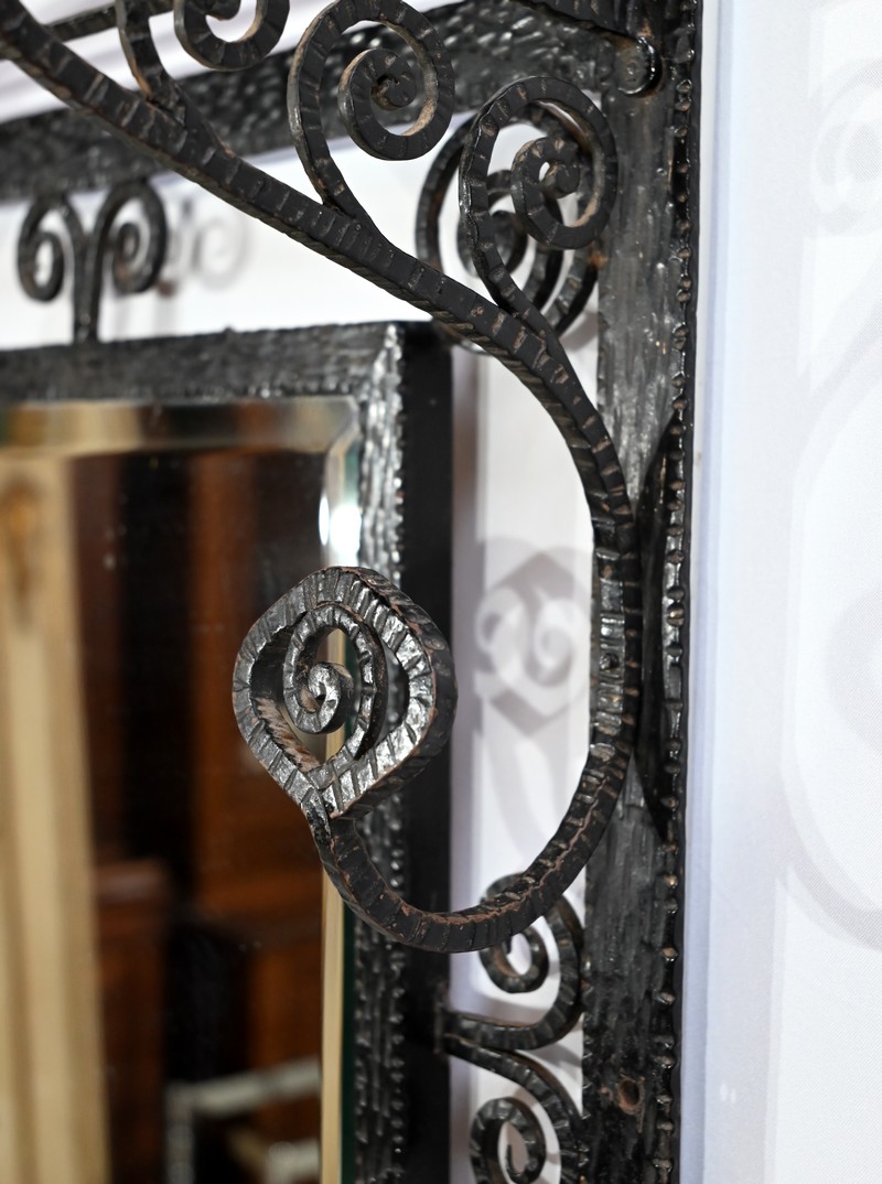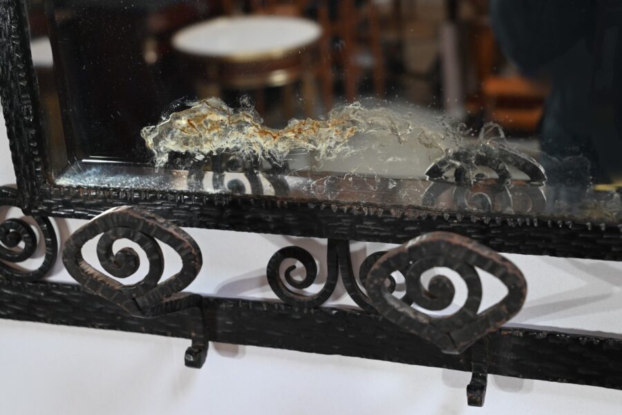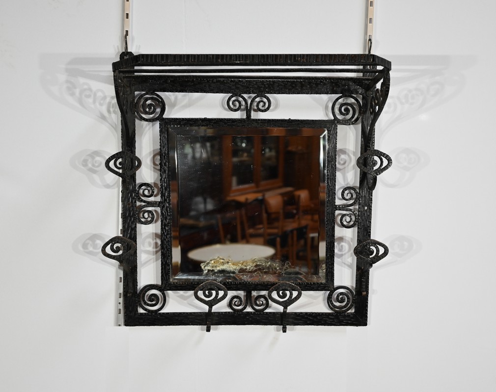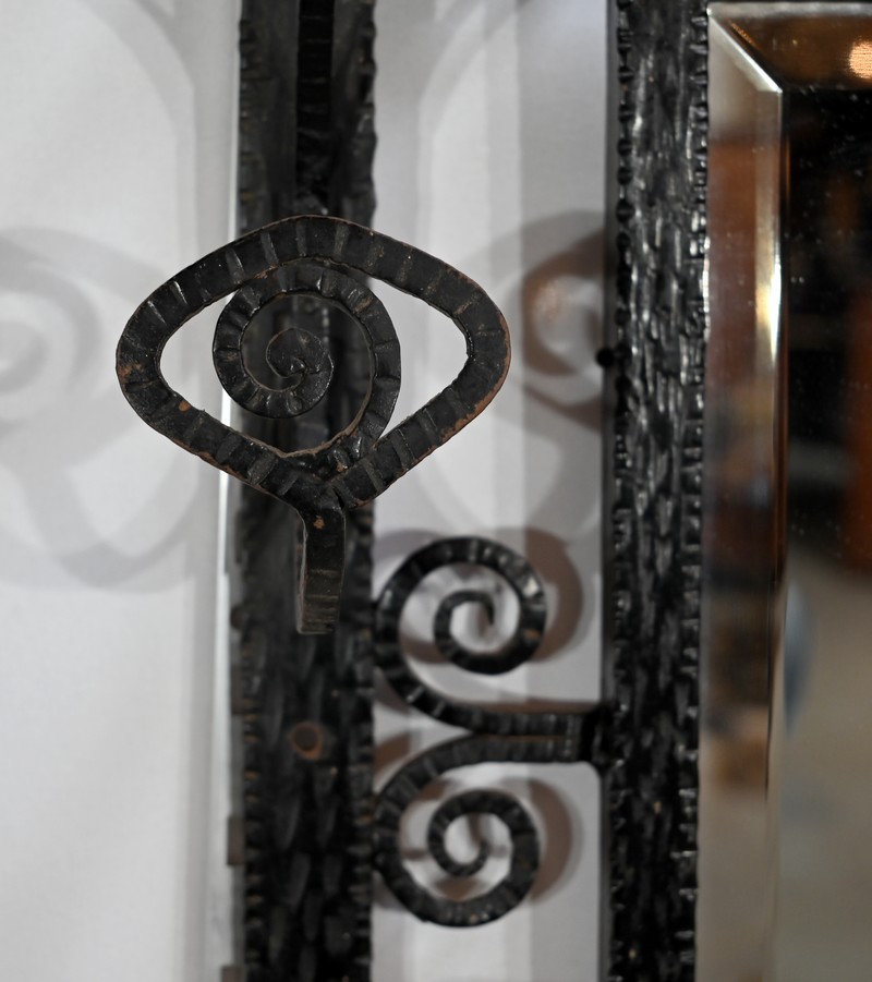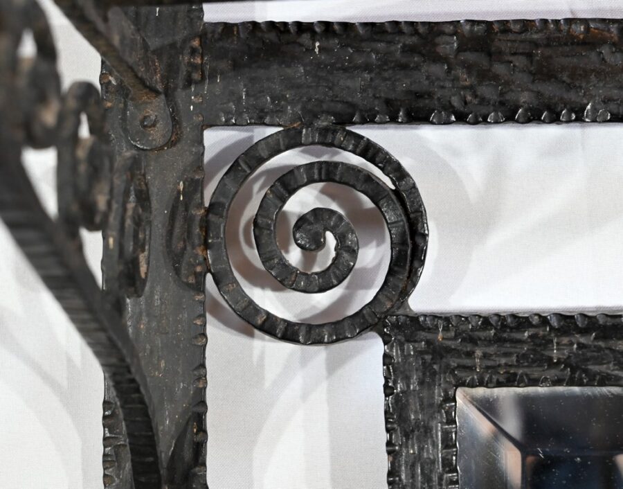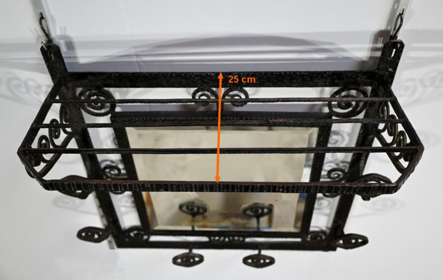 Ce vestiaire présente un cadre en fer forgé ouvragé et agrémenté de diverses volutes.