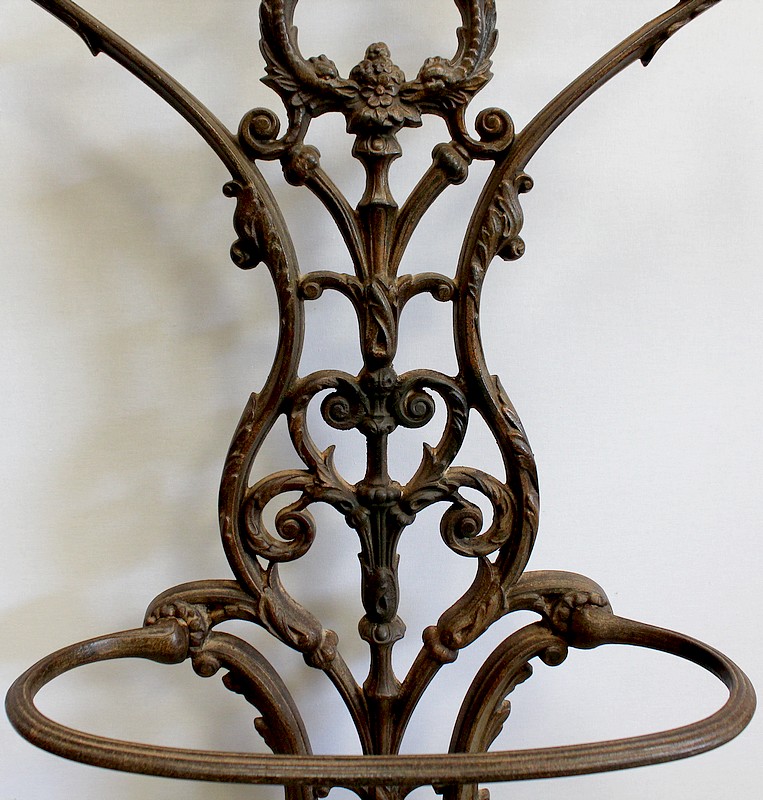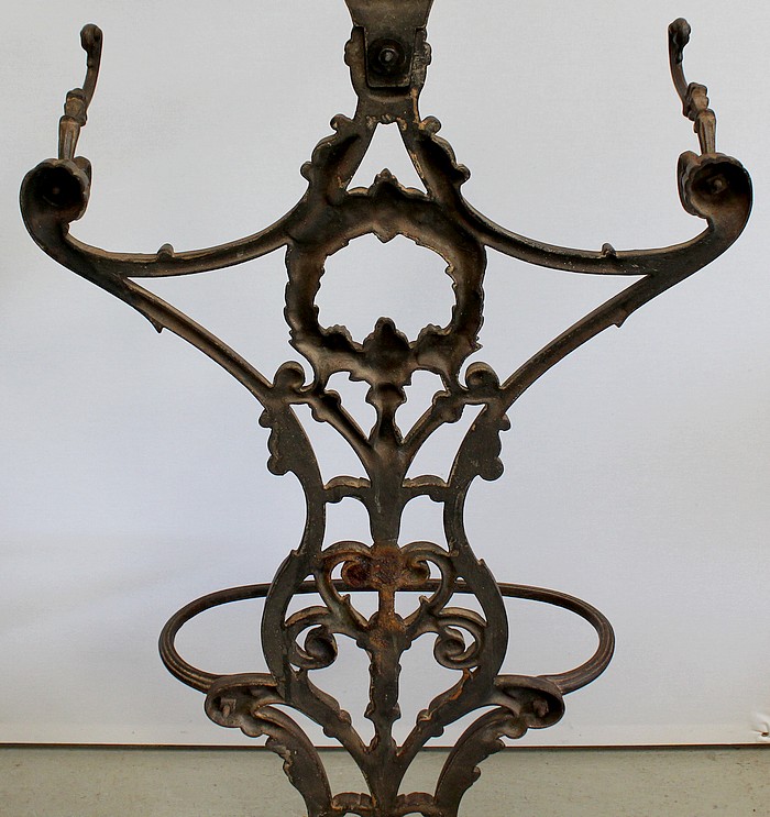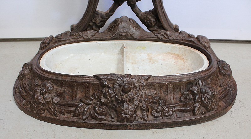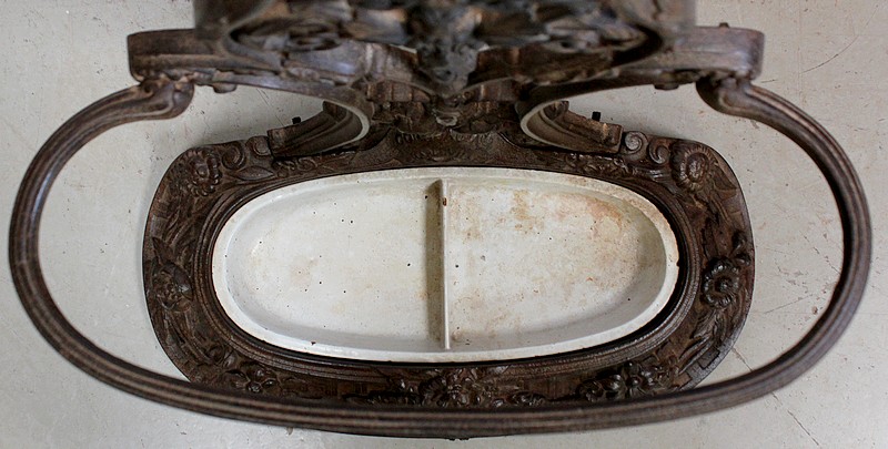 Embelli d’Ornementations Florales, le Dosseret aux formes élégantes est surmonté d’une Corbeille de Fleurs sculptées. La partie inférieure forme un Porte Parapluie de grande taille.