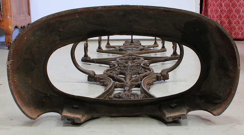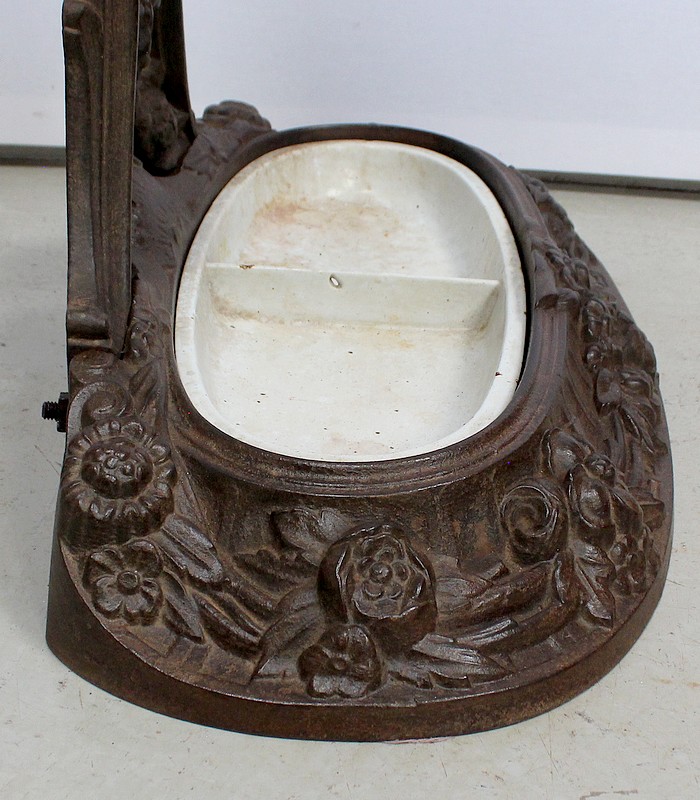 Les Arabesques se mêlent aux Feuilles jusqu’à la Base oblongue décorée de Fleurs et munie d’un Bac en Fonte de couleur blanche.
