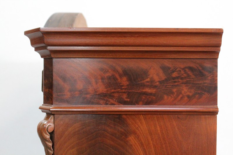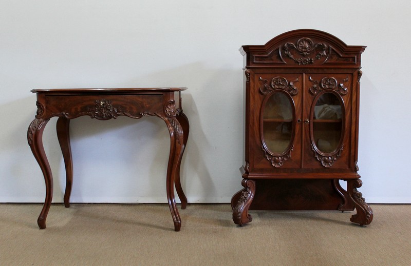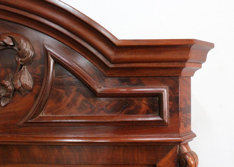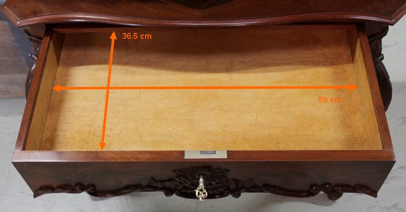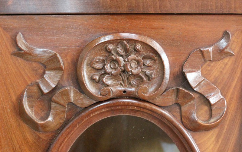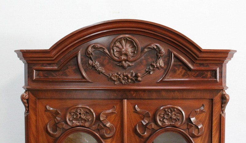 Ce mobilier présente en partie supérieure une vitrine, reposant par le devant sur deux consoles en galbe sculptées de fleurs, de feuillage et de feuille d’acanthe. Le fond à l’arrière soutient également cette structure, encadré de chaque côté par un élément en acajou massif en dégradé qui se termine en volute. Cette vitrine est munie de deux portes, présentant en leur centre une vitre oblongue. Celle-ci est agrémentée d’une moulure en acajou massif en son pourtour, et de décors sculptés : une coquille en partie basse, et un composé de fleurs et de feuilles avec ruban en partie haute. Ces vantaux, équipés d’une serrure d’origine haut et bas et de sa clé, ouvrent sur un intérieur particulièrement soigné en moucheté d’érable, garni d’une tablette au champ en acajou. La vitrine est sommée d’un élément en forme de chapeau de gendarme également garni d’un motif de coquille avec feuillage et ruban, et doté d’une petite corniche.
