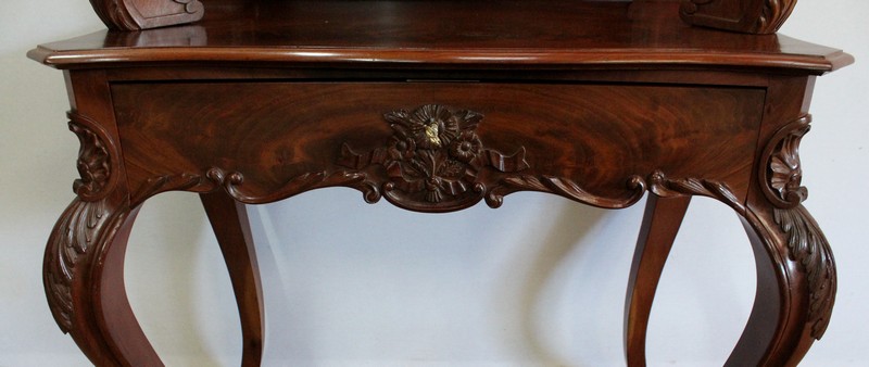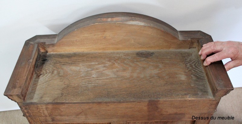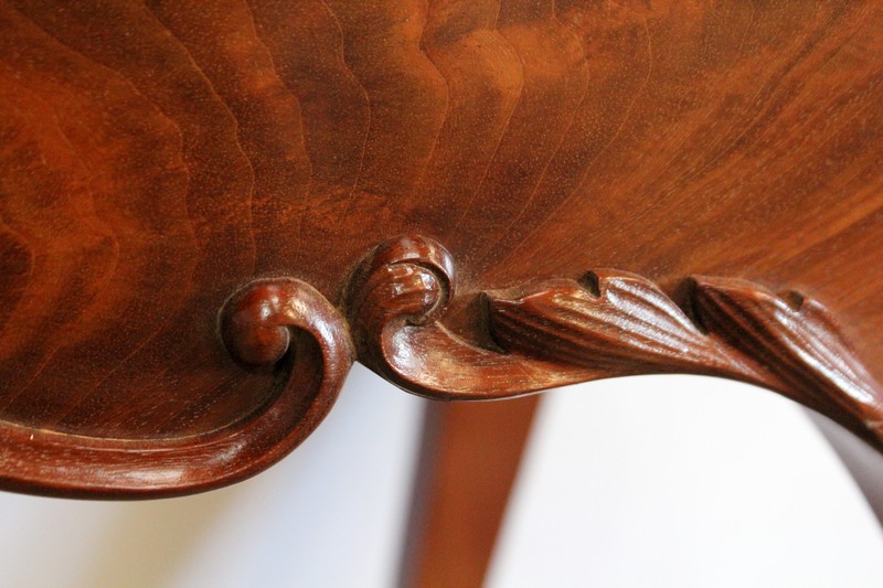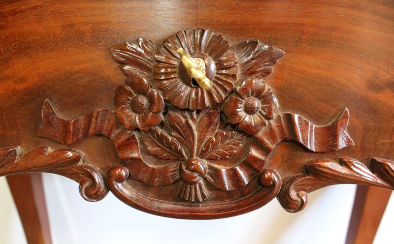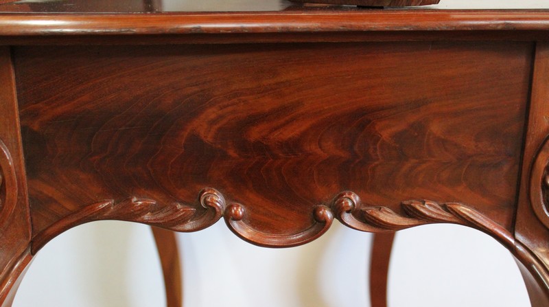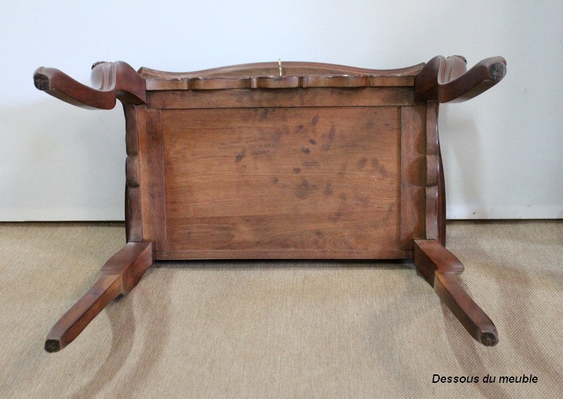 L’ensemble repose sur quatre pieds joliment galbés, moulurés de chaque côté, qui se terminent en volute, sur lesquels nous retrouvons un motif sculpté de coquille et de feuille d’acanthe.