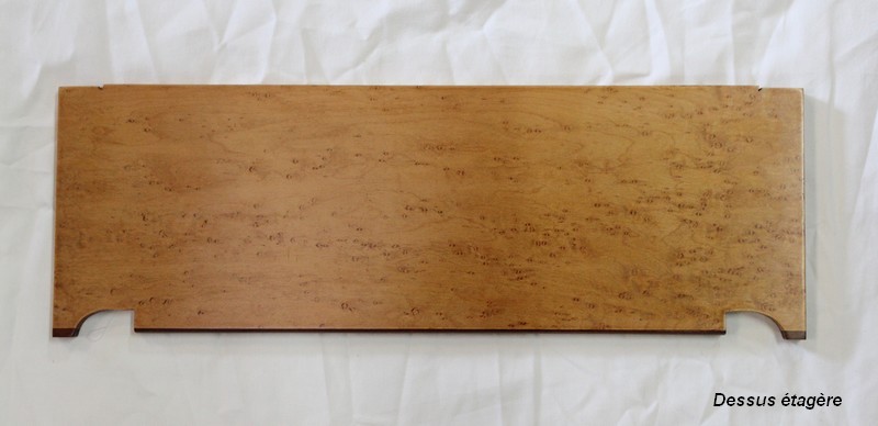 La partie inférieure consiste en une table dont le dessus est composé d’un développé de quatre parties de ronces d’acajou symétriques. Celle-ci ouvre par un tiroir écritoire garni d’un cuir avec rangement coulissant, dont le fond est en érable moucheté.