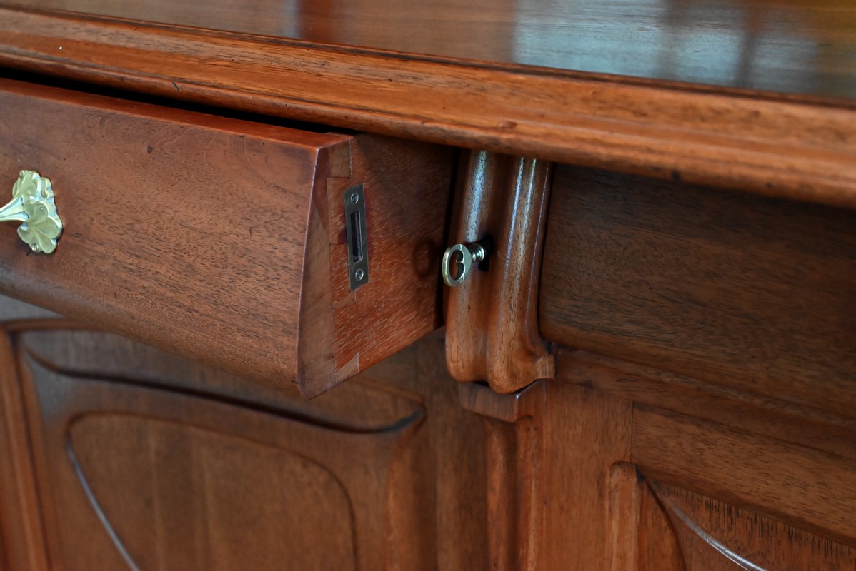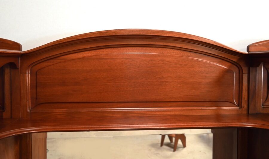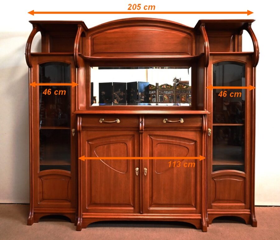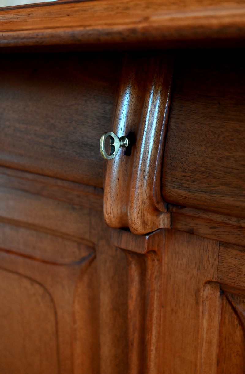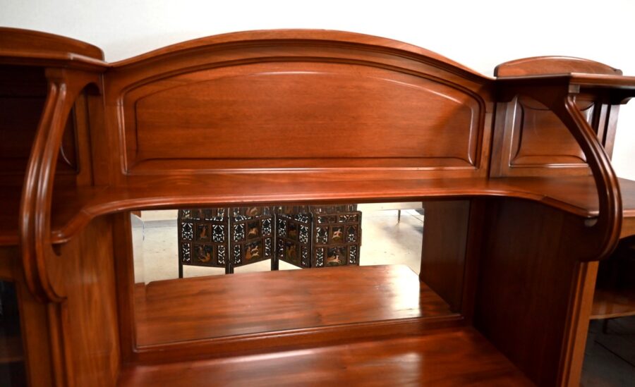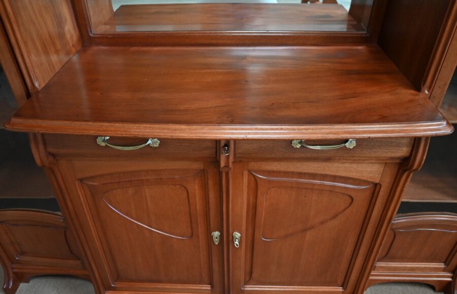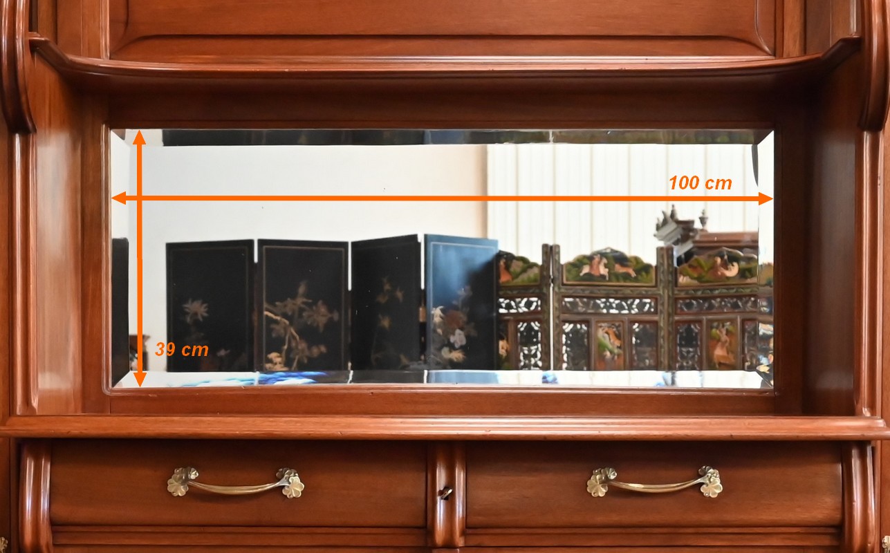 Le corps central ouvre par deux portes à cadres à doucine. Les pourtours sont à plates-bandes et à défoncement en partie haute. Elles sont pourvues d’entrées en bronze et d’une serrure d’origine avec clé. L’intérieur est garni d’une épaisse étagère, réglable puisque sur crémaillères. La ceinture présente deux tiroirs, à façades mouvementées. Ils sont munis de poignées de tirage ciselées, à décor de fleurs épanouies. Une serrure d’origine fonctionnelle, au centre, verrouille ces tiroirs simultanément. Le plateau, à gorge écrasée, est surmonté, dans un cadre mouluré, d’un miroir au mercure biseauté. Ce dernier est surmonté d’un panneau cintré, à plate-bande et moulures intérieures, et d’une tablette incurvée aux angles.