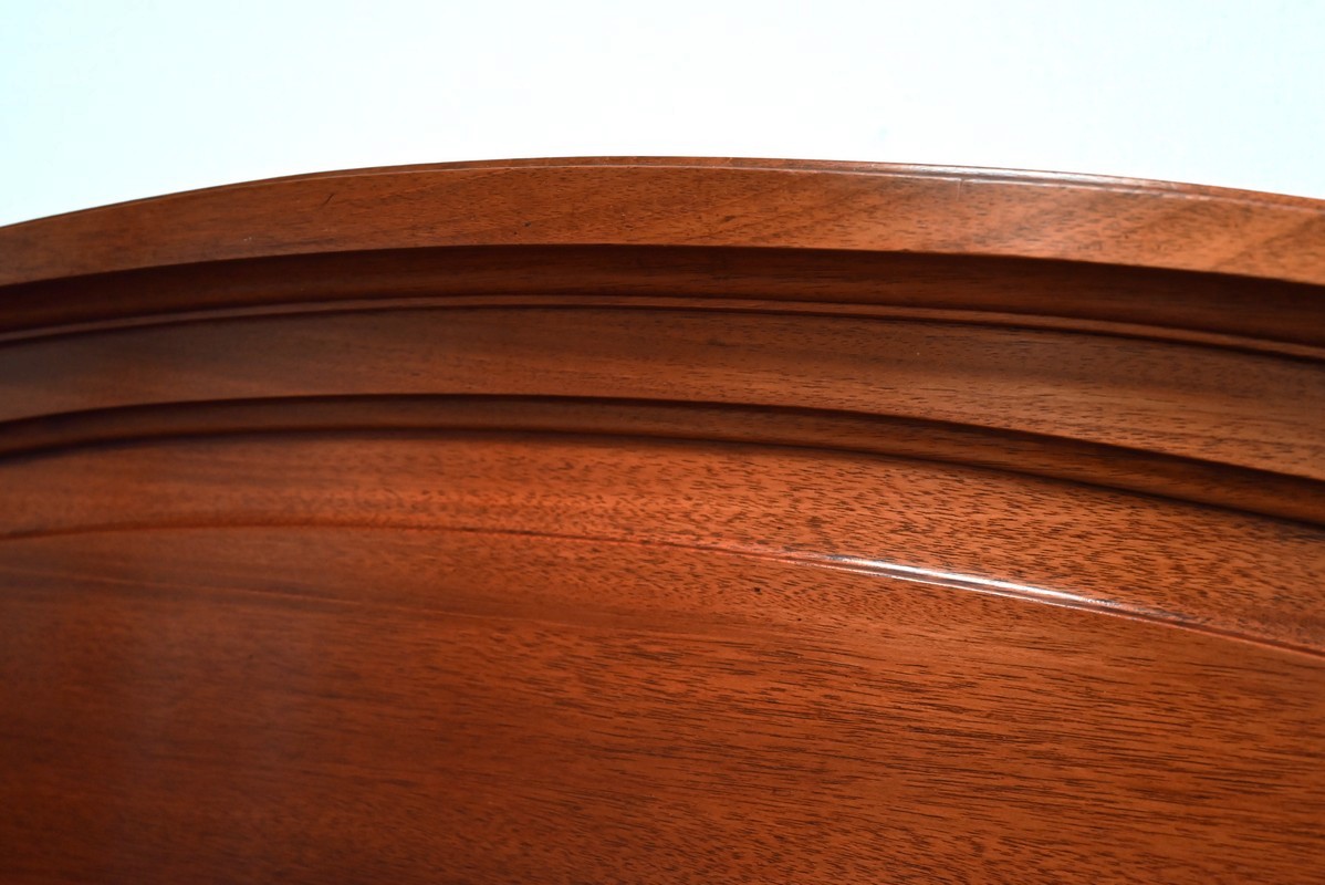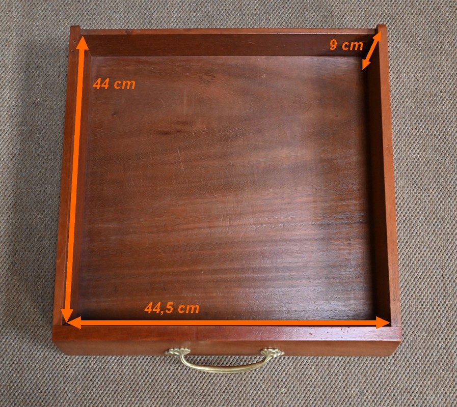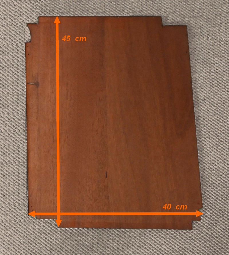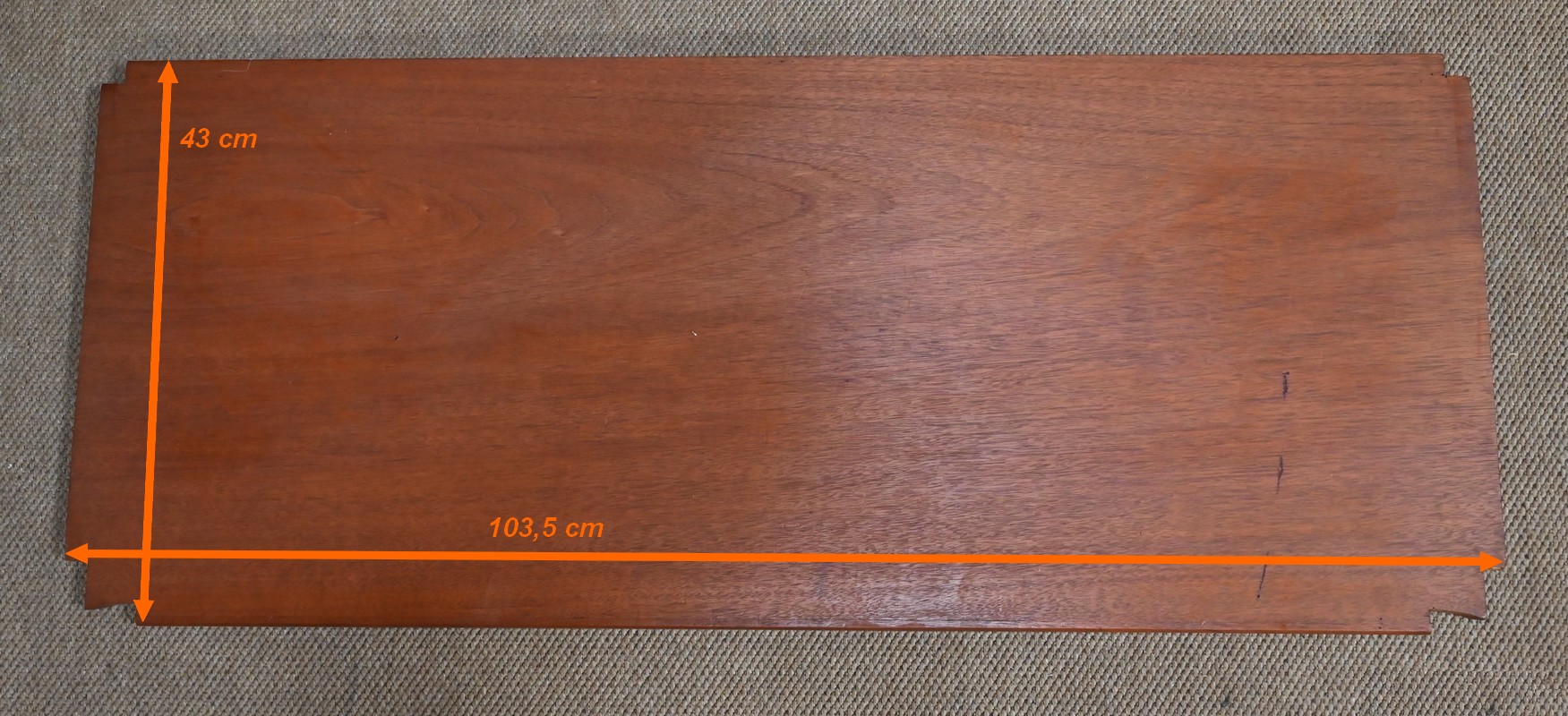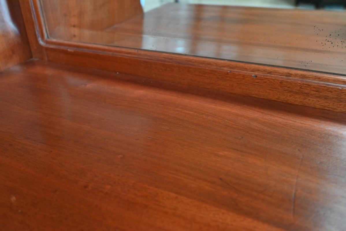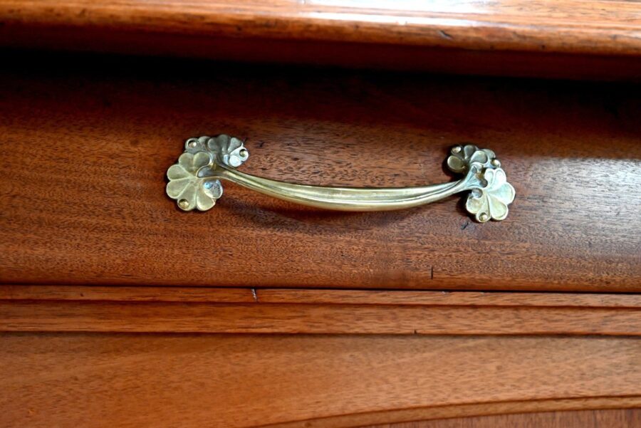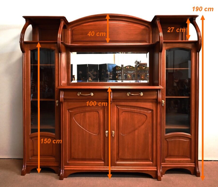Le corps central ouvre par deux portes à cadres à doucine. Les pourtours sont à plates-bandes et à défoncement en partie haute. Elles sont pourvues d’entrées en bronze et d’une serrure d’origine avec clé. L’intérieur est garni d’une épaisse étagère, réglable puisque sur crémaillères. La ceinture présente deux tiroirs, à façades mouvementées. Ils sont munis de poignées de tirage ciselées, à décor de fleurs épanouies. Une serrure d’origine fonctionnelle, au centre, verrouille ces tiroirs simultanément. Le plateau, à gorge écrasée, est surmonté, dans un cadre mouluré, d’un miroir au mercure biseauté. Ce dernier est surmonté d’un panneau cintré, à plate-bande et moulures intérieures, et d’une tablette incurvée aux angles.