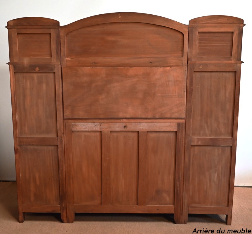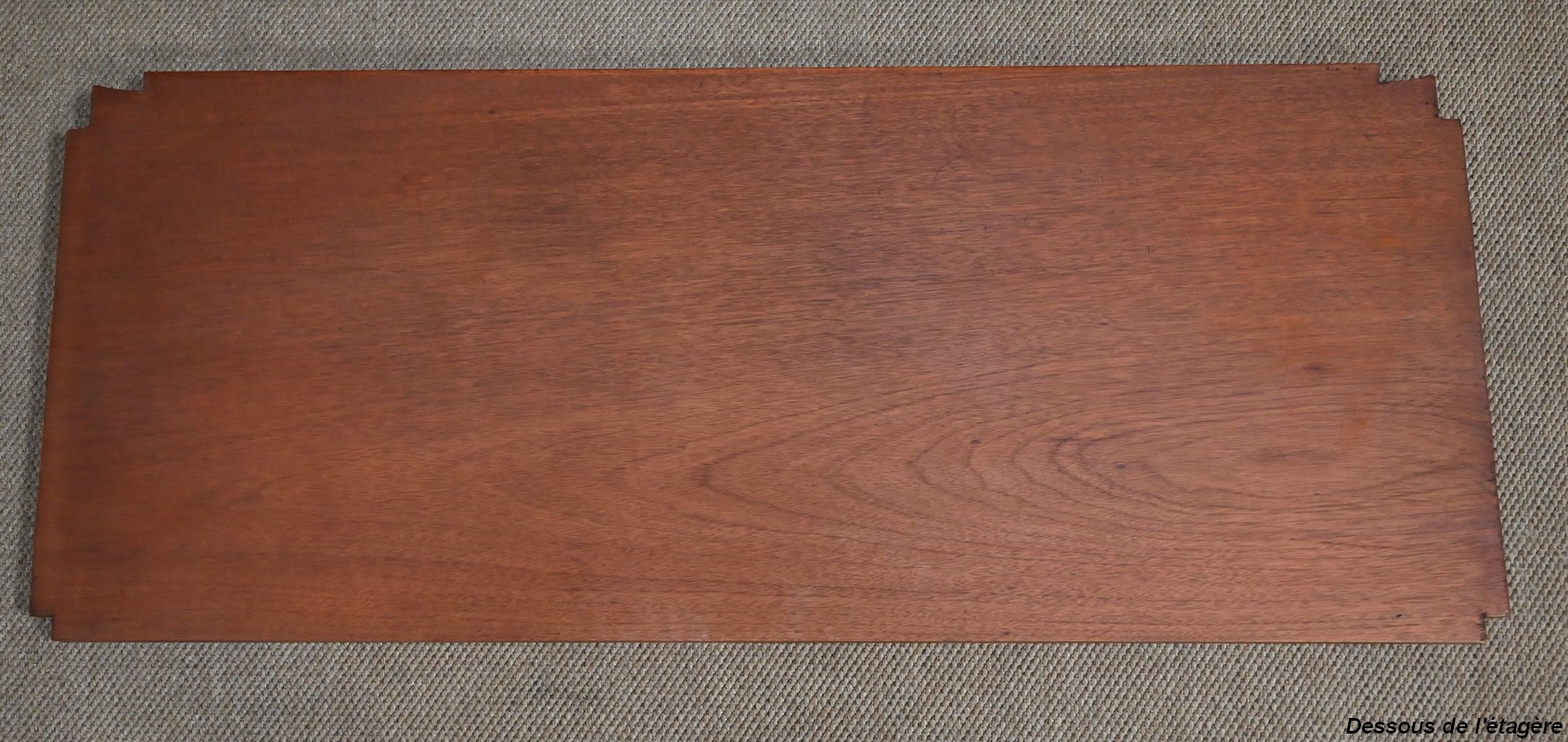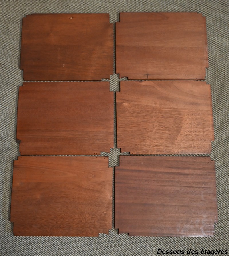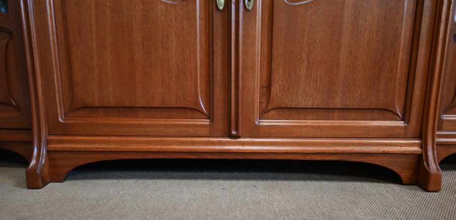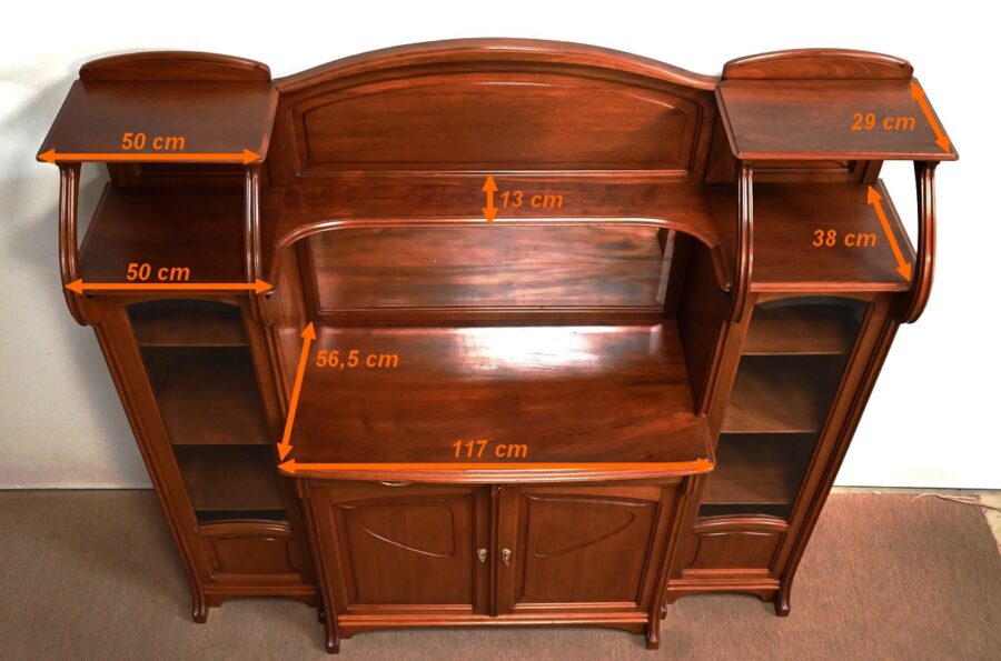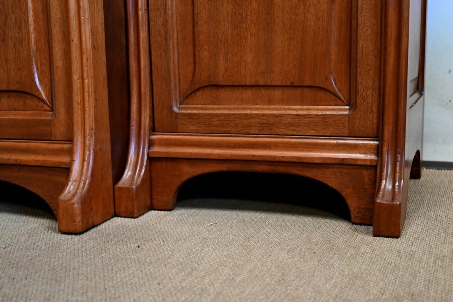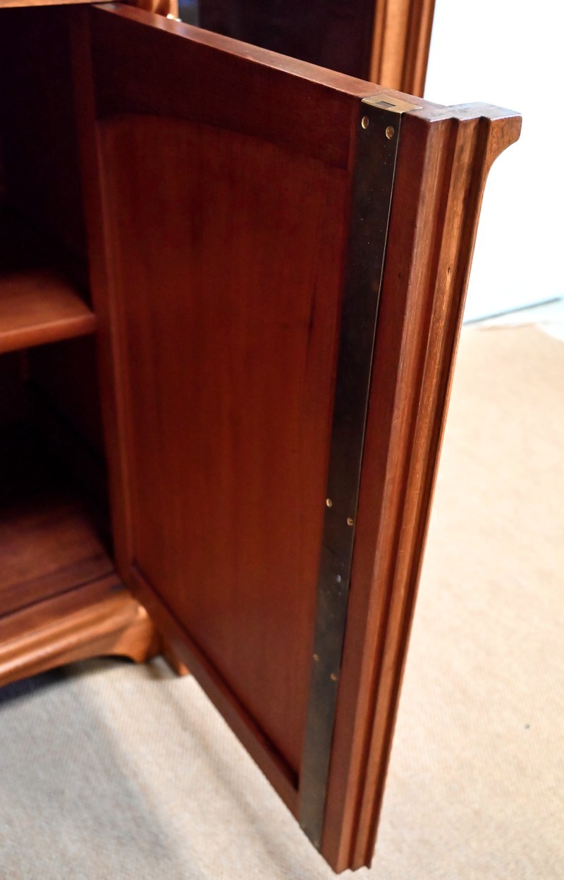 En retrait aux extrémités, deux étroits cabinets aux portes vitrées et panneautées dans le même goût, sont également munis de serrures authentiques, en état de fonctionnement, avec clés et entrées. Ils sont équipés, chacun, de trois étagères réglables, posées sur crémaillères, et au besoin interchangeables. En parties hautes, des montants arqués soutiennent une tablette.