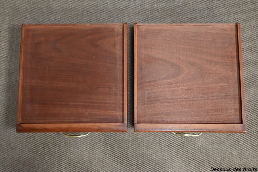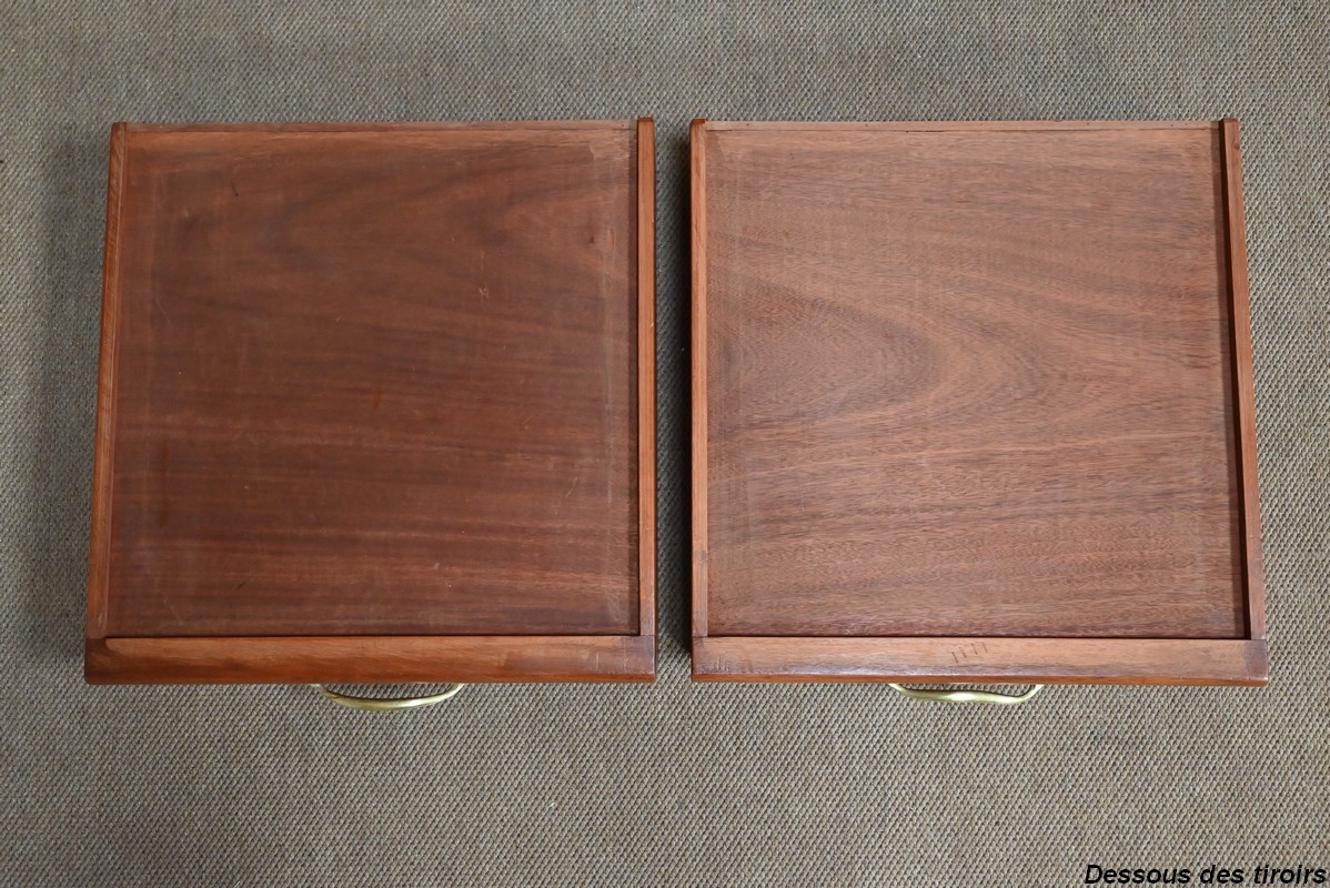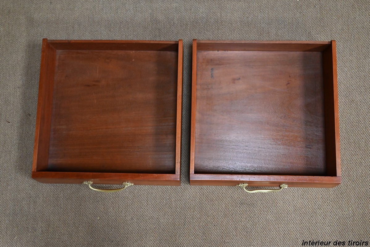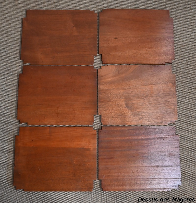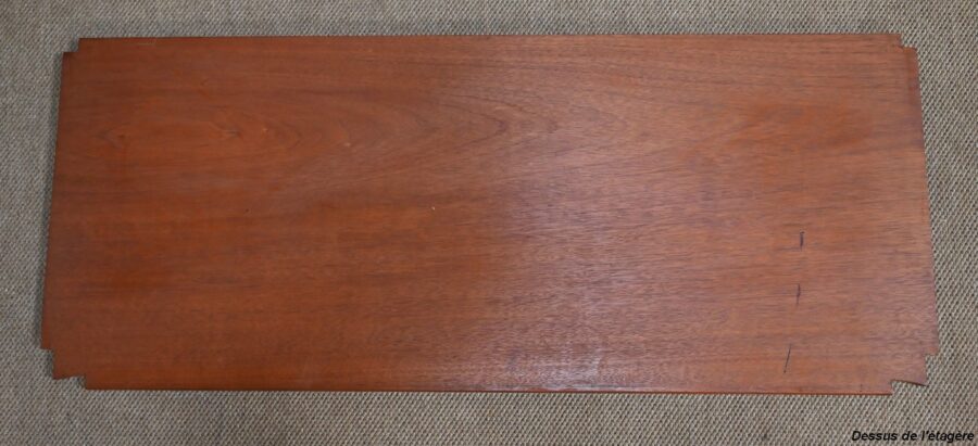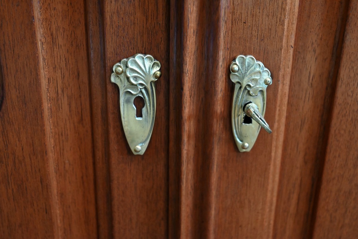 En retrait aux extrémités, deux étroits cabinets aux portes vitrées et panneautées dans le même goût, sont également munis de serrures authentiques, en état de fonctionnement, avec clés et entrées. Ils sont équipés, chacun, de trois étagères réglables, posées sur crémaillères, et au besoin interchangeables. En parties hautes, des montants arqués soutiennent une tablette.