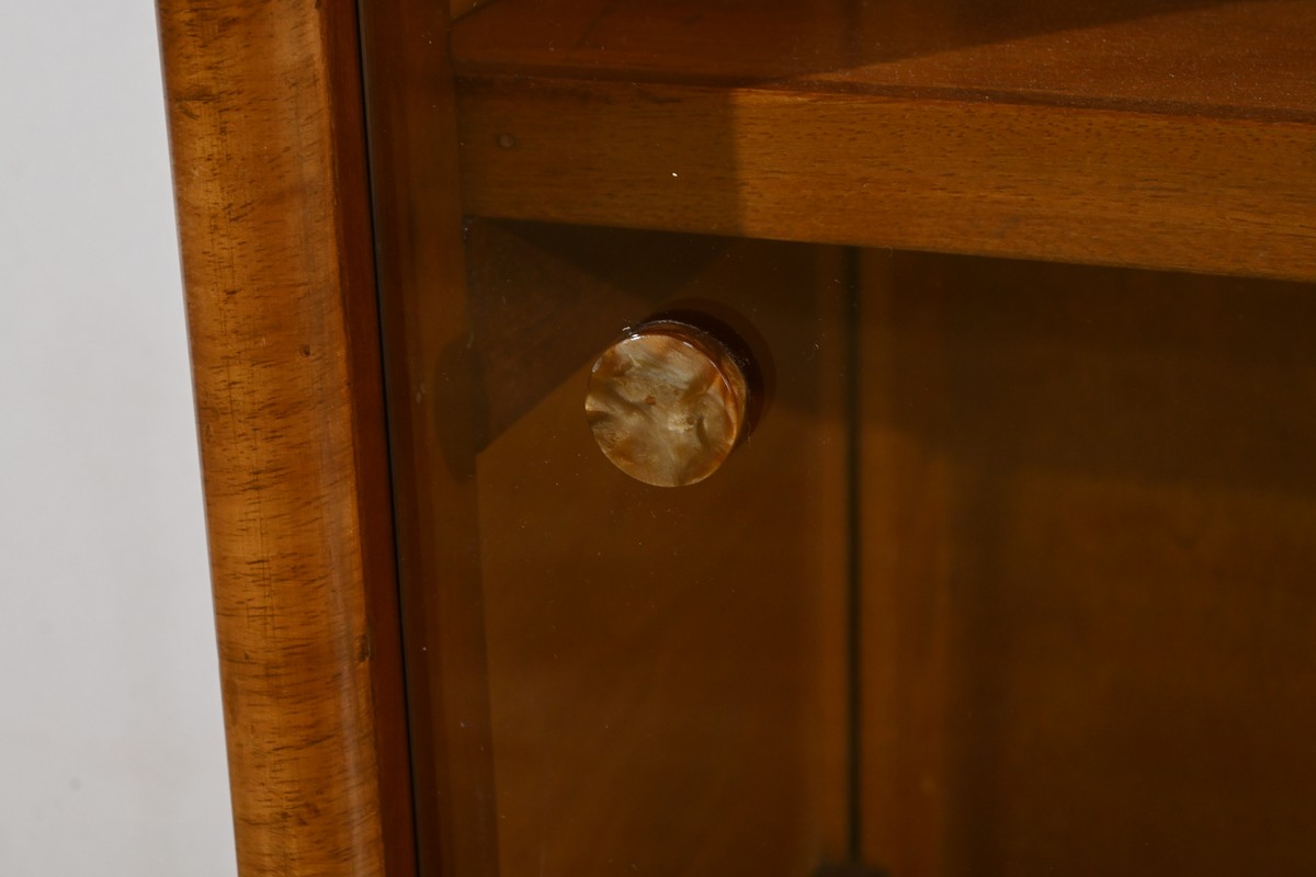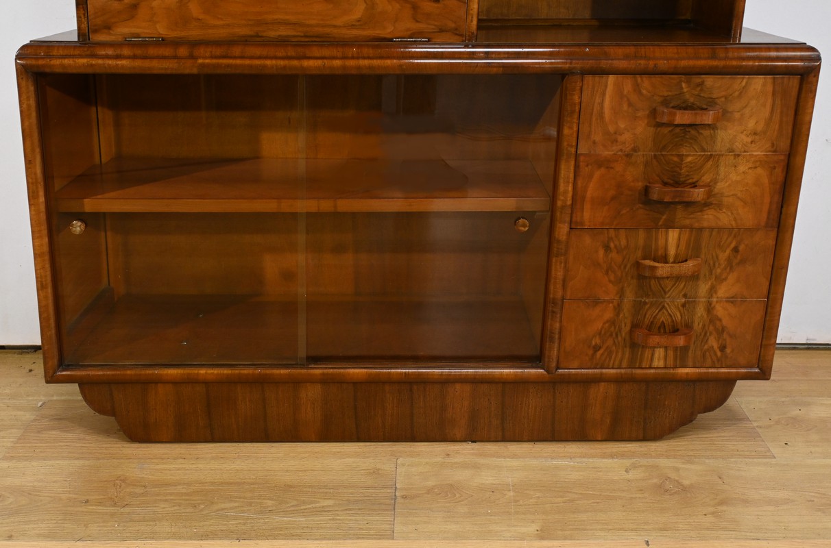 Ce meuble vitré en placage de ronce de noyer, datant de 1940 à la fin de l’époque Art Déco, est une pièce remarquable de la marque Rurka.