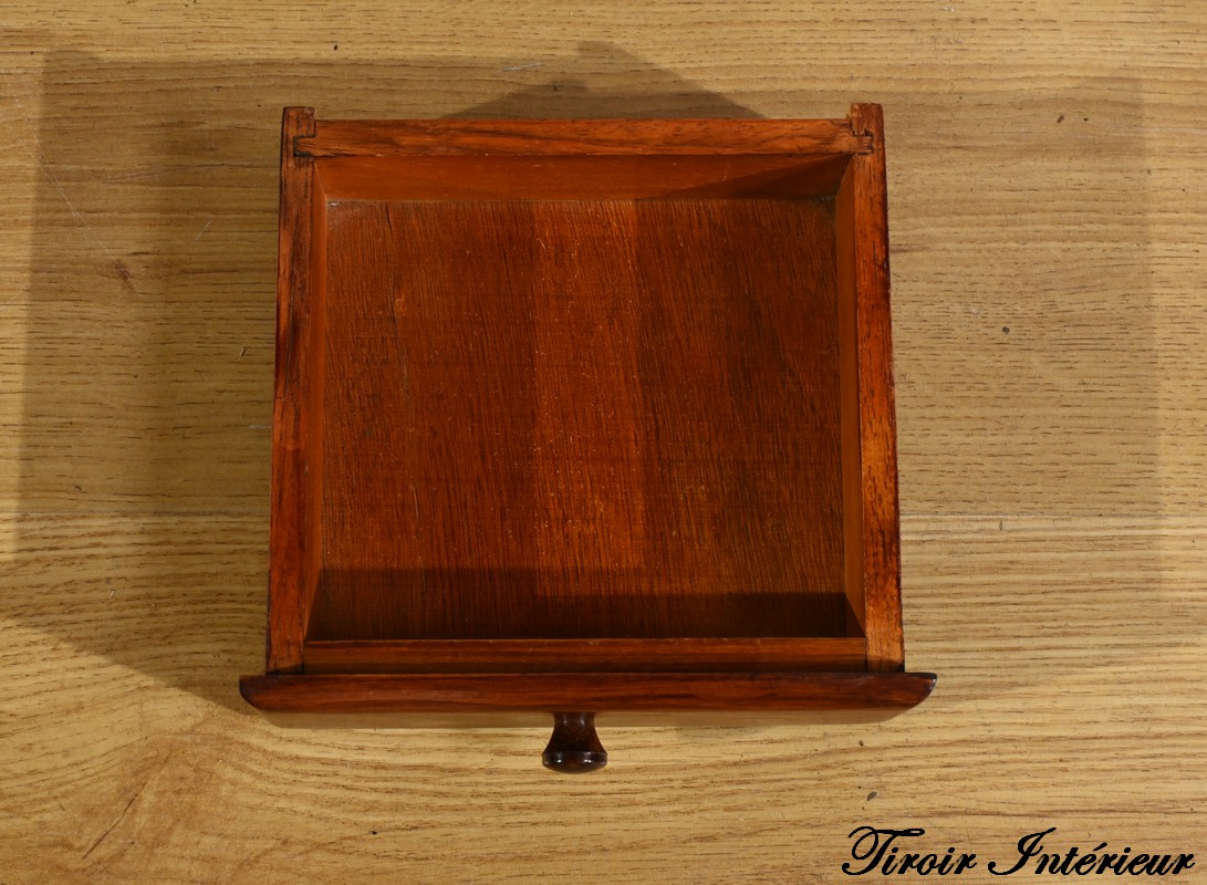 La partie supérieure du meuble est composée de deux caissons : l’un est ouvert, idéal pour exposer des objets décoratifs ou des livres, tandis que l’autre est à abattant avec serrure, offrant une sécurité supplémentaire pour les objets précieux.