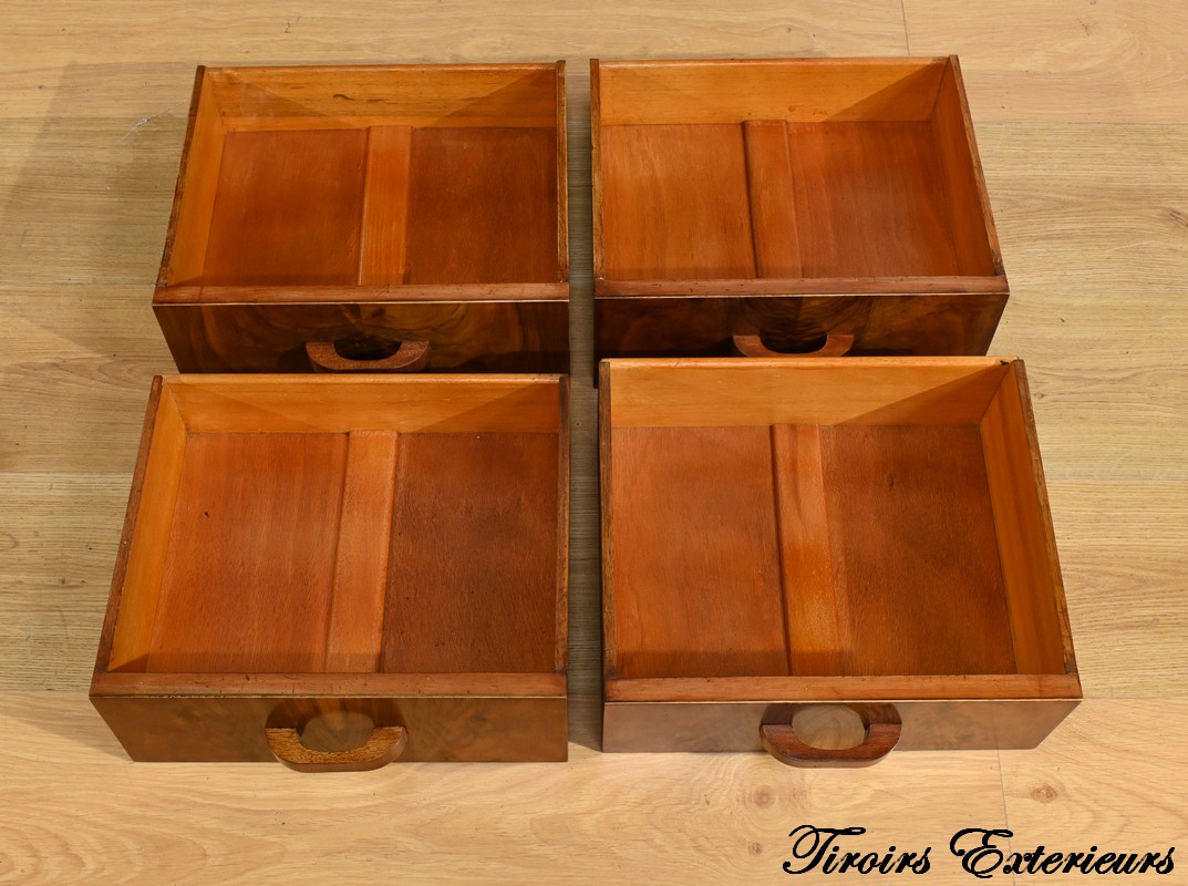 Sur le côté droit, il dispose de quatre tiroirs, dont trois sont de taille identique et un légèrement plus haut, permettant de ranger des articles de différentes tailles.