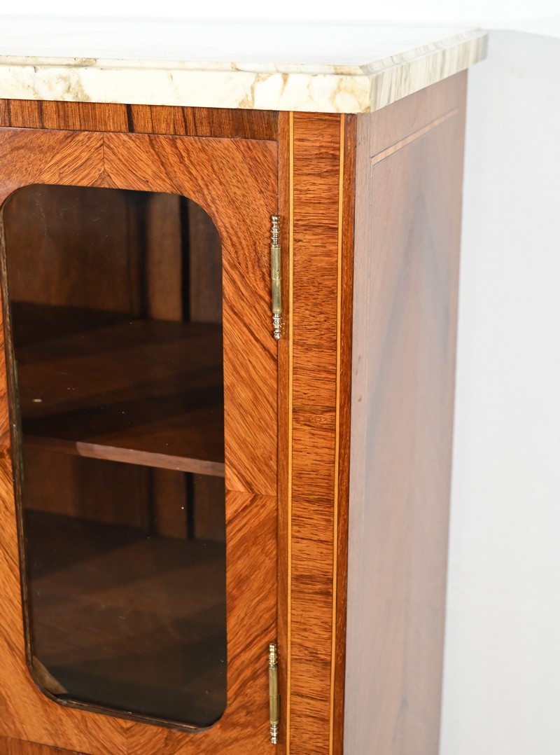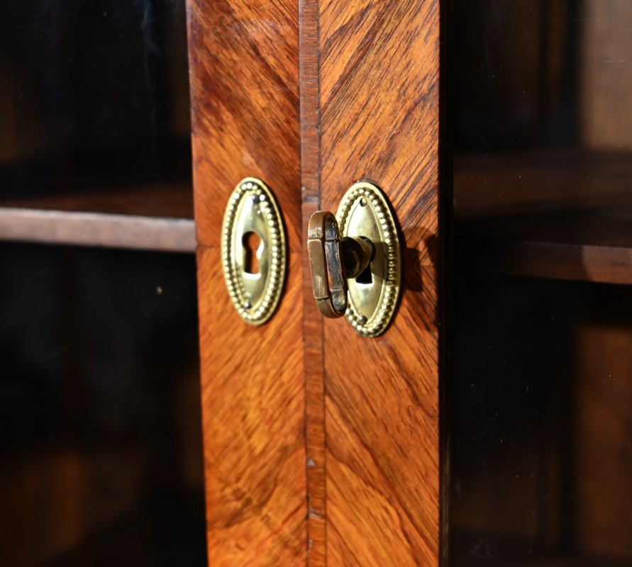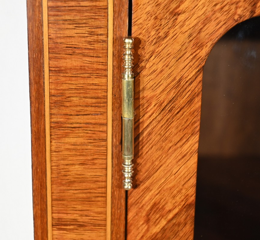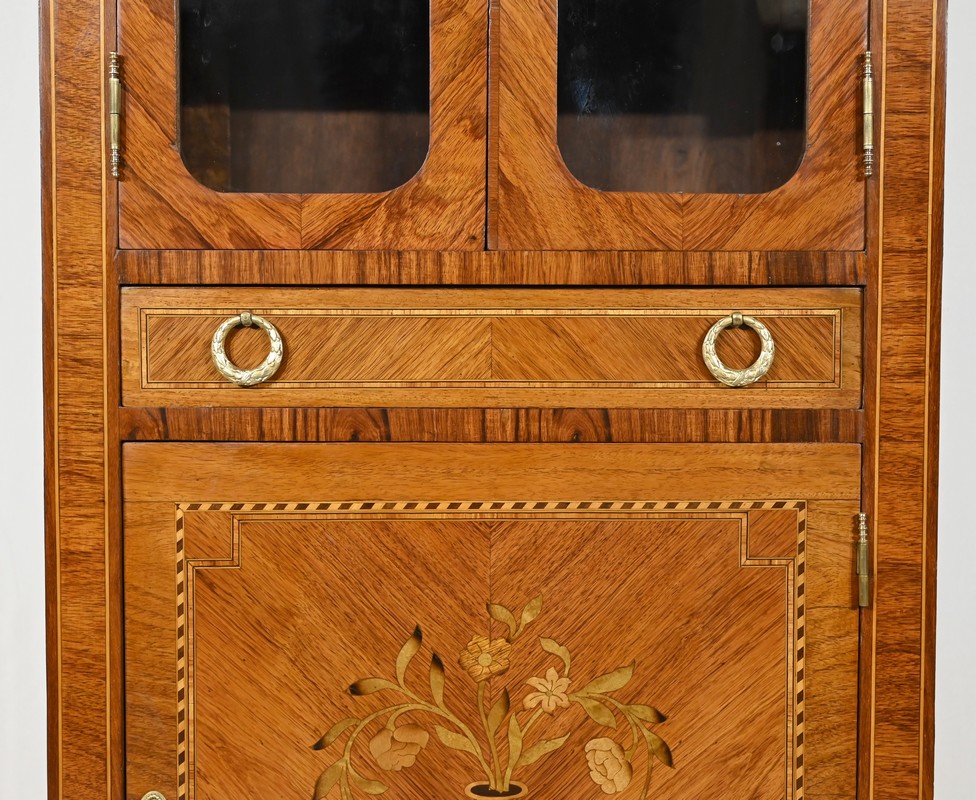 Ce meuble vitrine en bois de rose plaqué ouvre, en partie supérieure, par une double porte vitrée dont le placage est disposé en ailes de papillon.