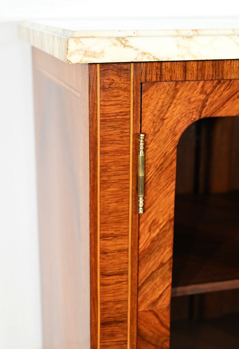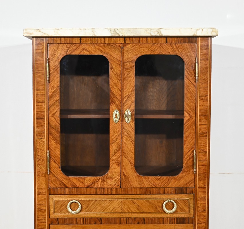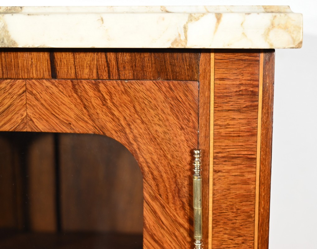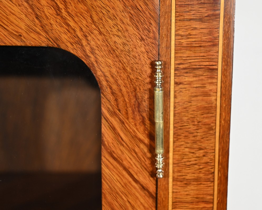 Ce meuble vitrine en bois de rose plaqué ouvre, en partie supérieure, par une double porte vitrée dont le placage est disposé en ailes de papillon.