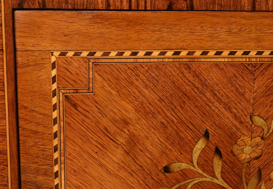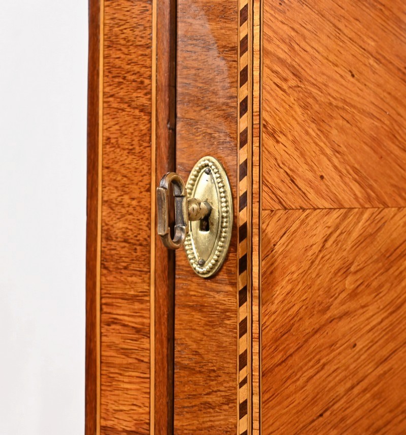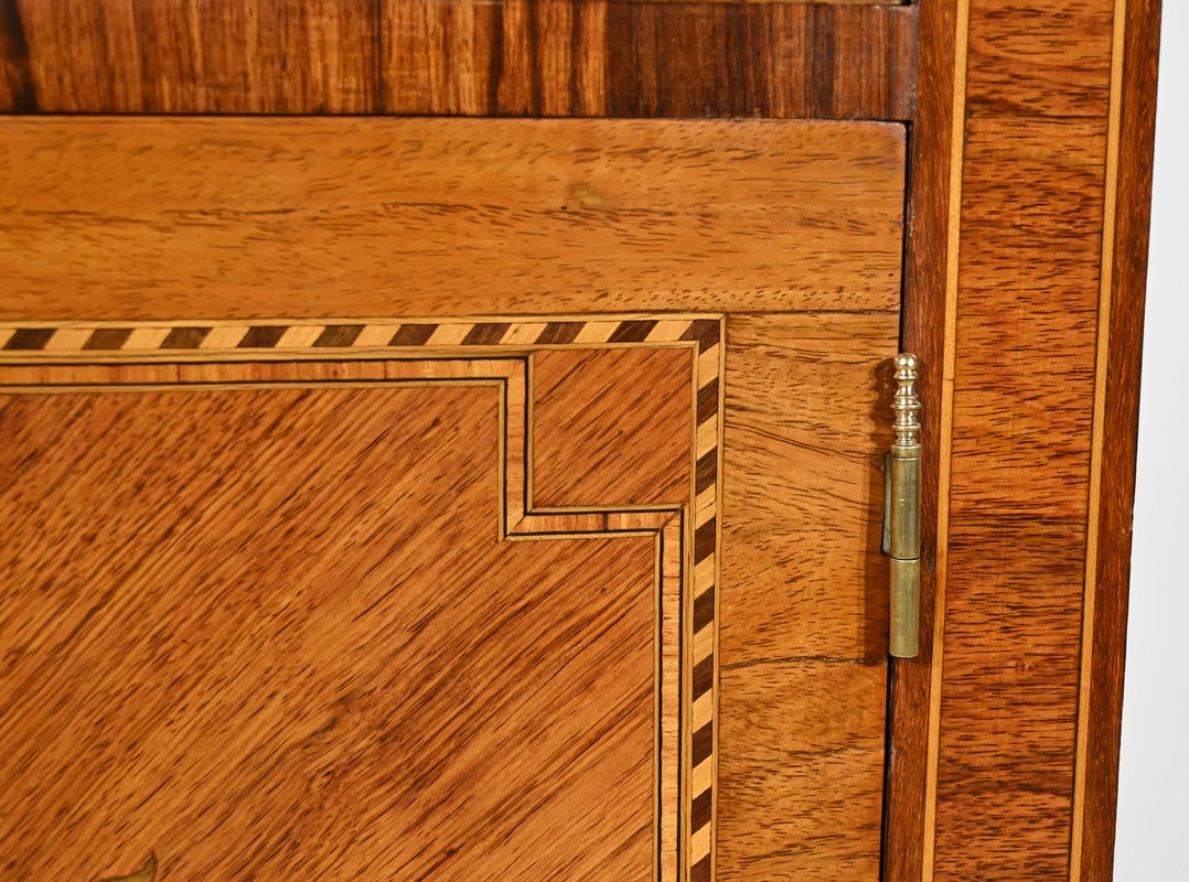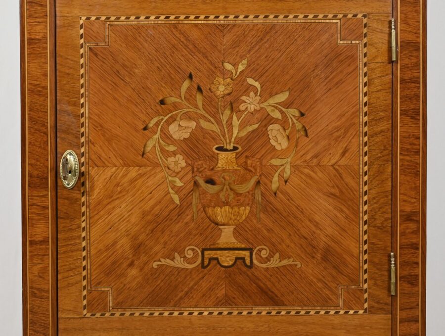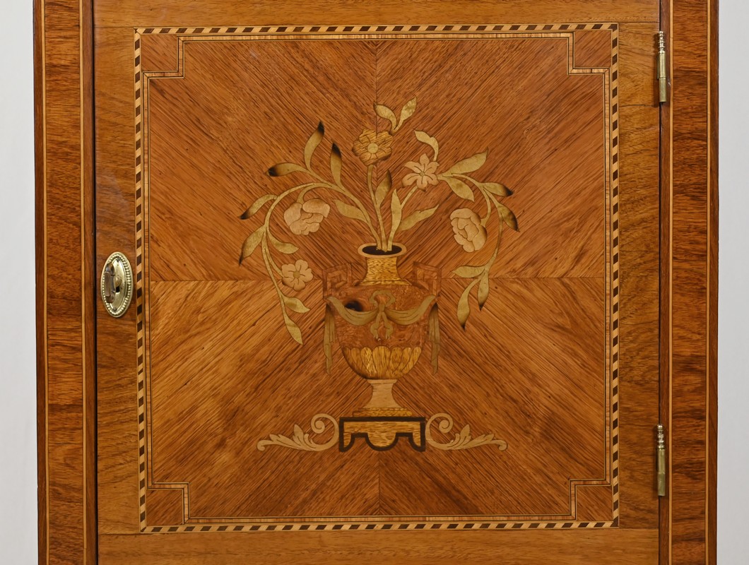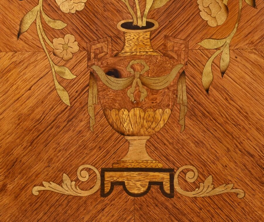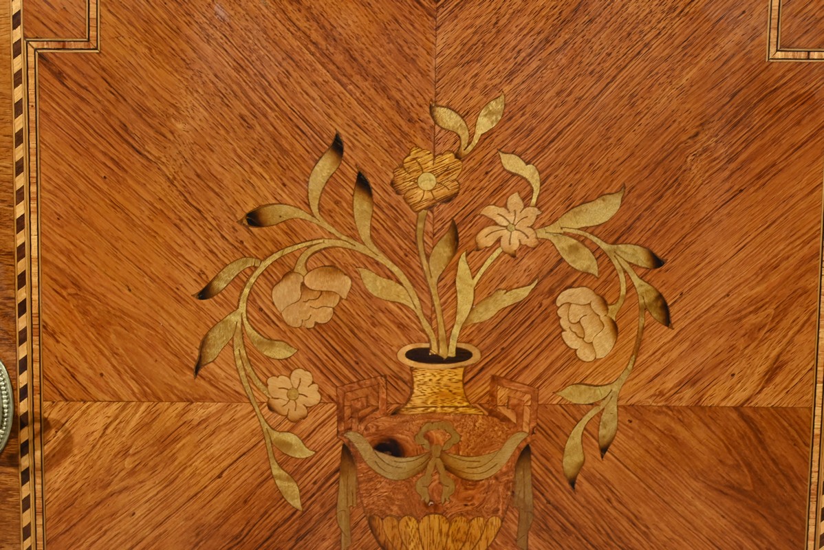 Cette ouverture est marquetée d’un décor de vase pansue avec composition florale et de filets de citronnier et d’amarante avec angles à la grecque.