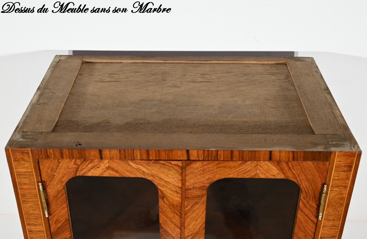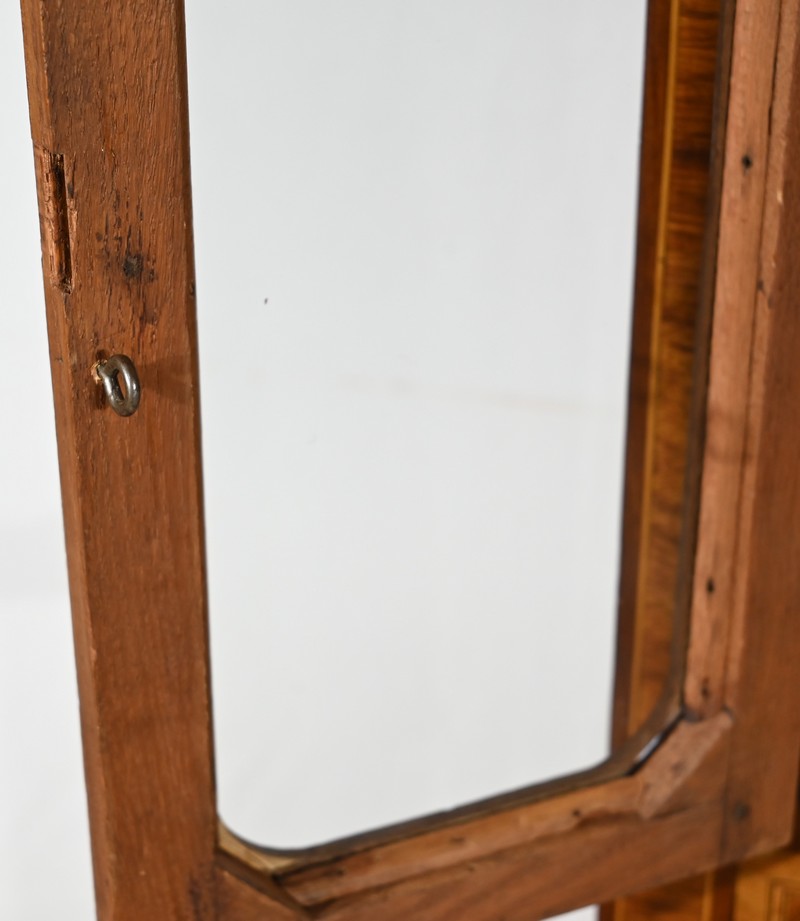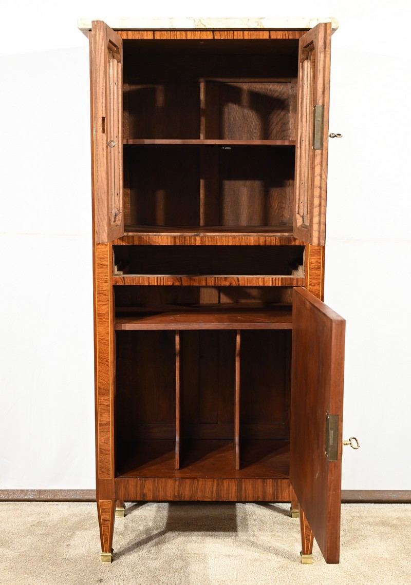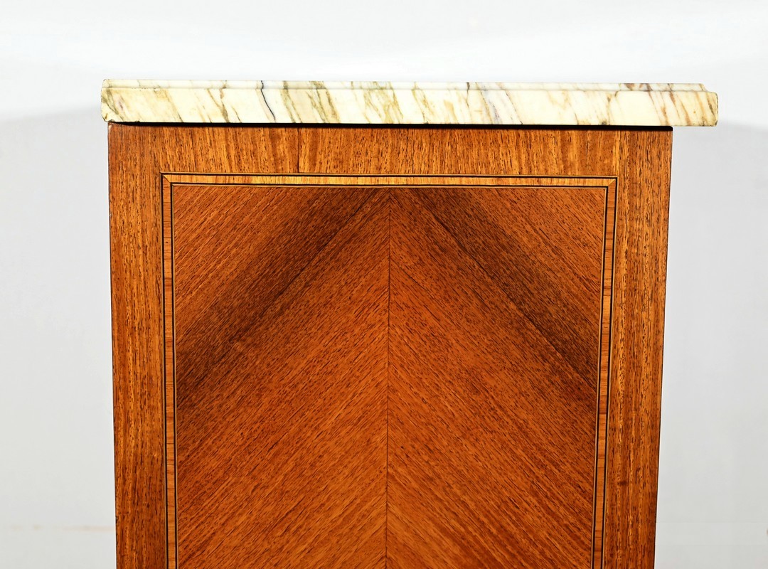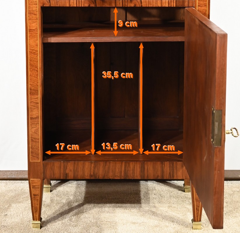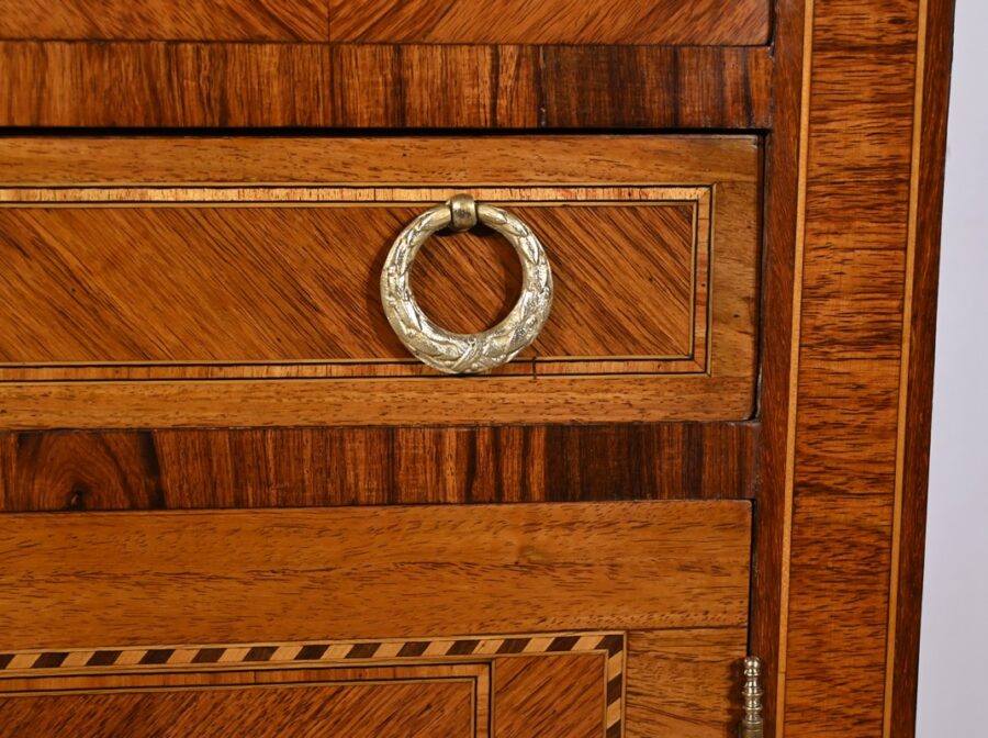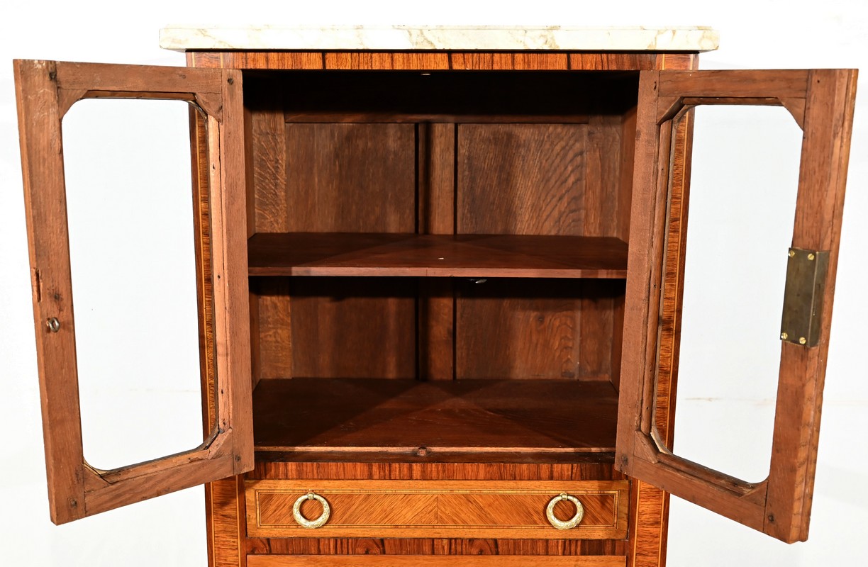 Cette ouverture est marquetée d’un décor de vase pansue avec composition florale et de filets de citronnier et d’amarante avec angles à la grecque.