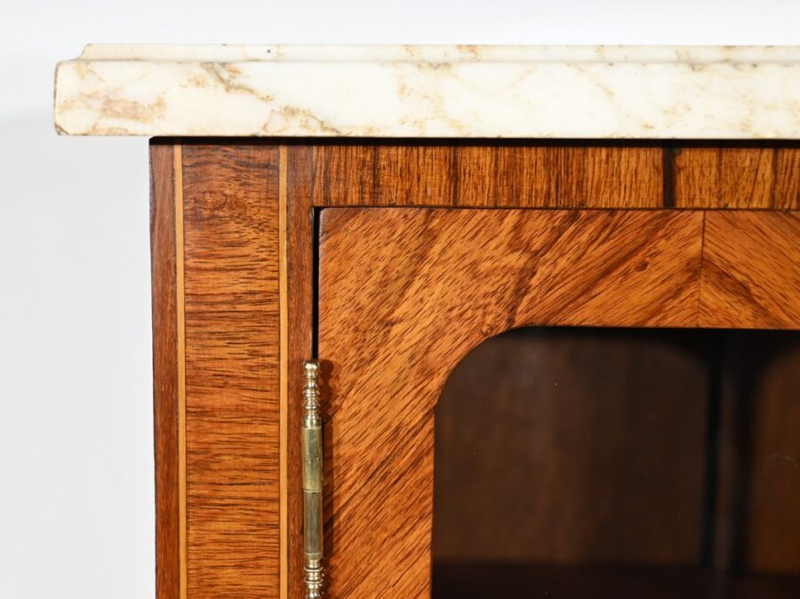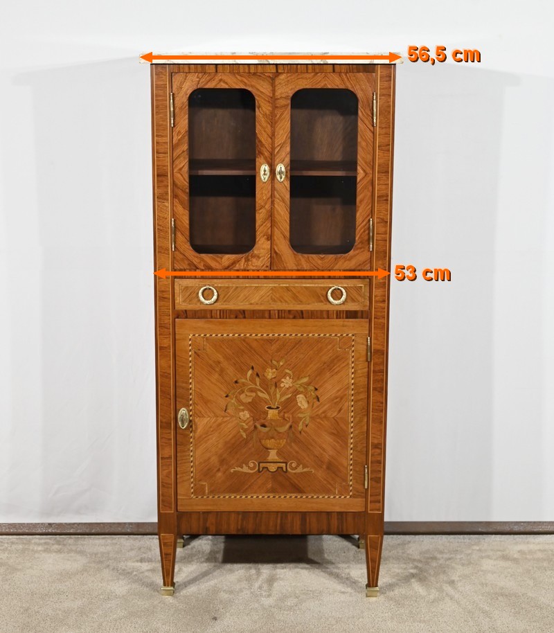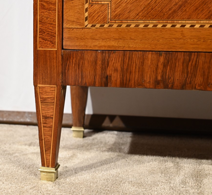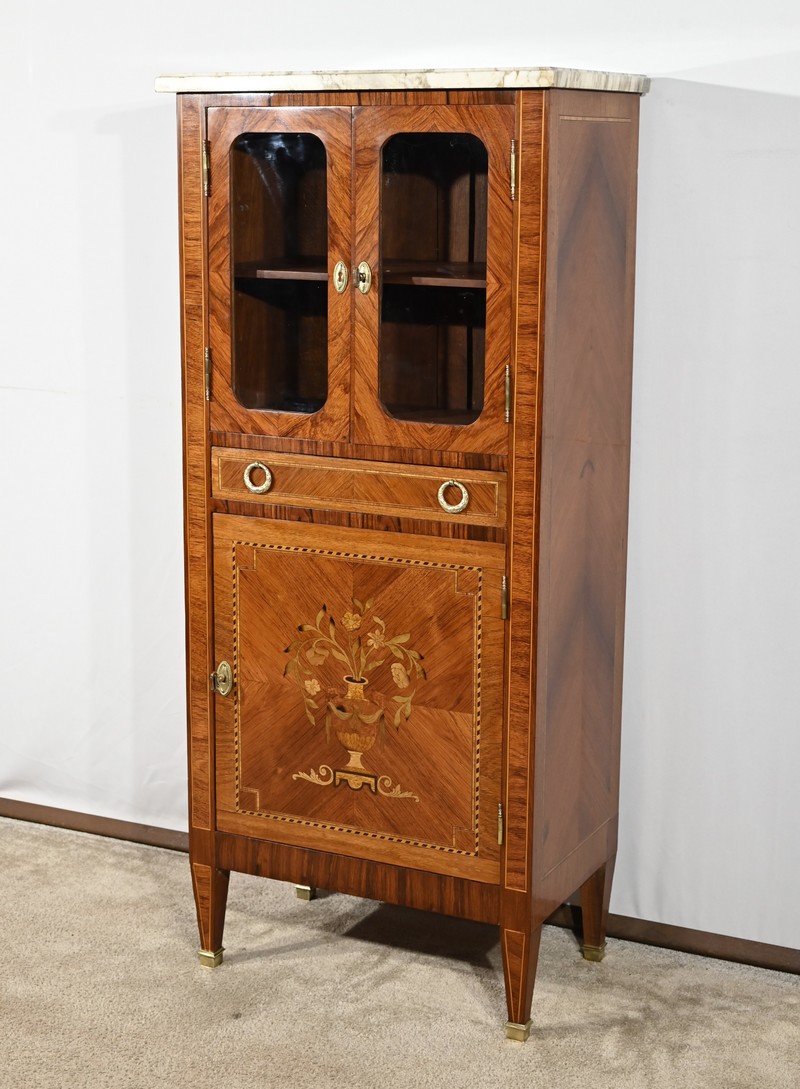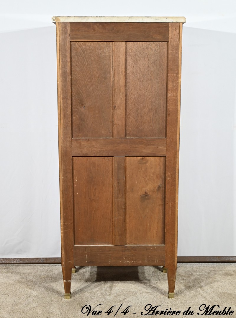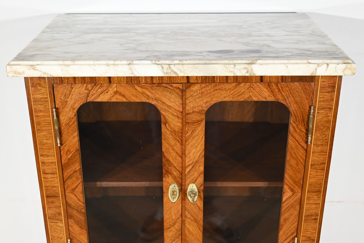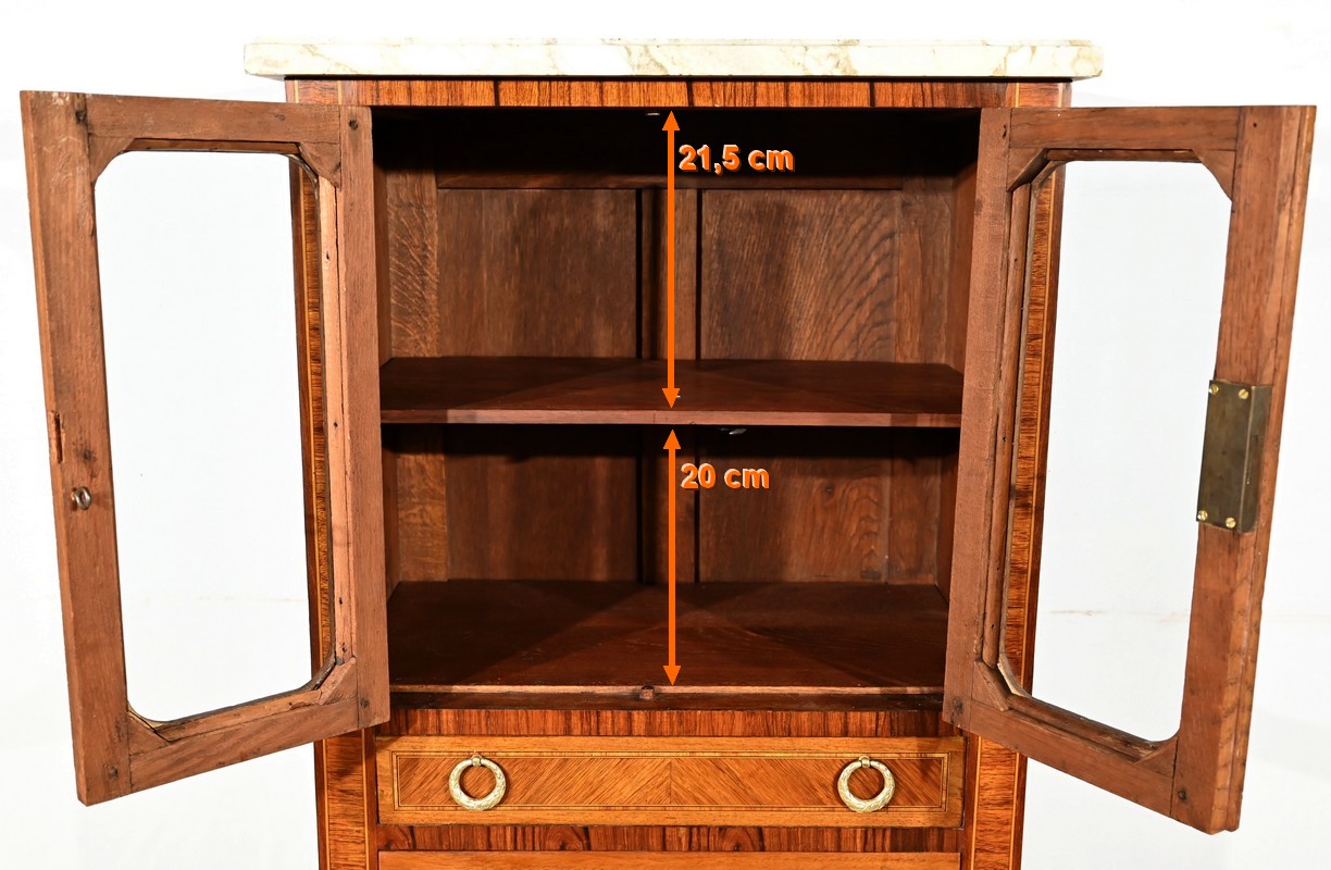 Cette ouverture est marquetée d’un décor de vase pansue avec composition florale et de filets de citronnier et d’amarante avec angles à la grecque.