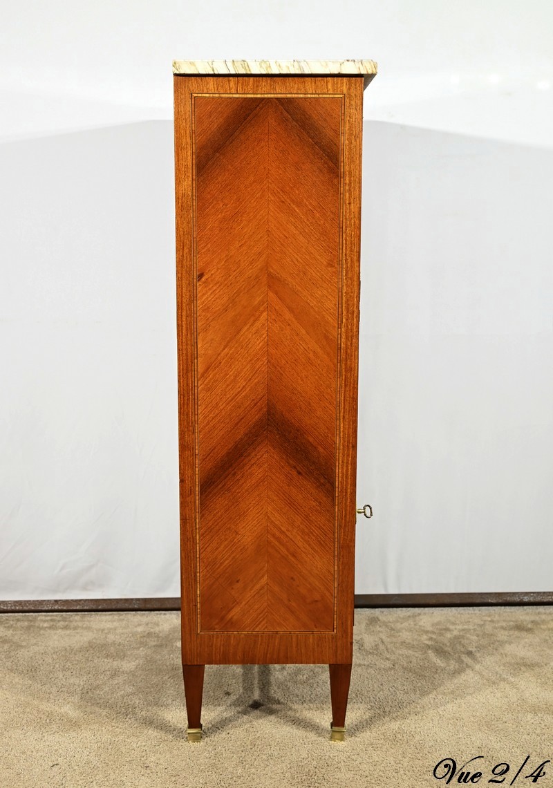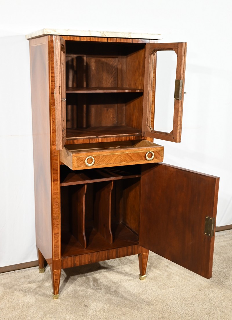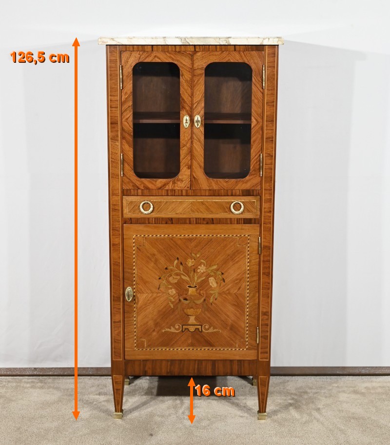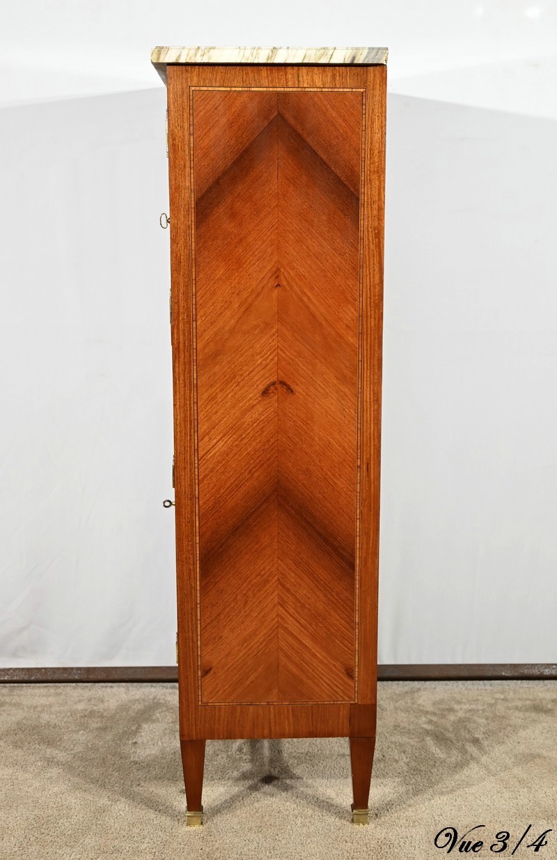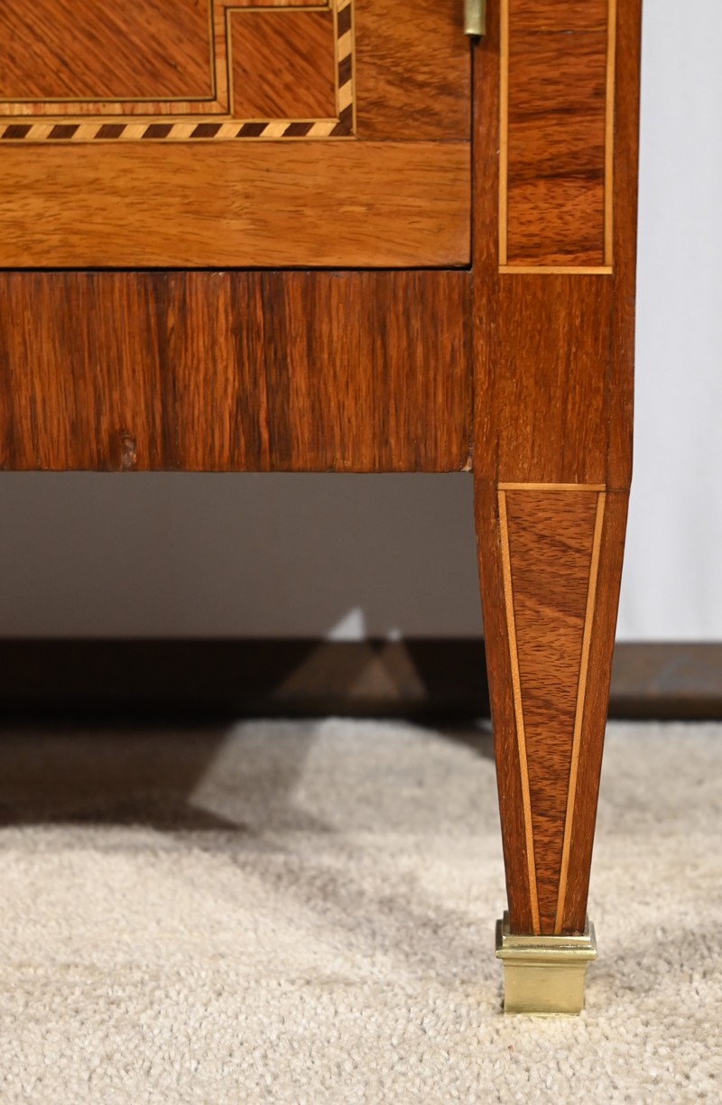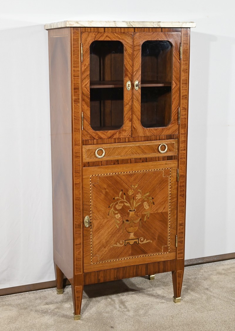 Cette ouverture est marquetée d’un décor de vase pansue avec composition florale et de filets de citronnier et d’amarante avec angles à la grecque.