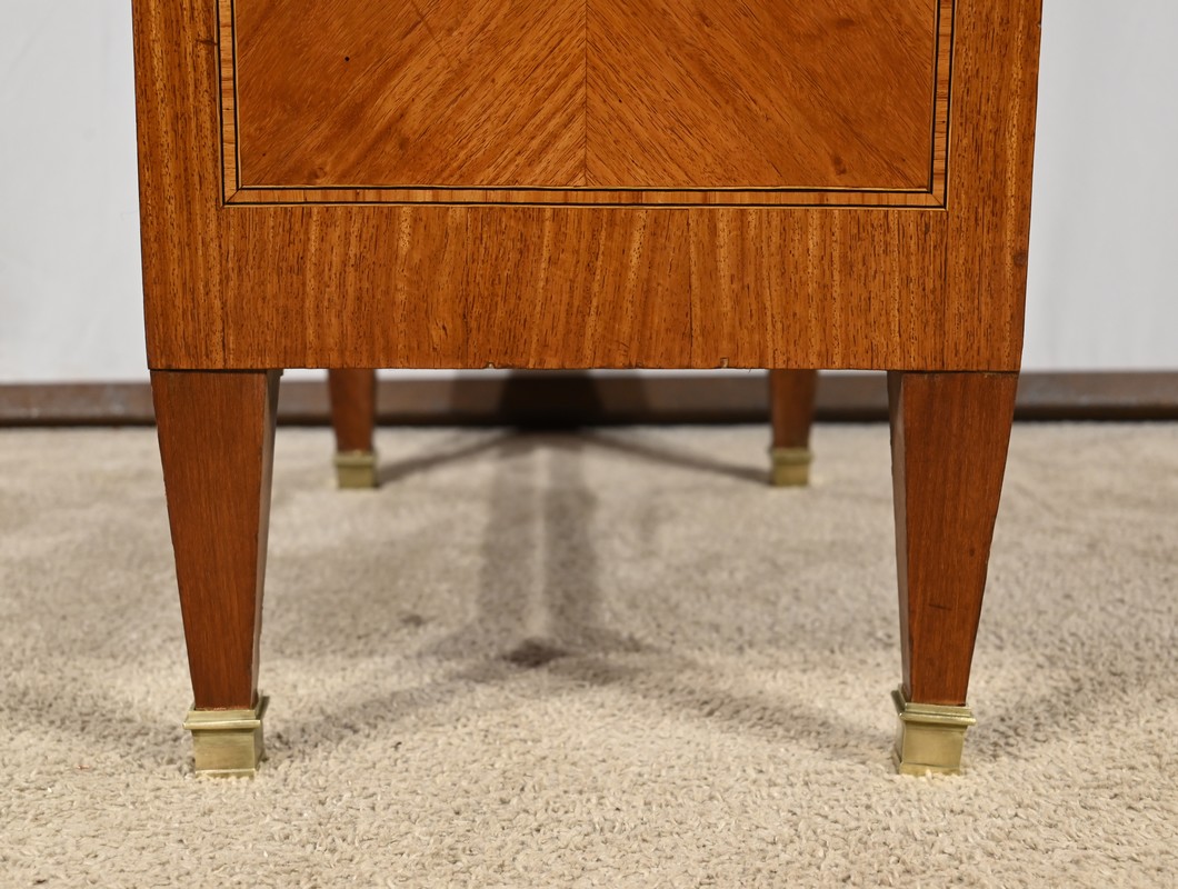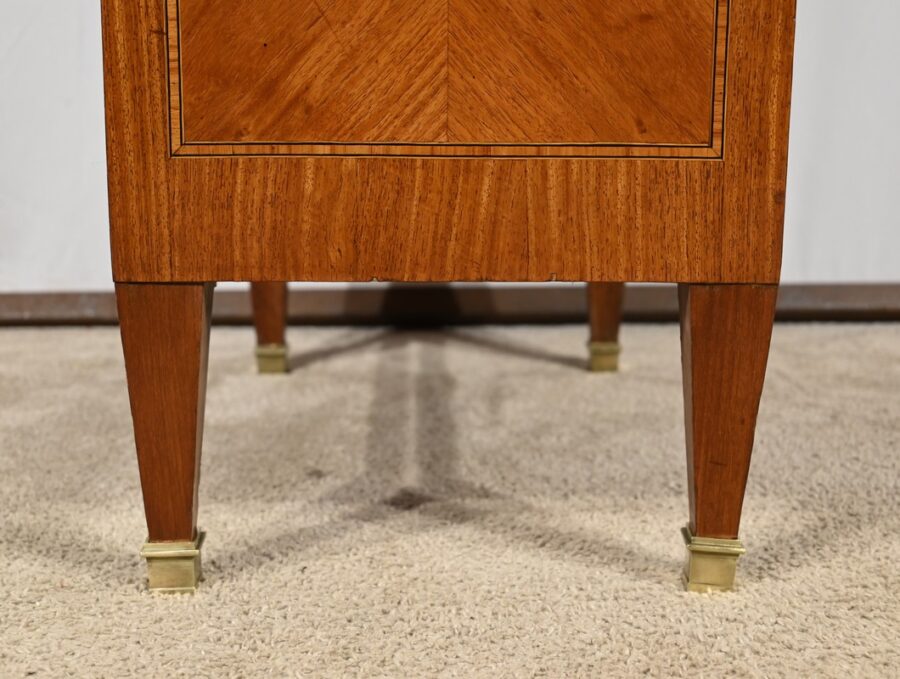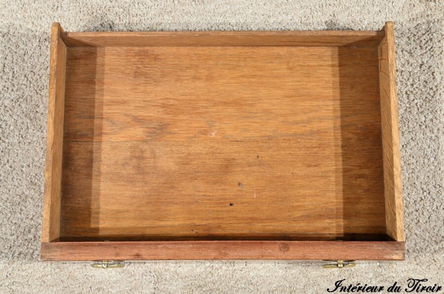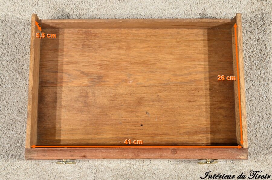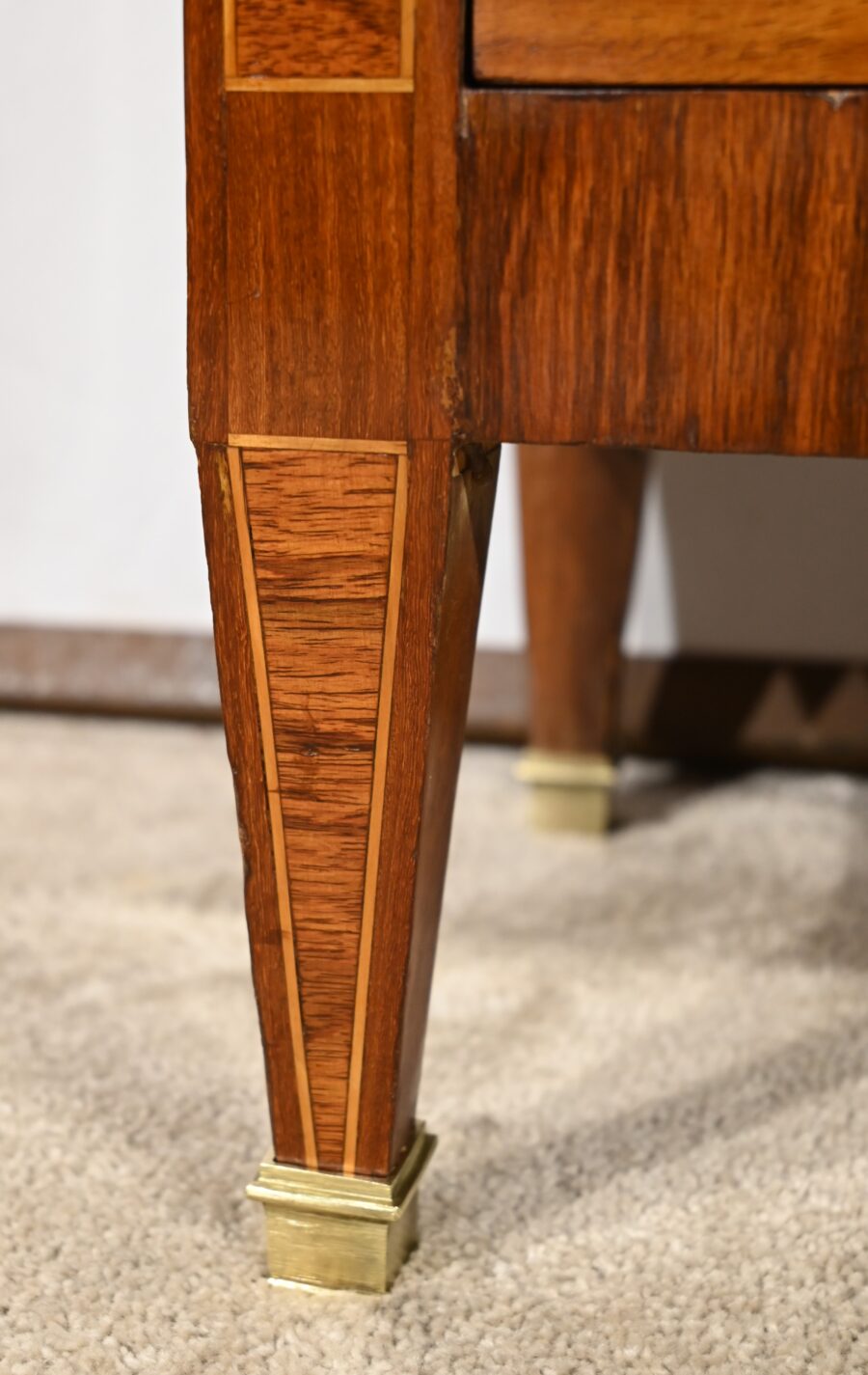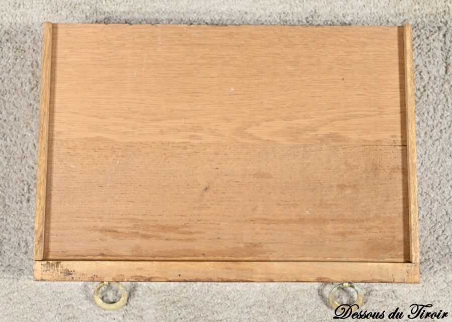 En dessous, le tiroir en placage déployé présente une bande de pourtour en acajou soulignée par des filets de citronnier et d’ébène.