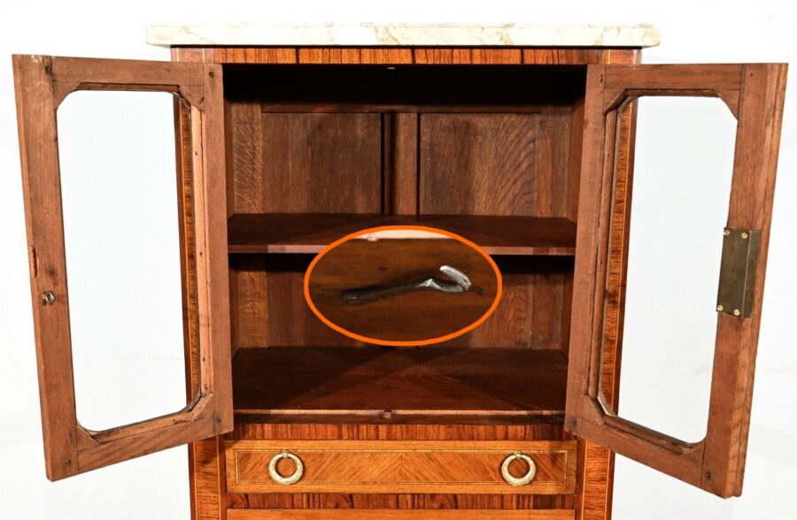 Ce meuble ouvre également, en partie inférieure, par une porte qui de la même manière est montée sur des pommelles laiton et est muni d’une serrure avec entrée similaire et clé.