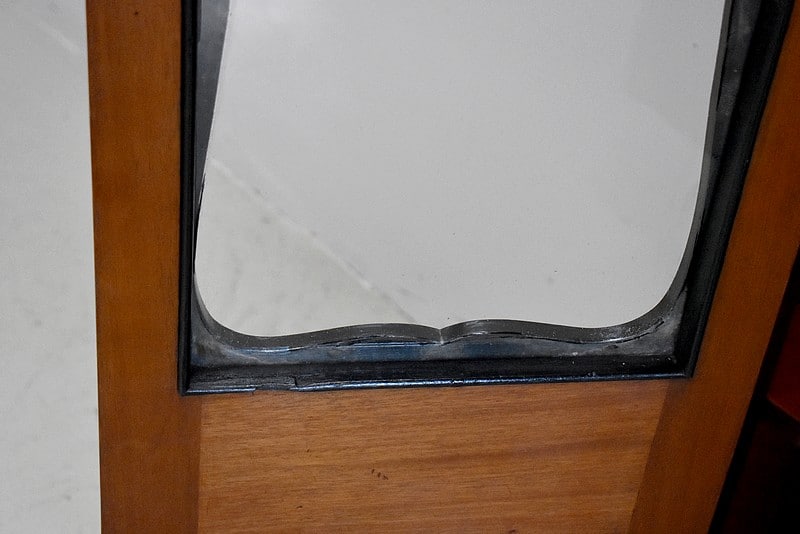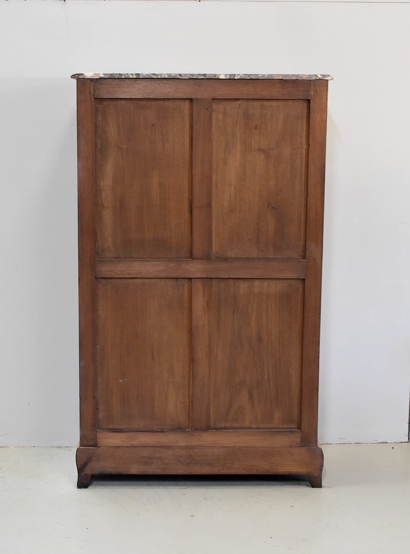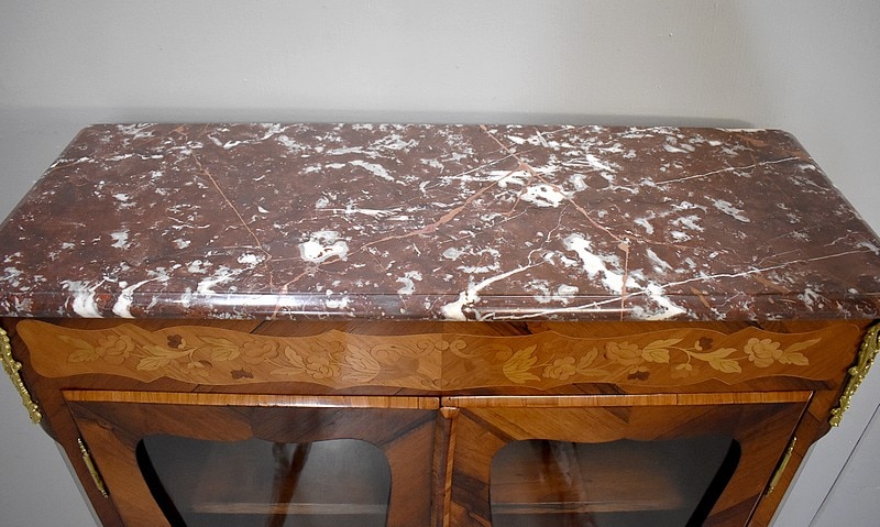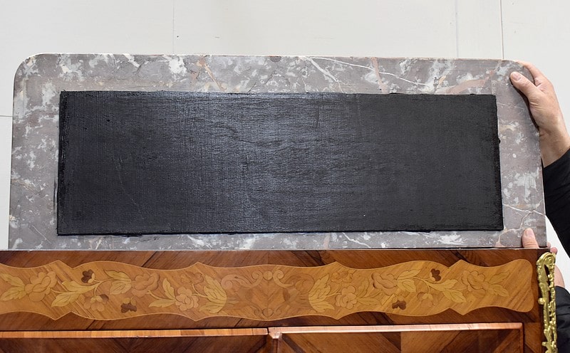 Son dessus en marbre d’origine Griotte rouge de Belgique est mouluré à bec de corbin. Il a été restauré et relustré et renforcé d’un panneau de bois par le dessous.