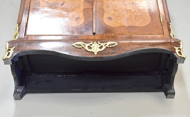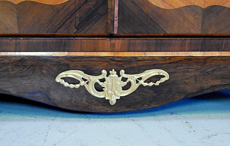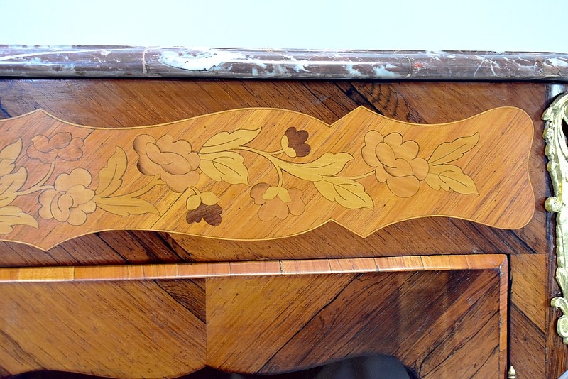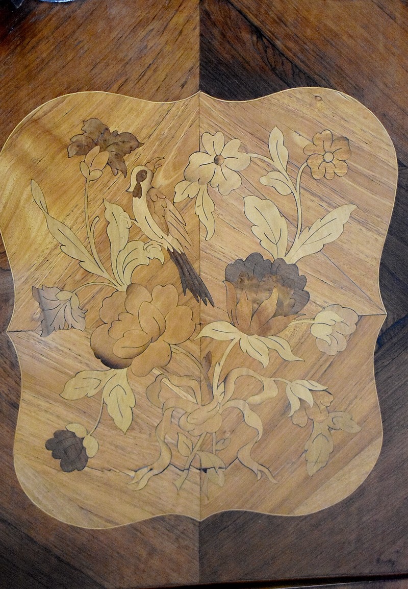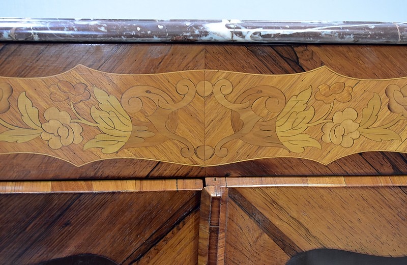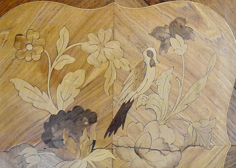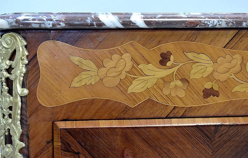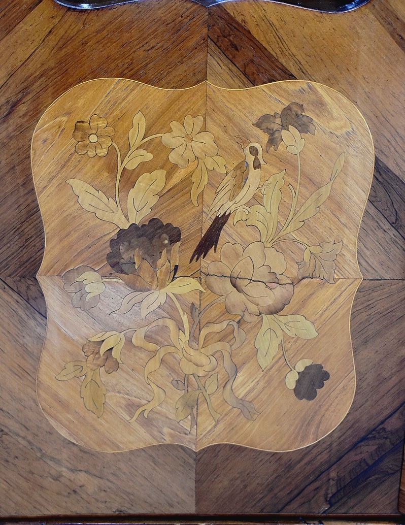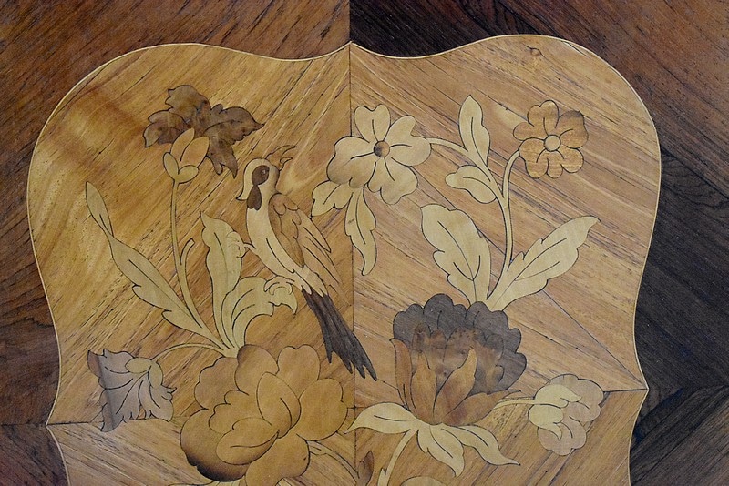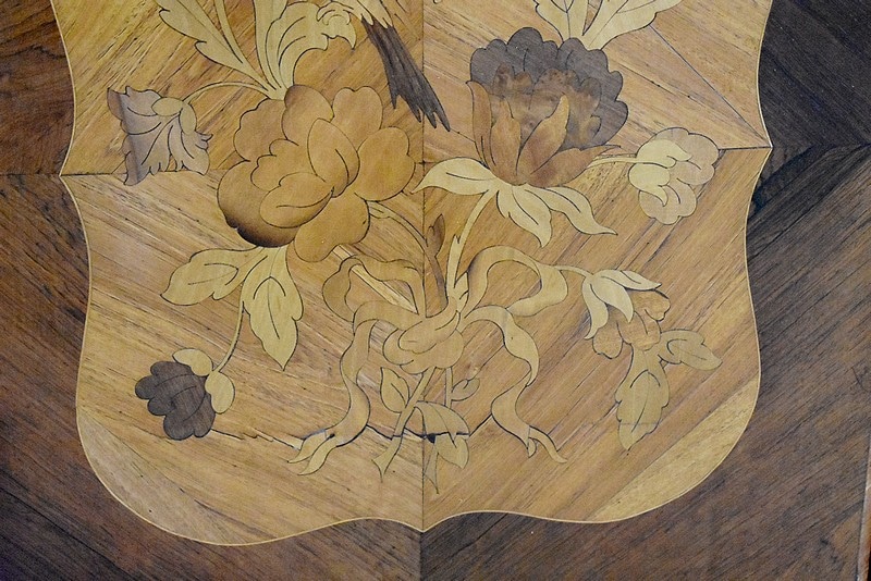 Sa traverse haute est marquetée de motifs floraux en bois de Citronnier et divers bois clairs.