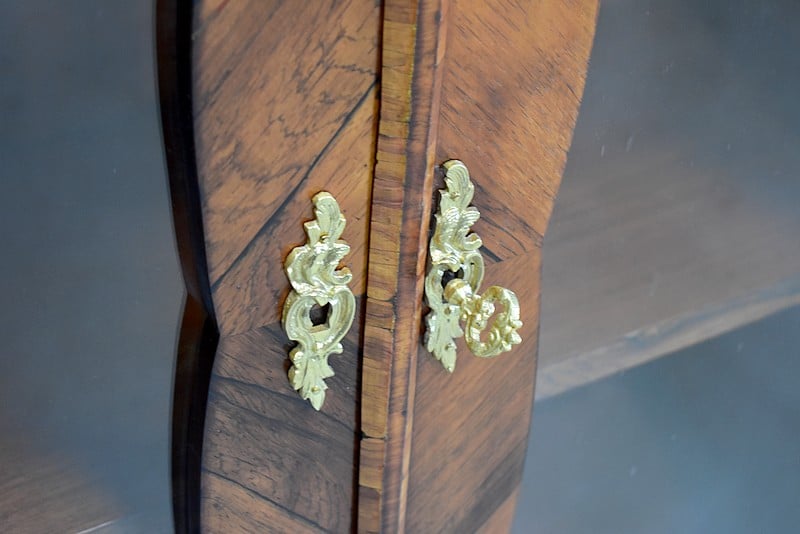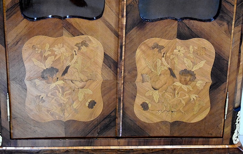 Elle ouvre par deux portes fermant à clef également marquetées de motifs floraux comprenant aussi un oiseau. La serrure haut et bas est gravée de son artisan.