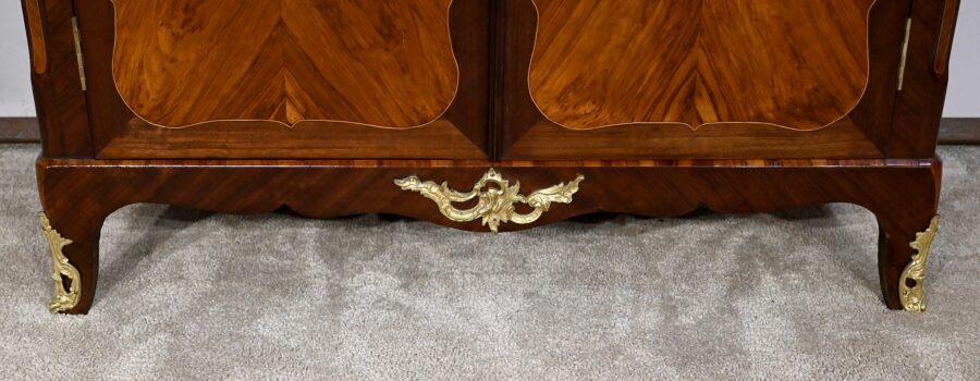Ce meuble raffiné est composé de deux portes vitrées. La partie basse de celles-ci est pleine et agrémentée d’un placage de quatre feuilles de bois de rose disposées en aile de papillon. Cette composition mouvementée est entourée d’un filet en citronnier entouré d’acajou.