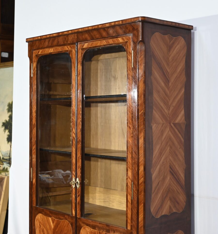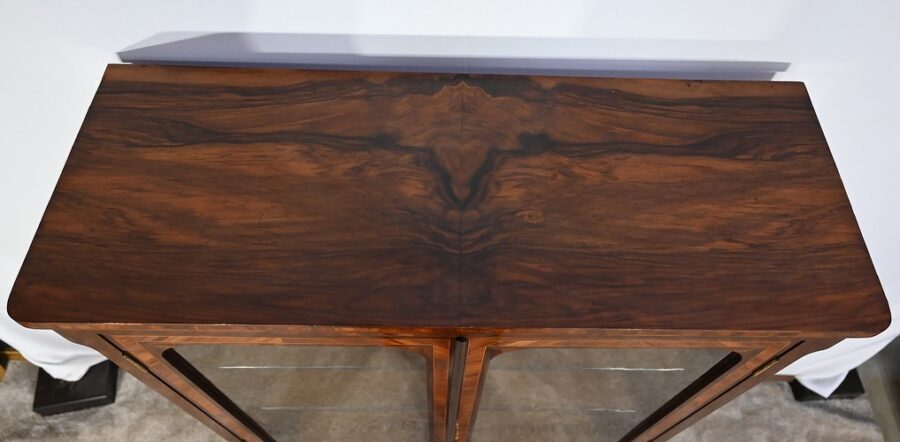 Belle vitrine en marqueterie de bois de rose et d’acajou, issue d’un atelier parisien du milieu du XIXe siècle.