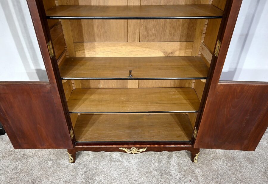 Cette petite bibliothèque est dotée de montants à pans coupés incrustés d’une marqueterie de bois de rose disposé en diagonale entouré d’un filet de citronnier. Le devant du pied en acajou est également travaillé en diagonal. La base légèrement en saillie, à découpe en façade, est accompagné de chaque côté d’un pied légèrement à bosse habillé d’un bronze d’origine. Nous retrouvons un beau bronze sur la traverse basse également.