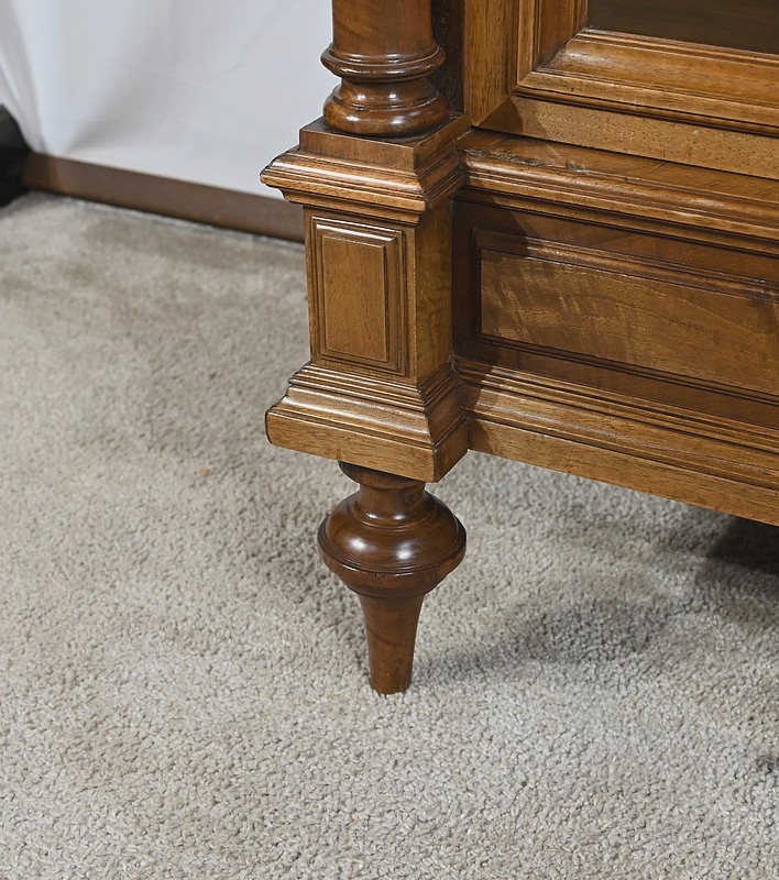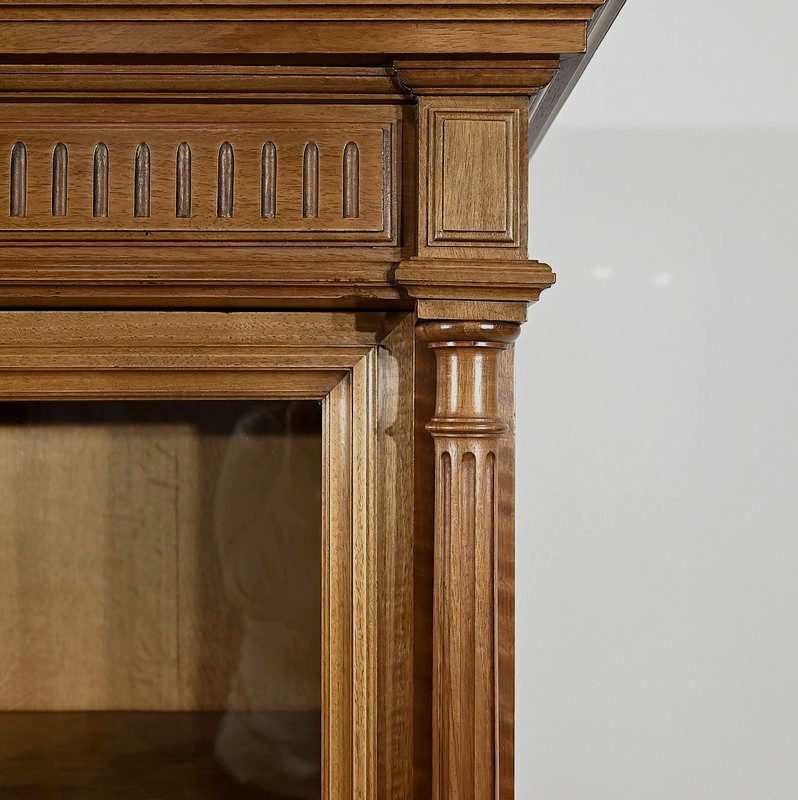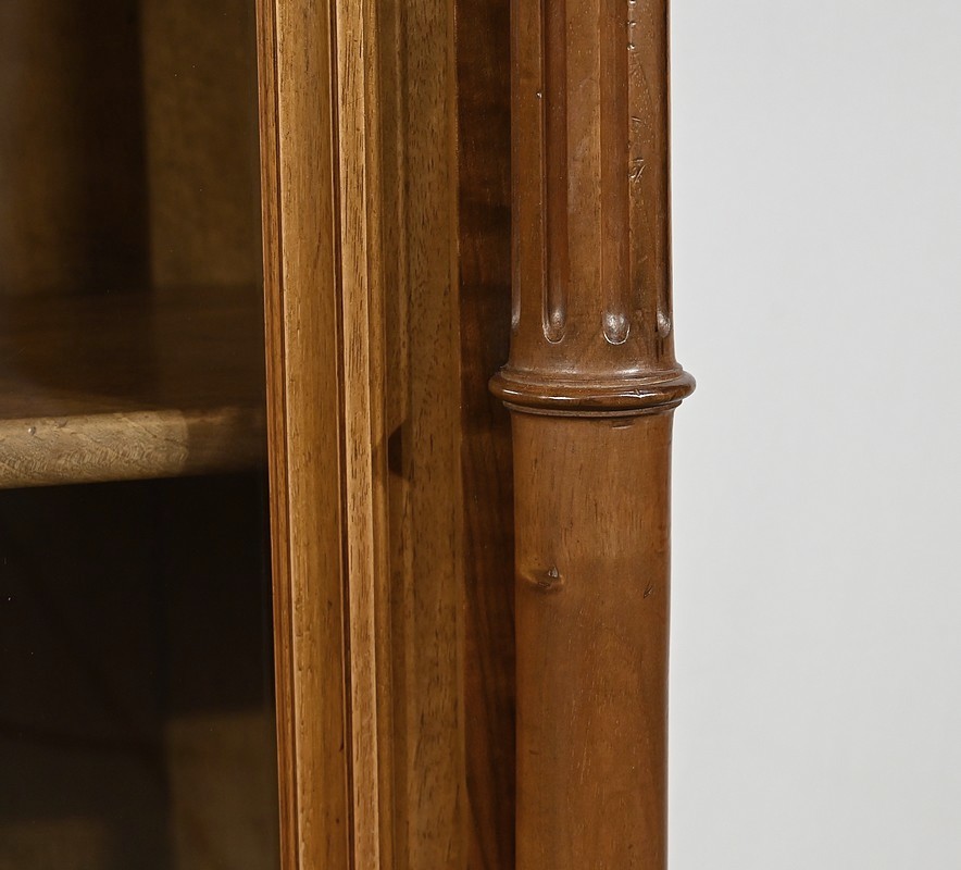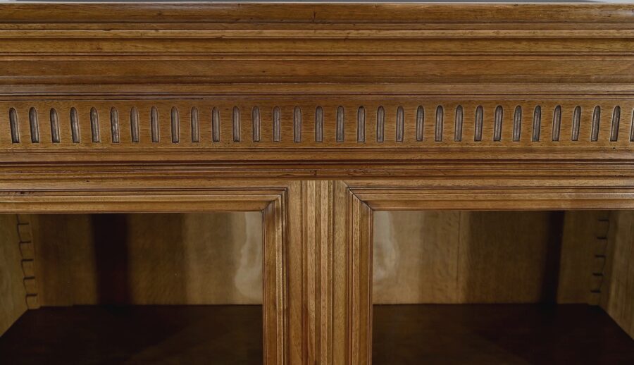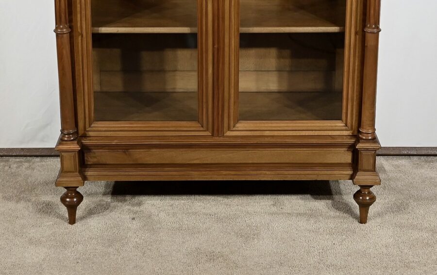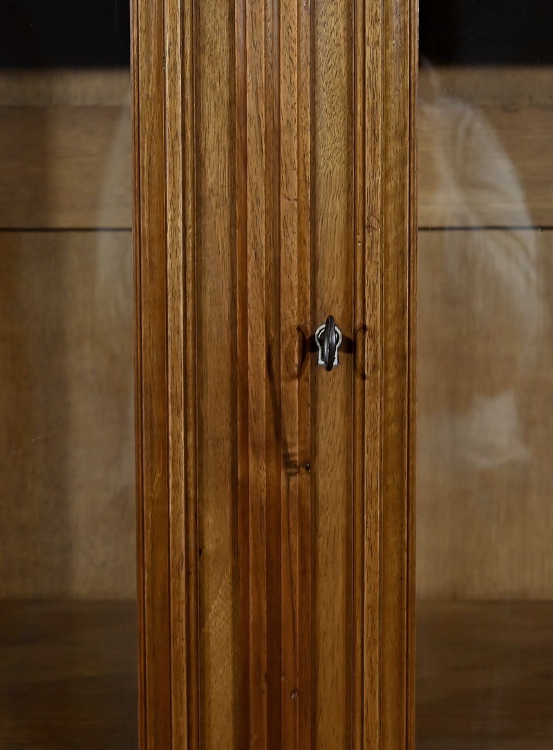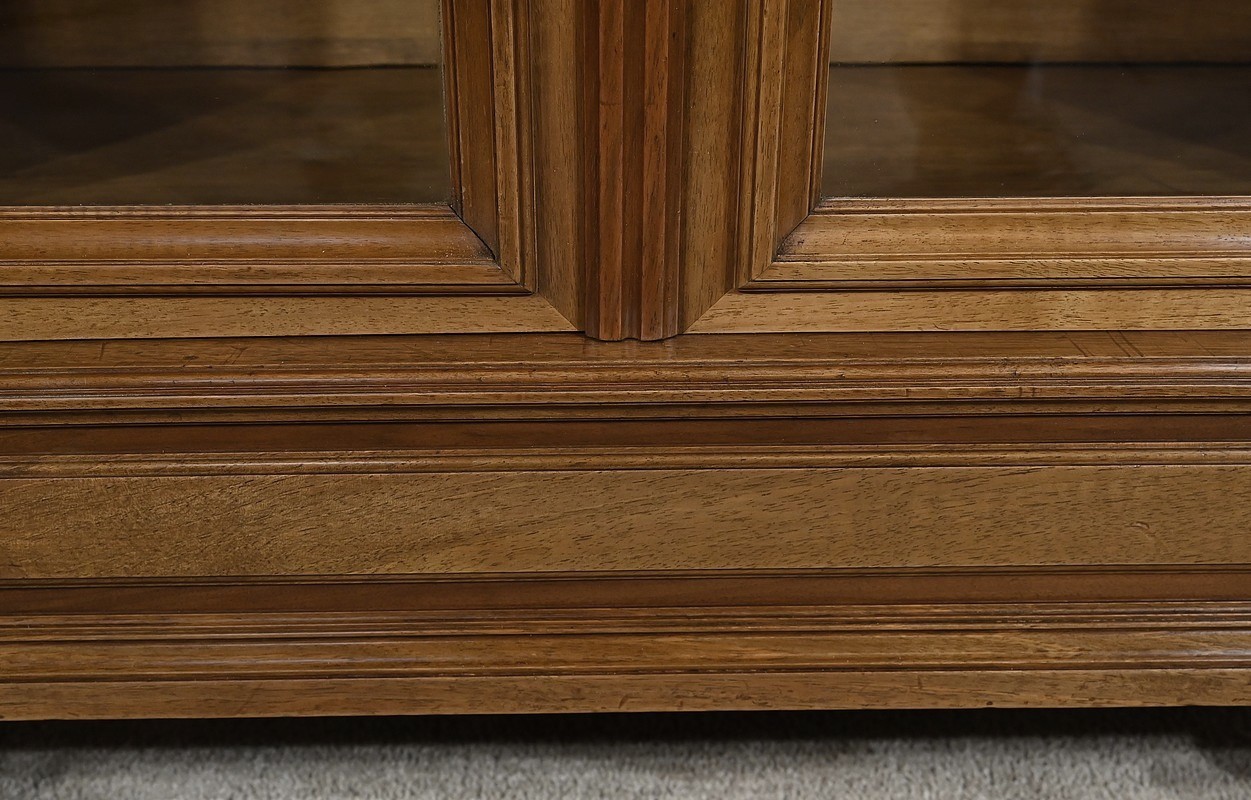 Belle vitrine de fabrication parisienne en noyer blond massif. Ce meuble à hauteur d’appui possède deux portes à cadre à coupe d’onglet avec moulure intérieure saillante et à gorge vers l’intérieur. Nous retrouvons une clé et une serrure d’origine en laiton. L’entrée filet souligne le passage de la clé.