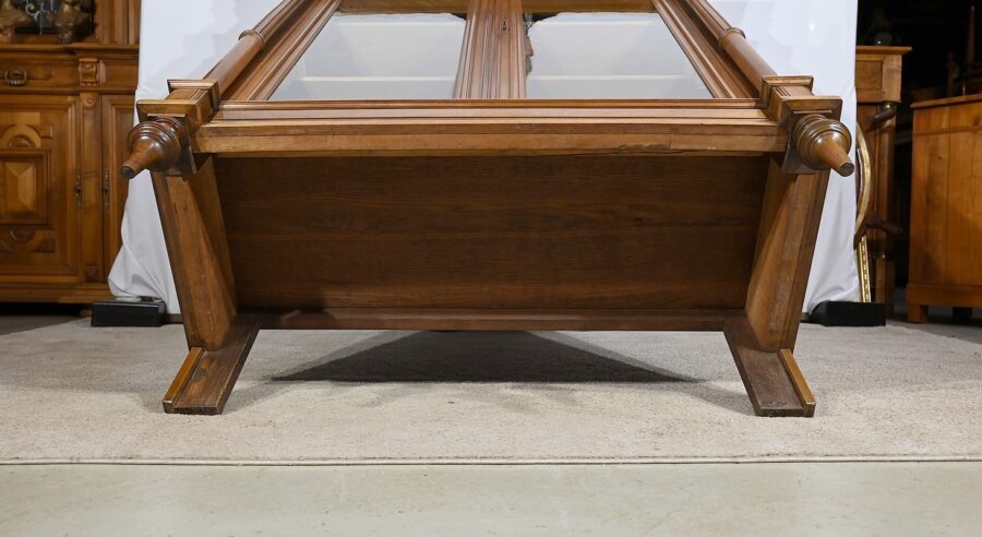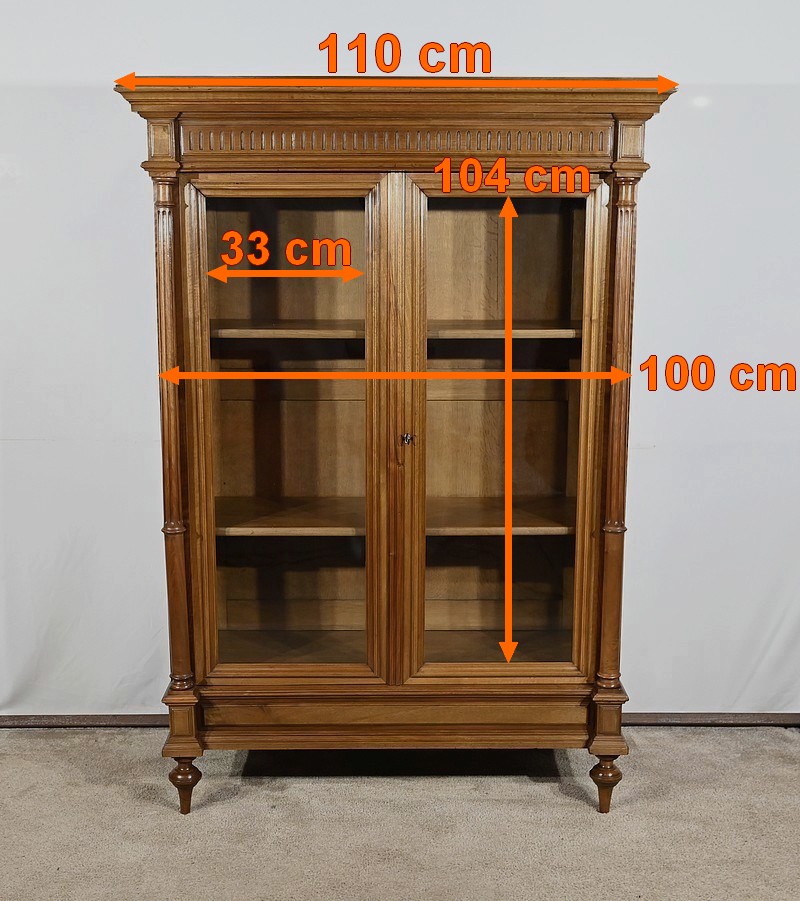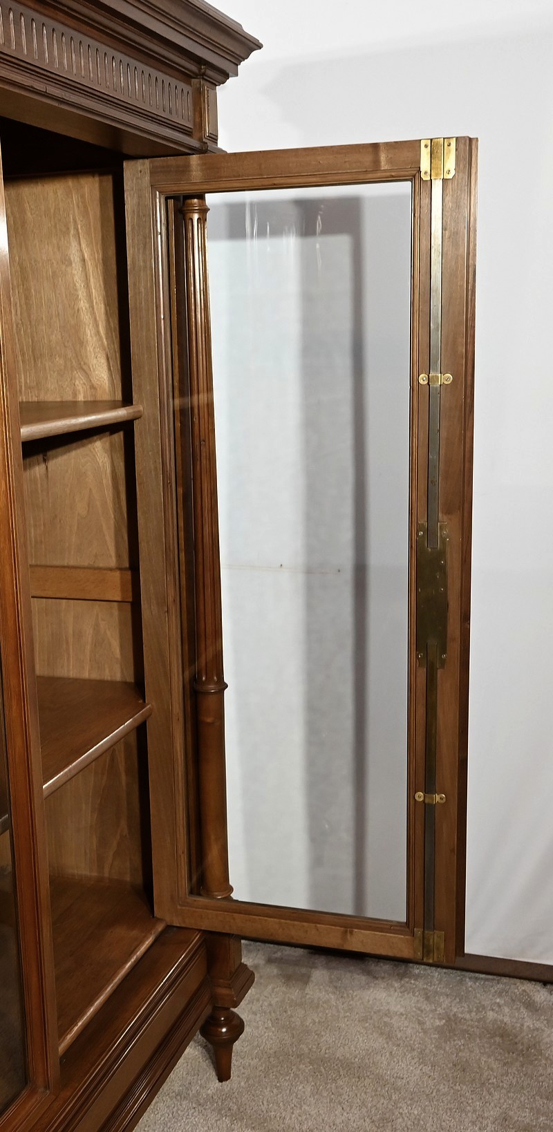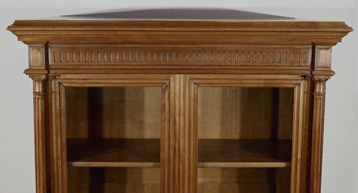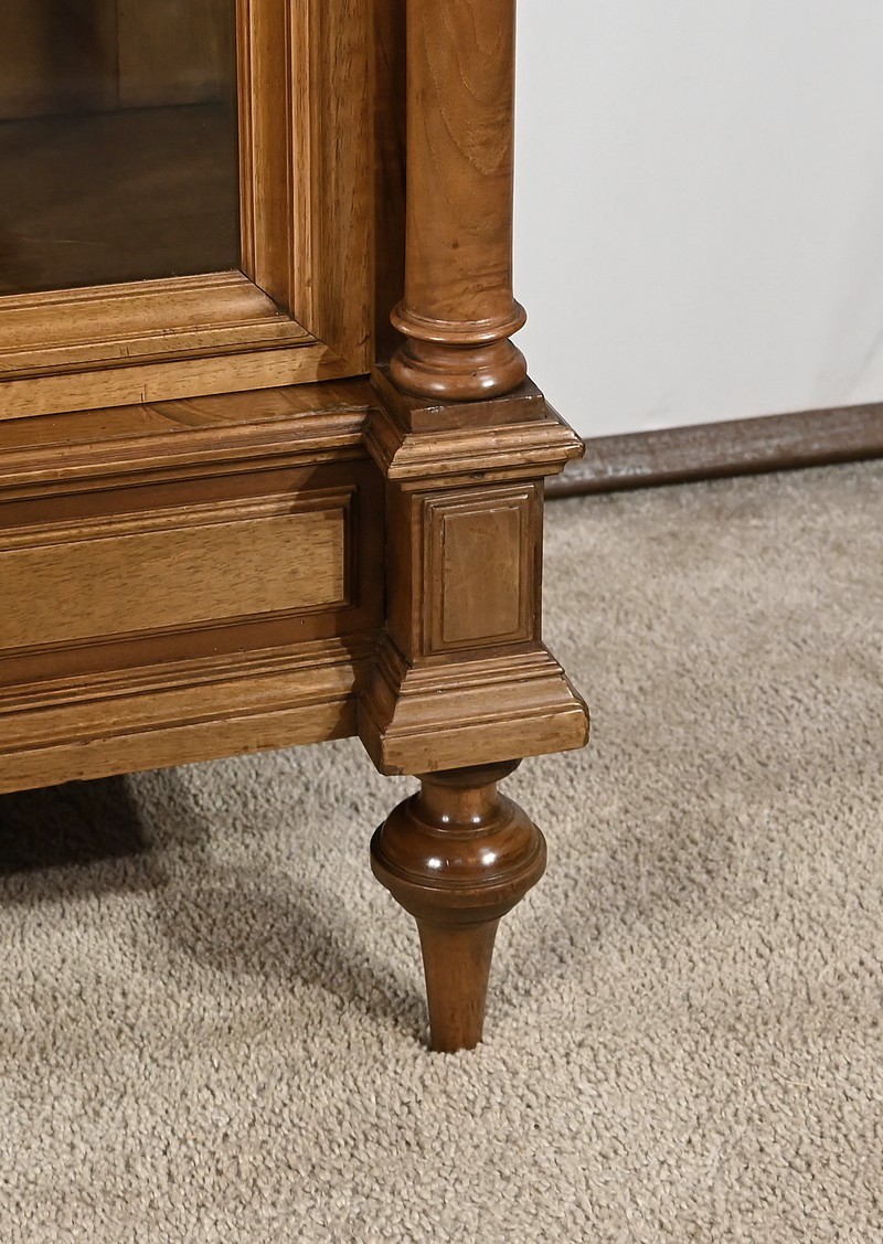 Belle vitrine de fabrication parisienne en noyer blond massif. Ce meuble à hauteur d’appui possède deux portes à cadre à coupe d’onglet avec moulure intérieure saillante et à gorge vers l’intérieur. Nous retrouvons une clé et une serrure d’origine en laiton. L’entrée filet souligne le passage de la clé.