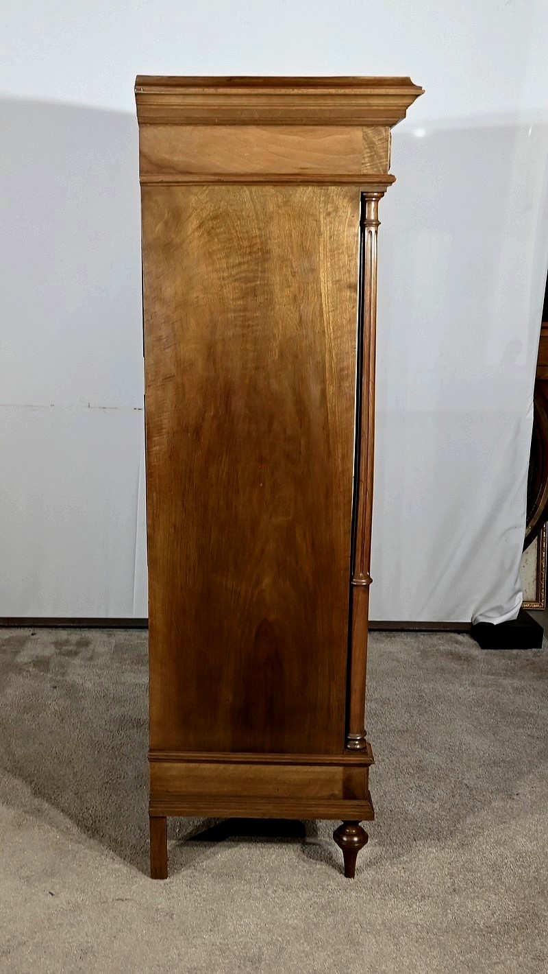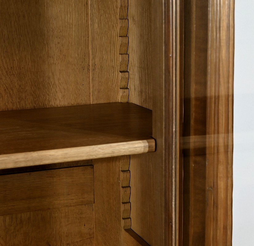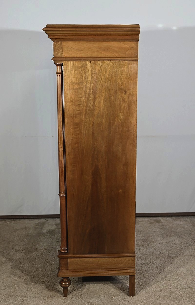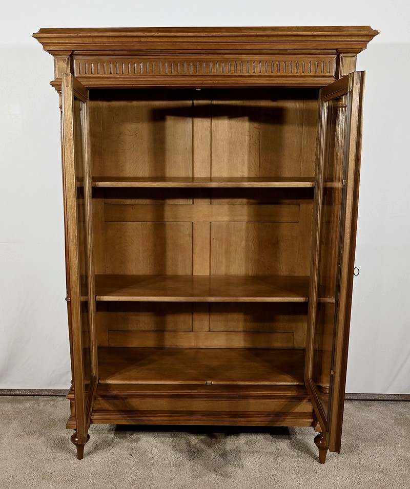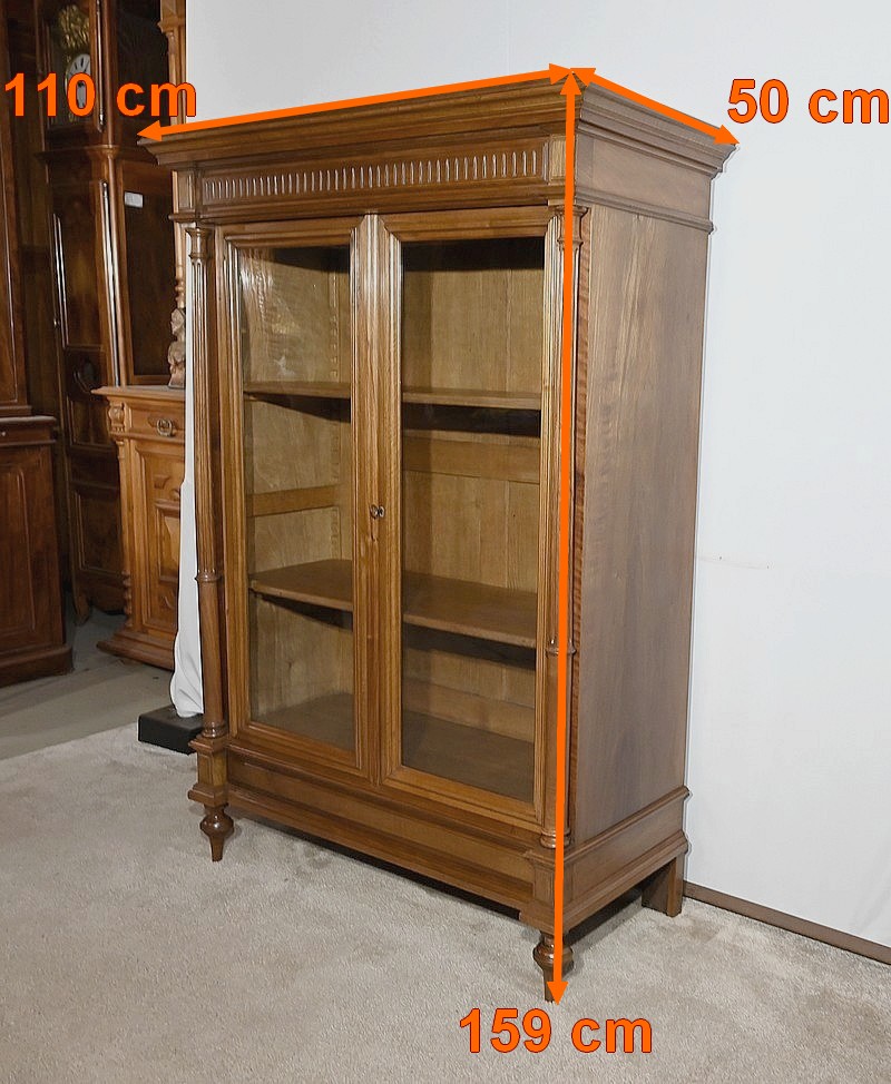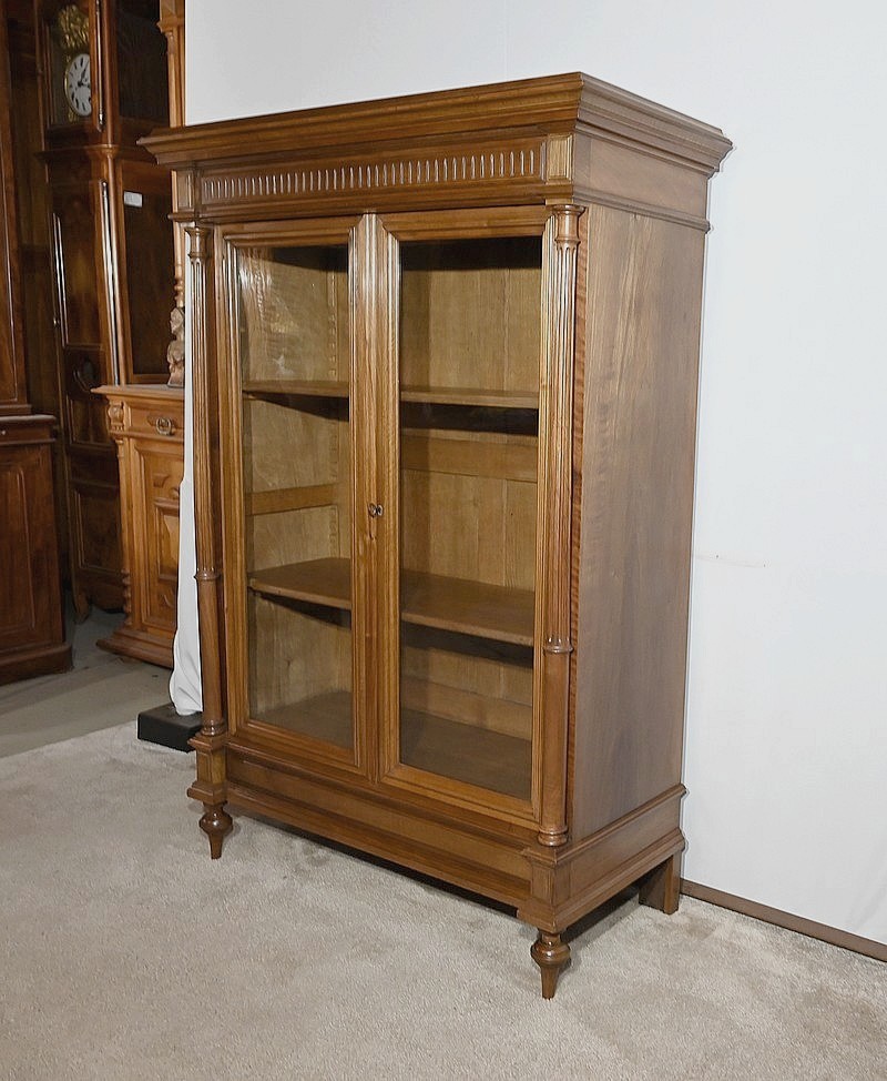 Belle vitrine de fabrication parisienne en noyer blond massif. Ce meuble à hauteur d’appui possède deux portes à cadre à coupe d’onglet avec moulure intérieure saillante et à gorge vers l’intérieur. Nous retrouvons une clé et une serrure d’origine en laiton. L’entrée filet souligne le passage de la clé.