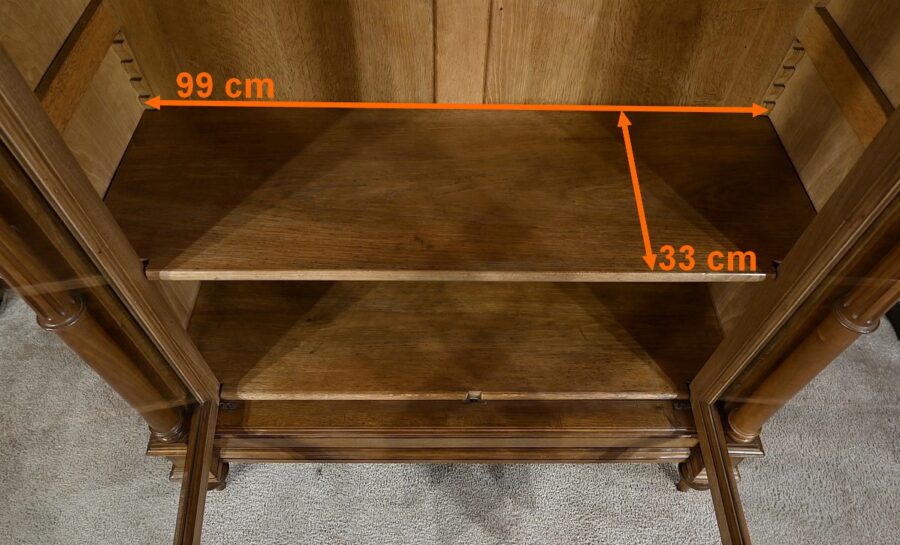 L’intérieur est composé de deux étagères en chêne réglables sur crémaillères.