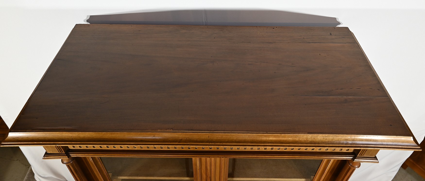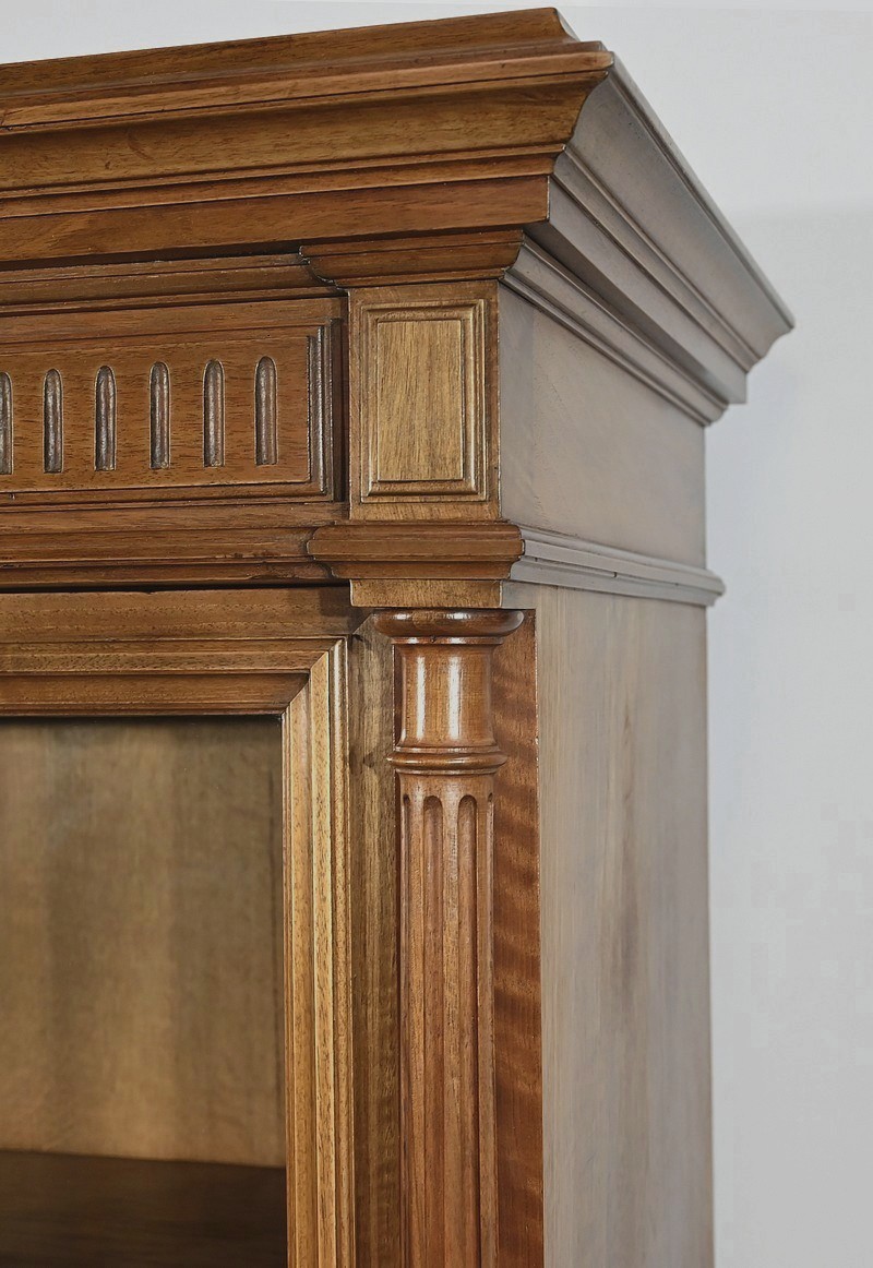 Cette vitrine est munie d’une partie haute travaillée à cannelures verticales et chapeautée d’une moulure double à gorge en dessous et au dessus.